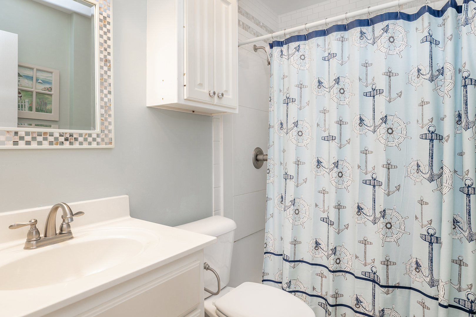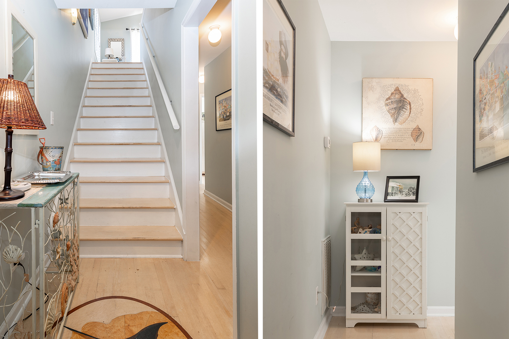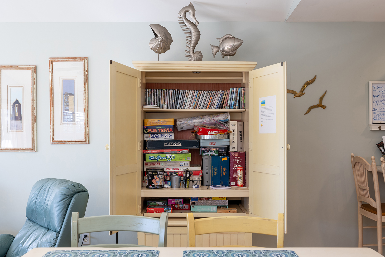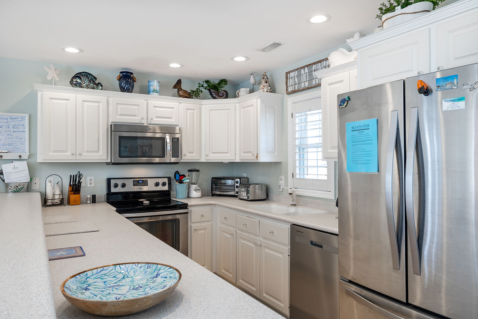 Prior guests have liked the reverse floor plan, where you enter the home in the foyer onto hardwood floors that feature an inlaid blue marlin fish. This leads to a bathroom in the hall with a shower and tub that is easily accessed by all 3 bedrooms with ceiling fans and storage. The first bedroom is beside the bathroom with twin beds and a wall-mounted flat-panel Smart TV. Then proceed down the hall to the 2nd bedroom with a queen bed, an armoire with a flat panel Smart TV, and access to the covered deck. At the end of the hall is a large primary suite with a king bed, ensuite bathroom with shower, wall-mounted flat panel Smart TV, and access to the covered deck (seating) with a staircase leading to the backyard.