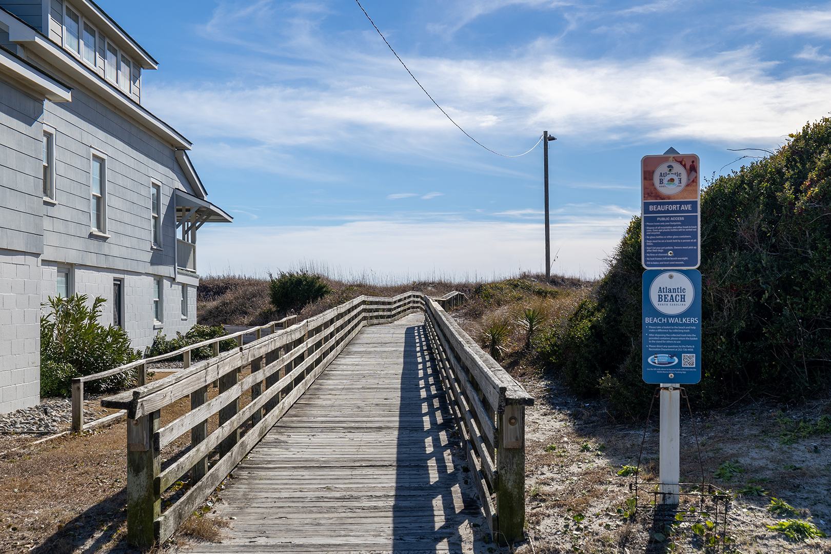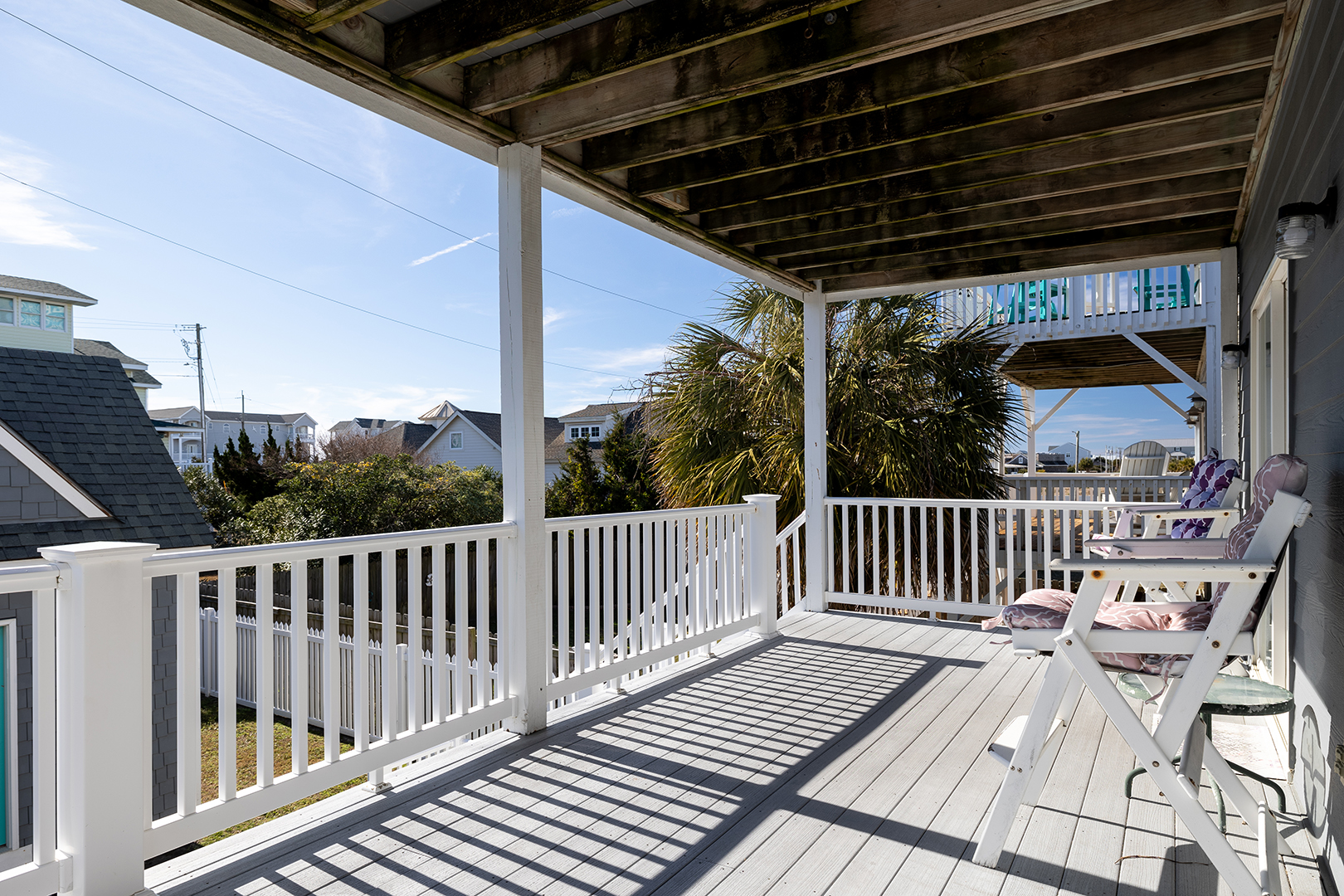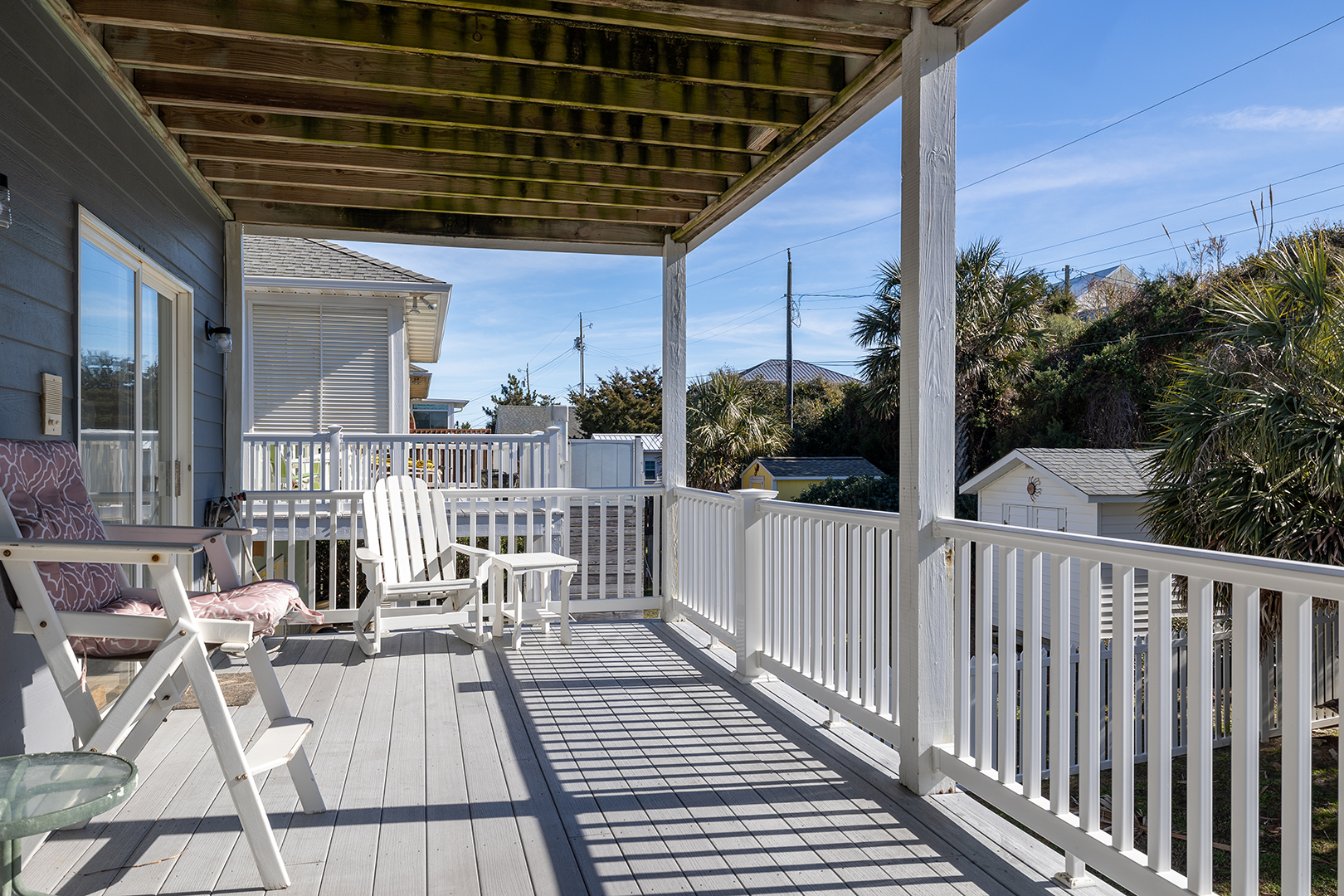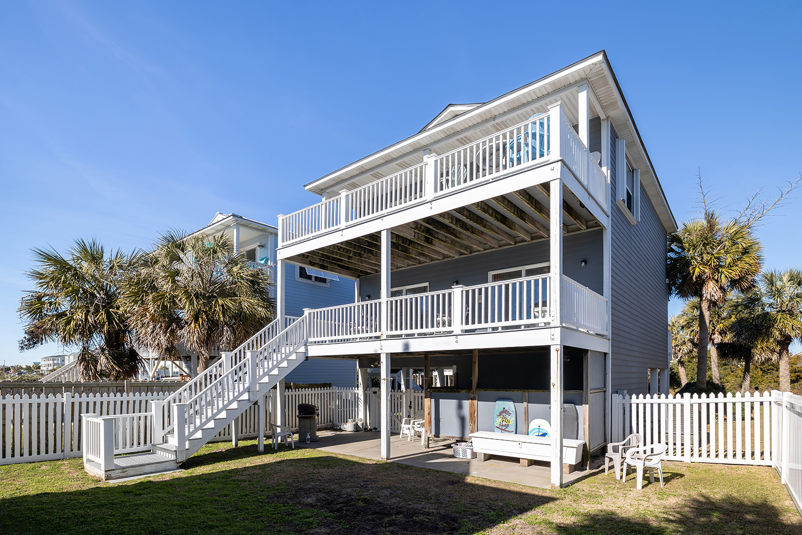Palm's Paradise is a 3rd row Oceanview home in beautiful Atlantic Beach that is full of light, color, and comfort. It is nicely furnished and enjoys a convenient location for walking to 2 beach accesses. You can choose a more neighborhood setting at the Beaufort Ave./E. Boardwalk Blvd access or The Circle Regional Beach Access with a boardwalk, bathrooms, outside showers, parking, lifeguards, picnic tables, shopping, and restaurants. Dog lovers can take their leashed dog to the beach, bring them back for a bath in the large hot/cold outside shower (dressing area and hose) then let them out in the fully fenced backyard to relax. A short drive takes you to the charming towns of Morehead City, Beaufort waterfront, and Fort Macon State Park. There is covered parking and a patio with furniture and a swing. A gas grill for cooking outside.