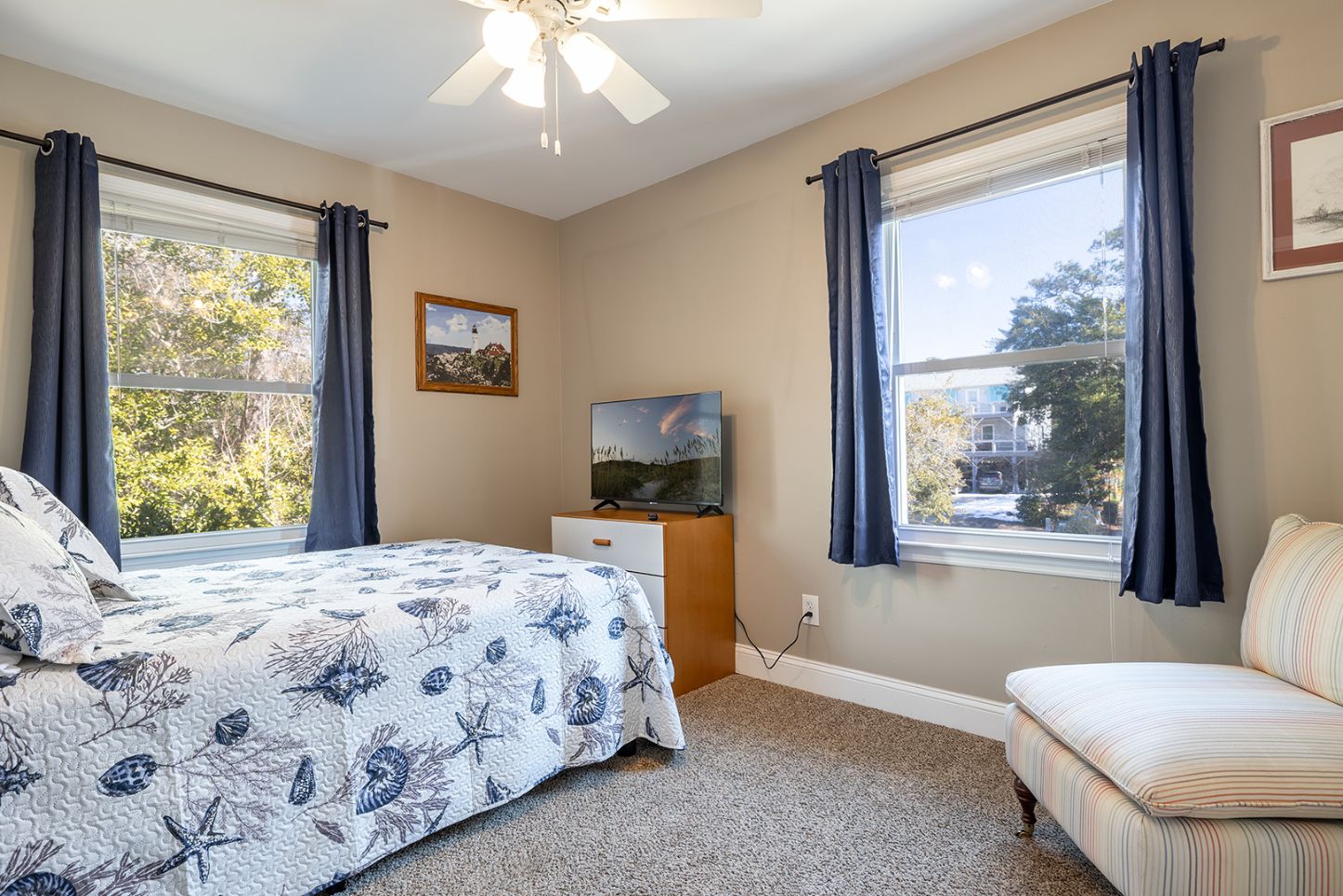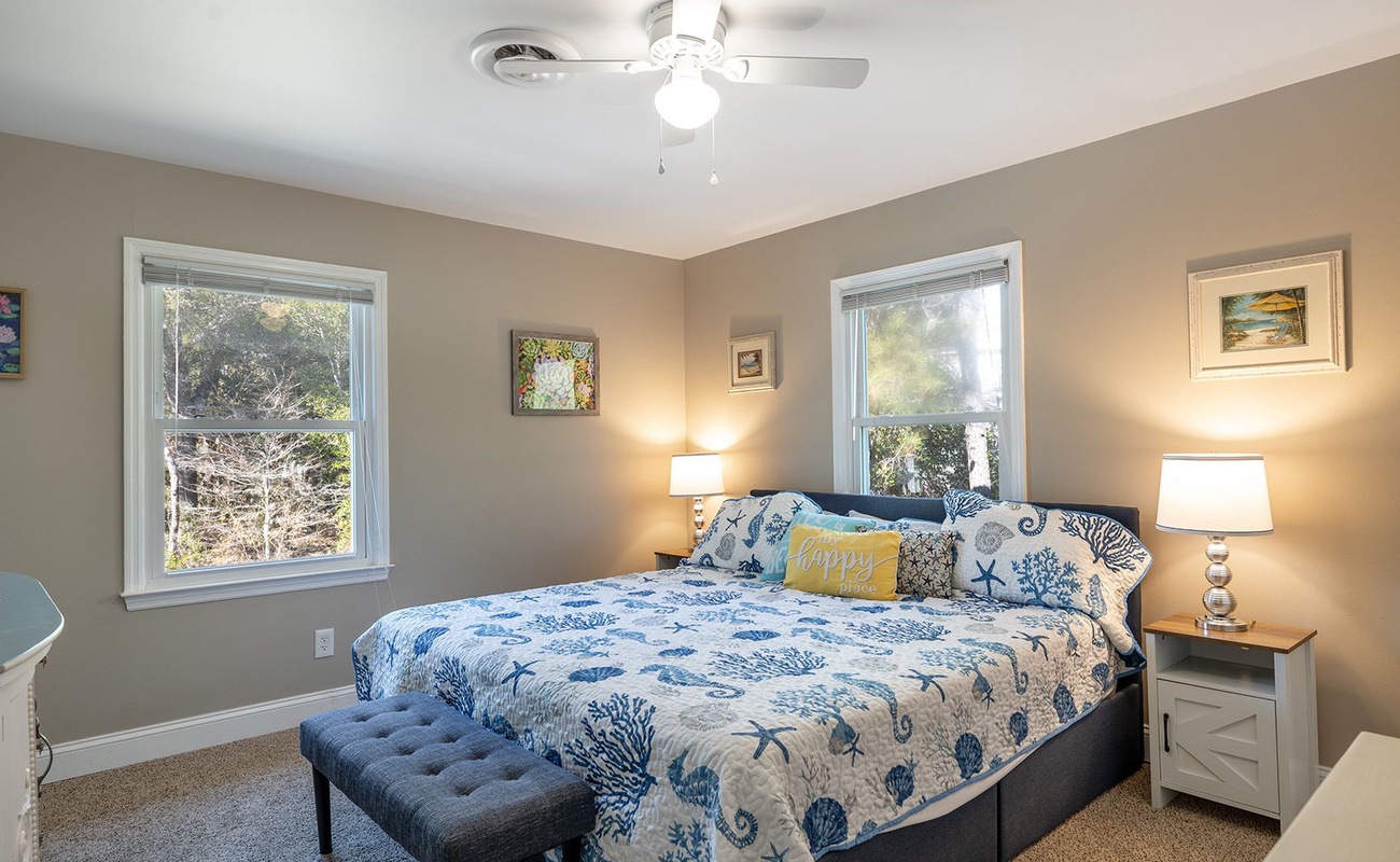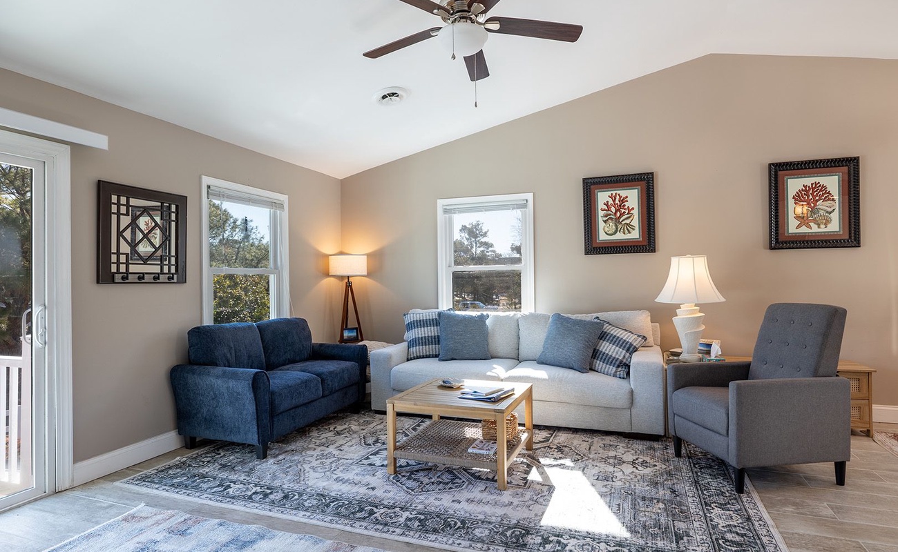 Step outside and let the coastal breeze do the rest. The front porch is furnished with rocking chairs - perfect for morning coffee, afternoon reading, or sunset chats! The back deck invites you to soak in the sea air, while the enclosed yard provides a wonderful space for family fun, including your four-legged friends!