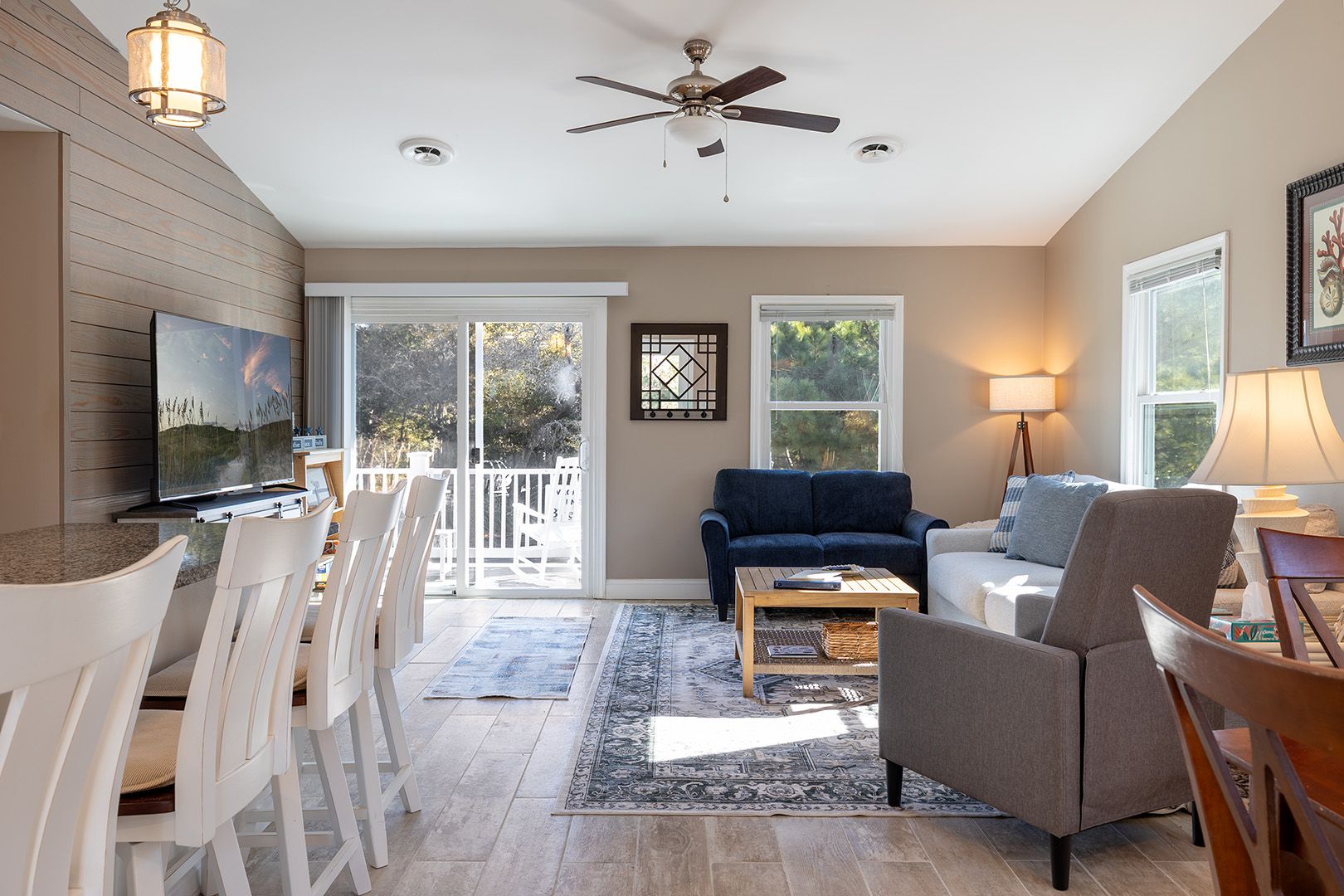 At the heart of the home, you’ll find a warm and inviting great room that seamlessly blends the living, dining, and kitchen areas into one comfortable gathering space. Designed with connection in mind, this central hub is perfect for movie nights on the Smart TV, catching up on your favorite shows, or simply enjoying each other’s company. High-speed wireless internet keeps you as connected as you’d like to be, but if unplugging is your vacation goal, there’s plenty of space to do that too. The dining area offers the ideal backdrop for card games, puzzles, and lingering conversations long after dinner ends.