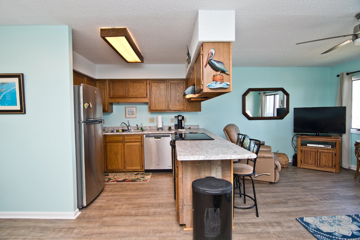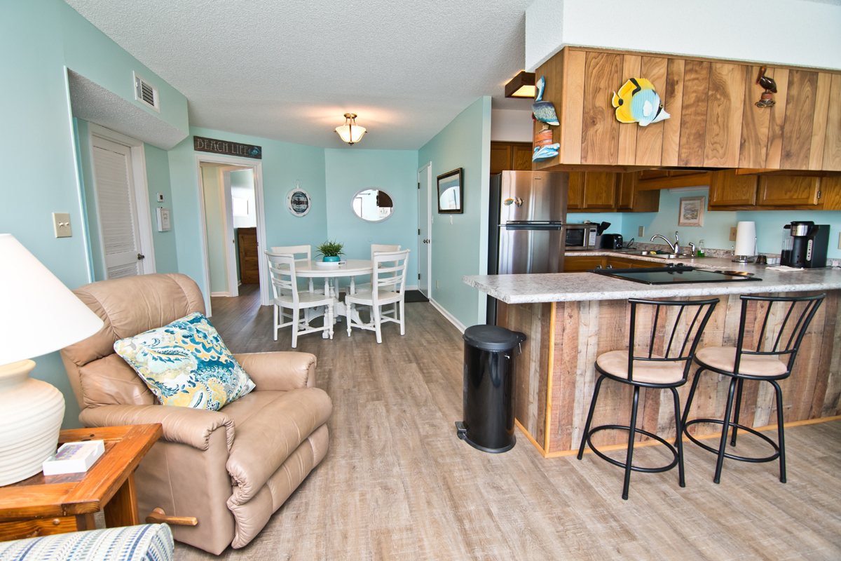 Enjoy a lazy afternoon, lounging on the oceanfront deck and taking in the salty air. Living area has a Flat Screen TV, Leather Recliner and direct access to the covered deck that overlooks the pool and ocean! Dining area. Wet bar. Kitchen/Bar area with microwave & dishwasher.