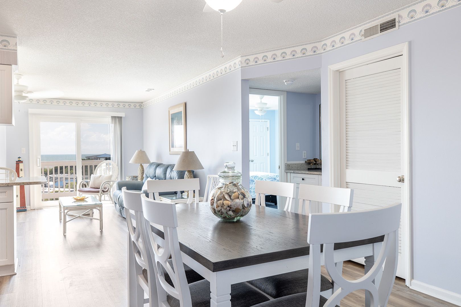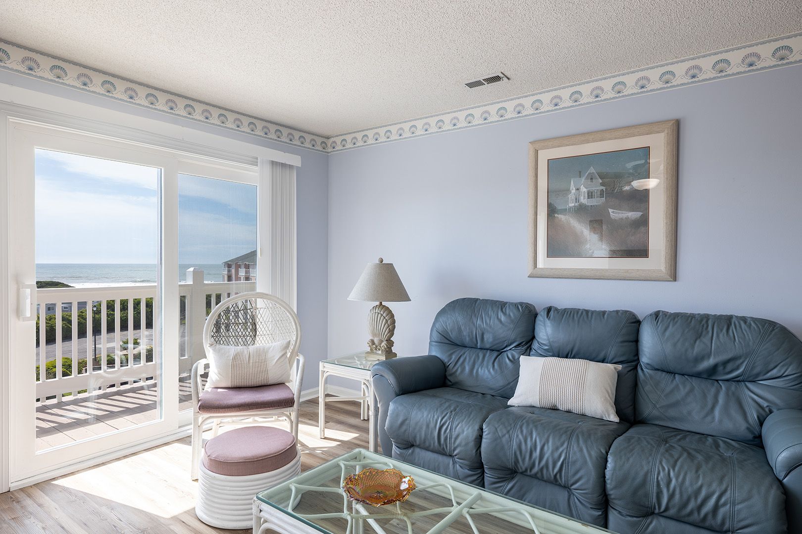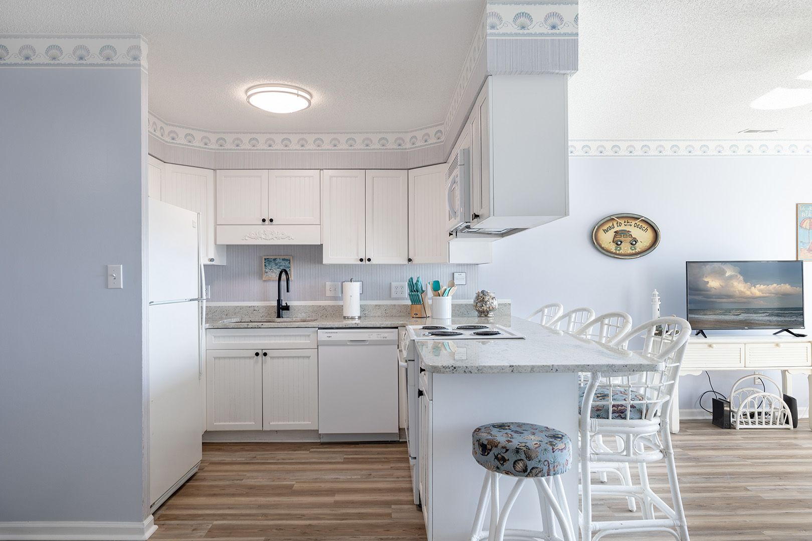 Living Area featuring gorgeous Atlantic Ocean views and a Smart TV with access to streaming apps and basic cable for your entertainment! Fully Equipped Kitchen with Coffee Maker, Stove/Oven, Refrigerator with Attached Ice Maker, Dishwasher, Microwave, Waffle Maker, Toaster, Slow Cooker, Blender, Griddle. Enjoy making your favorite beverages with the convenient Wet Bar. Enjoy those ocean views and seaside breezes on the Private Balcony with Furniture.