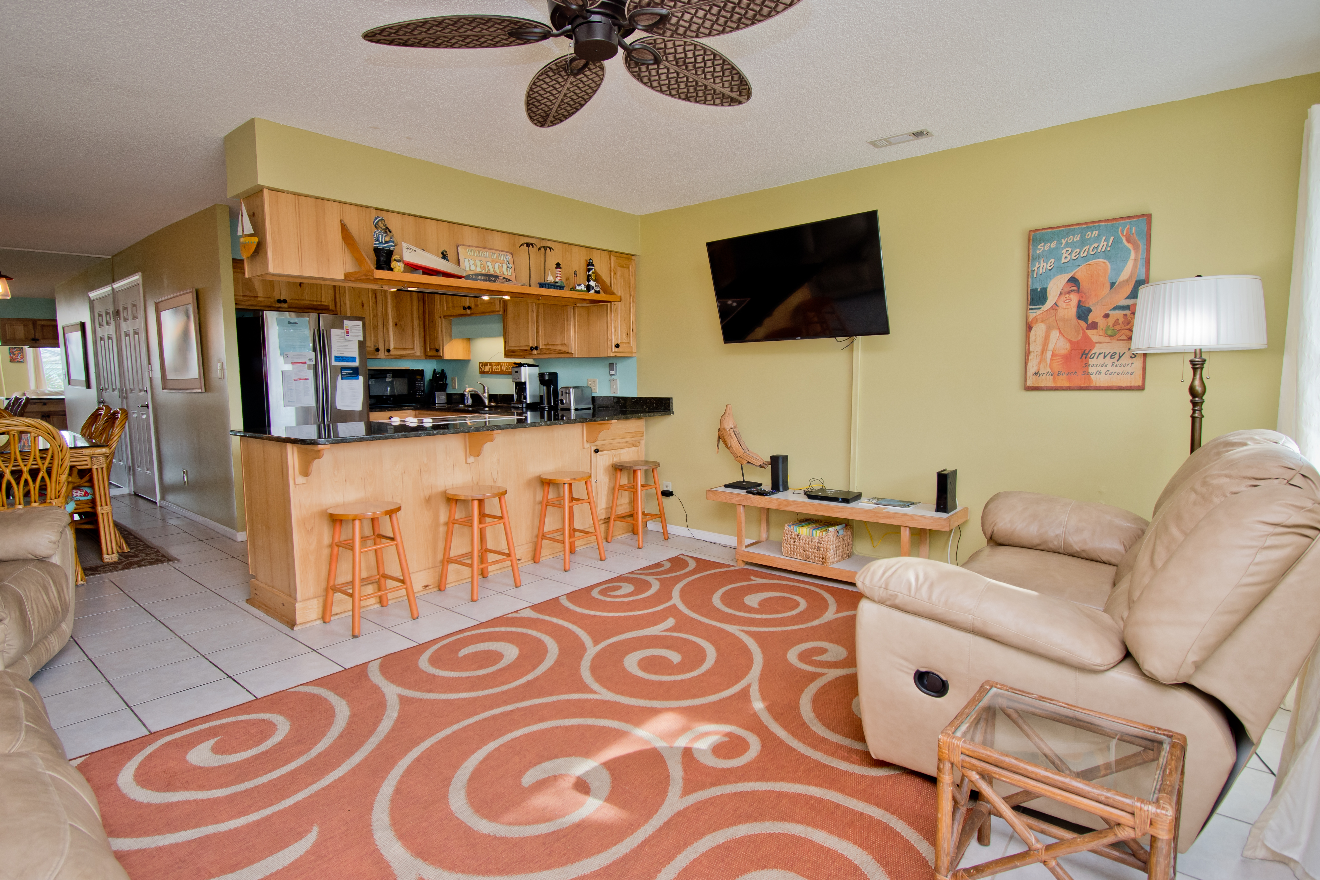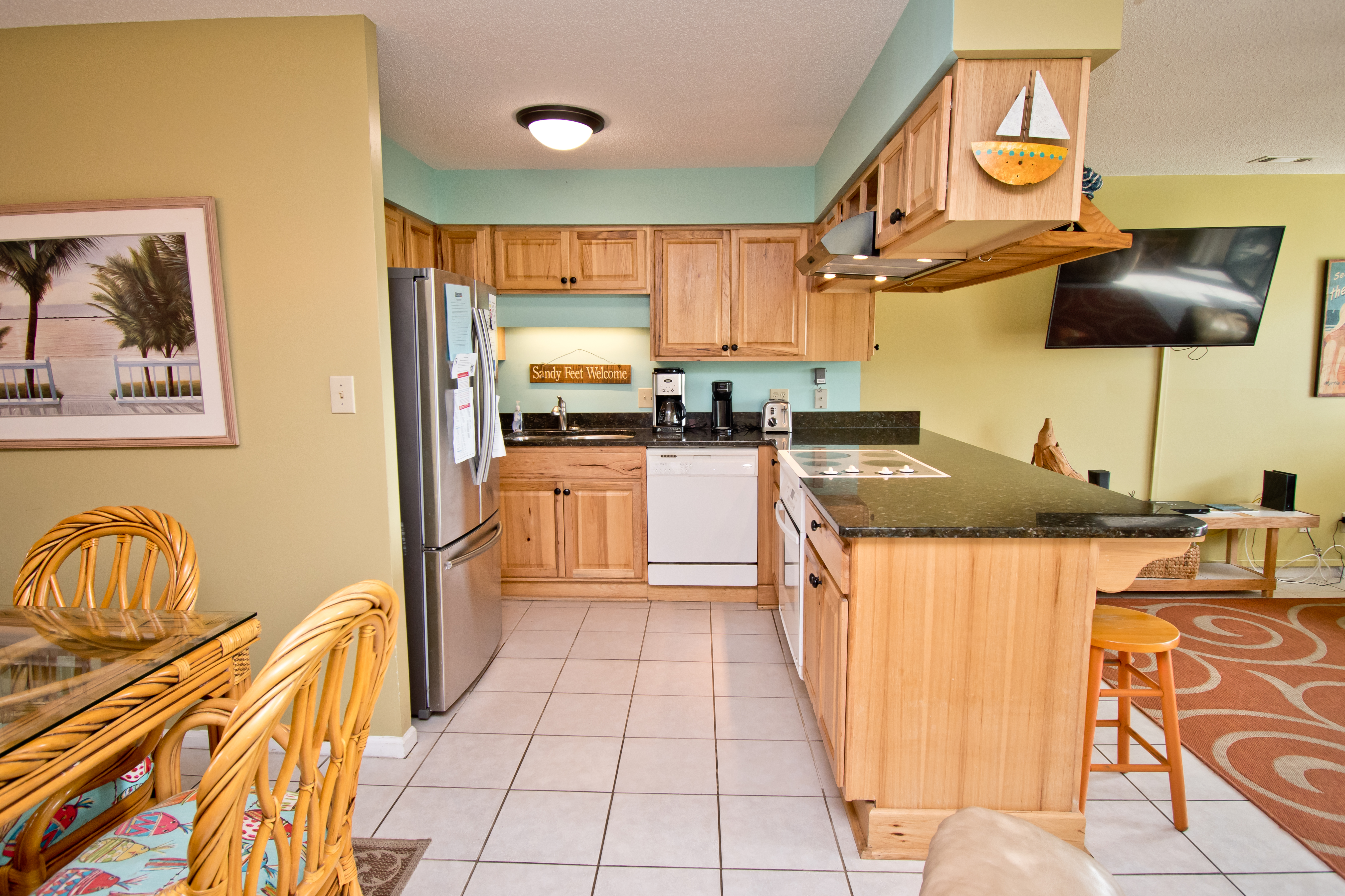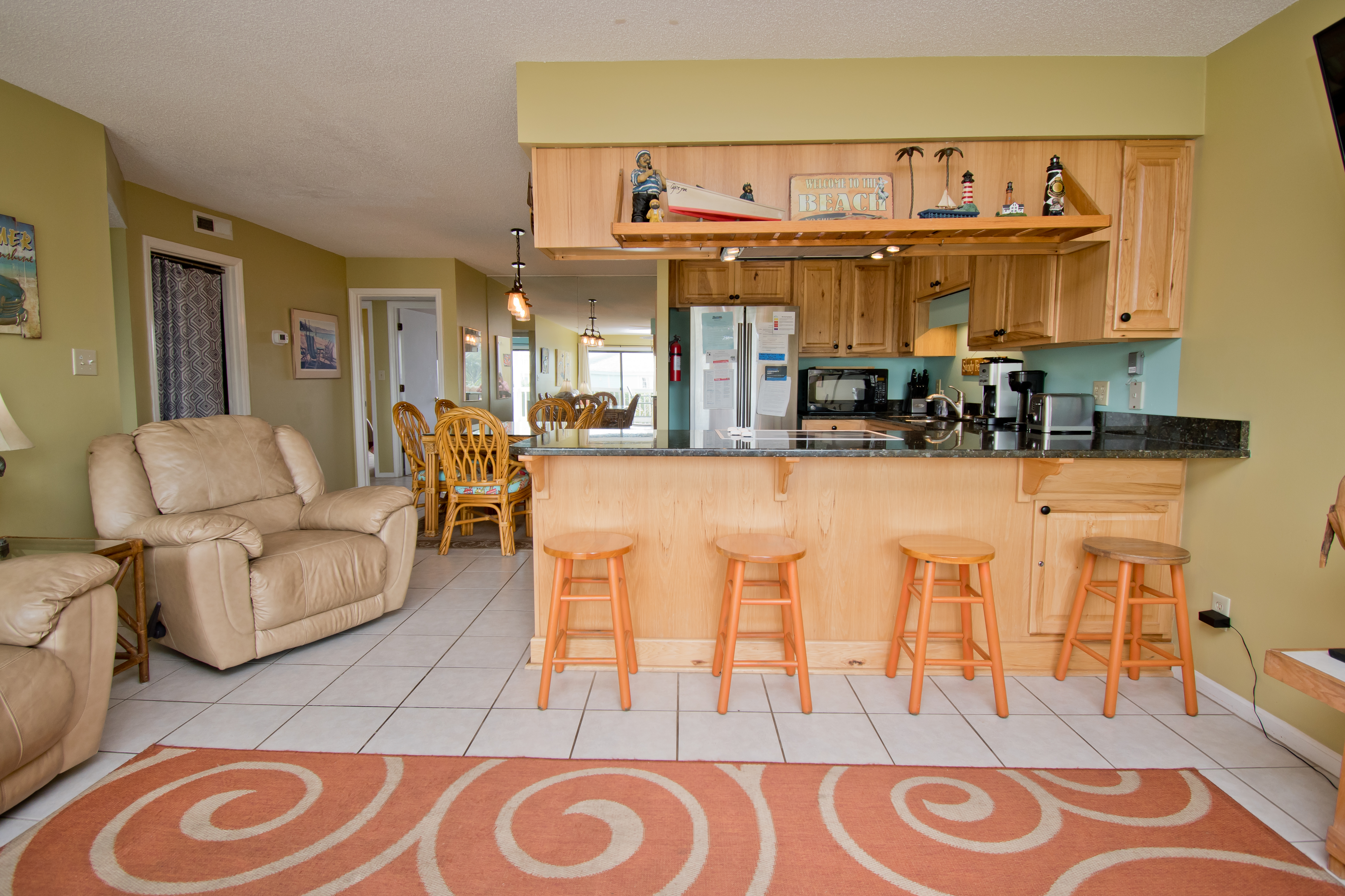 Being on the First Floor makes this condo easily accessible! The Living Area has a covered oceanfront balcony with outdoor furniture. Dining Area. Wet Bar. Kitchen with marble countertops, microwave and dishwasher.