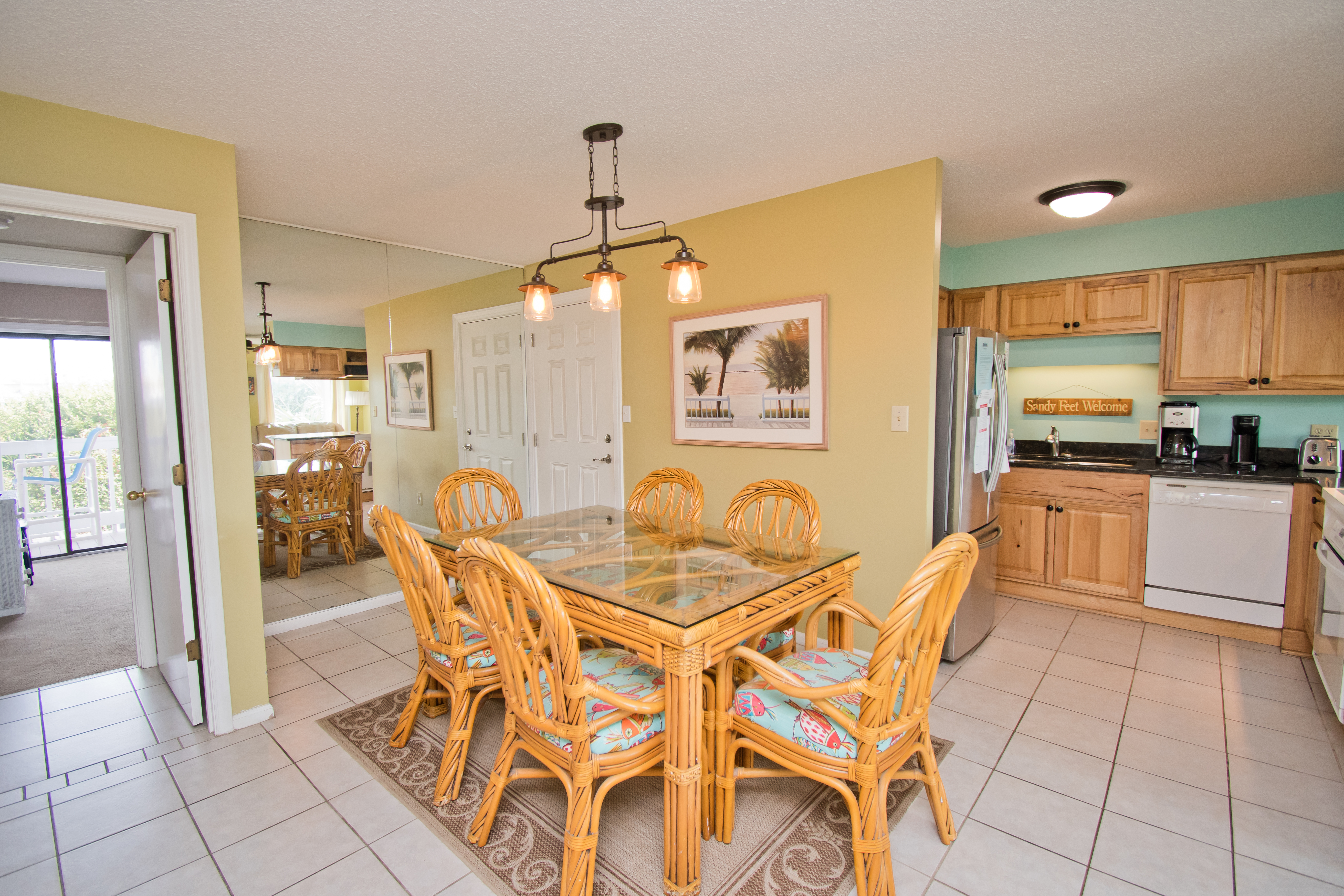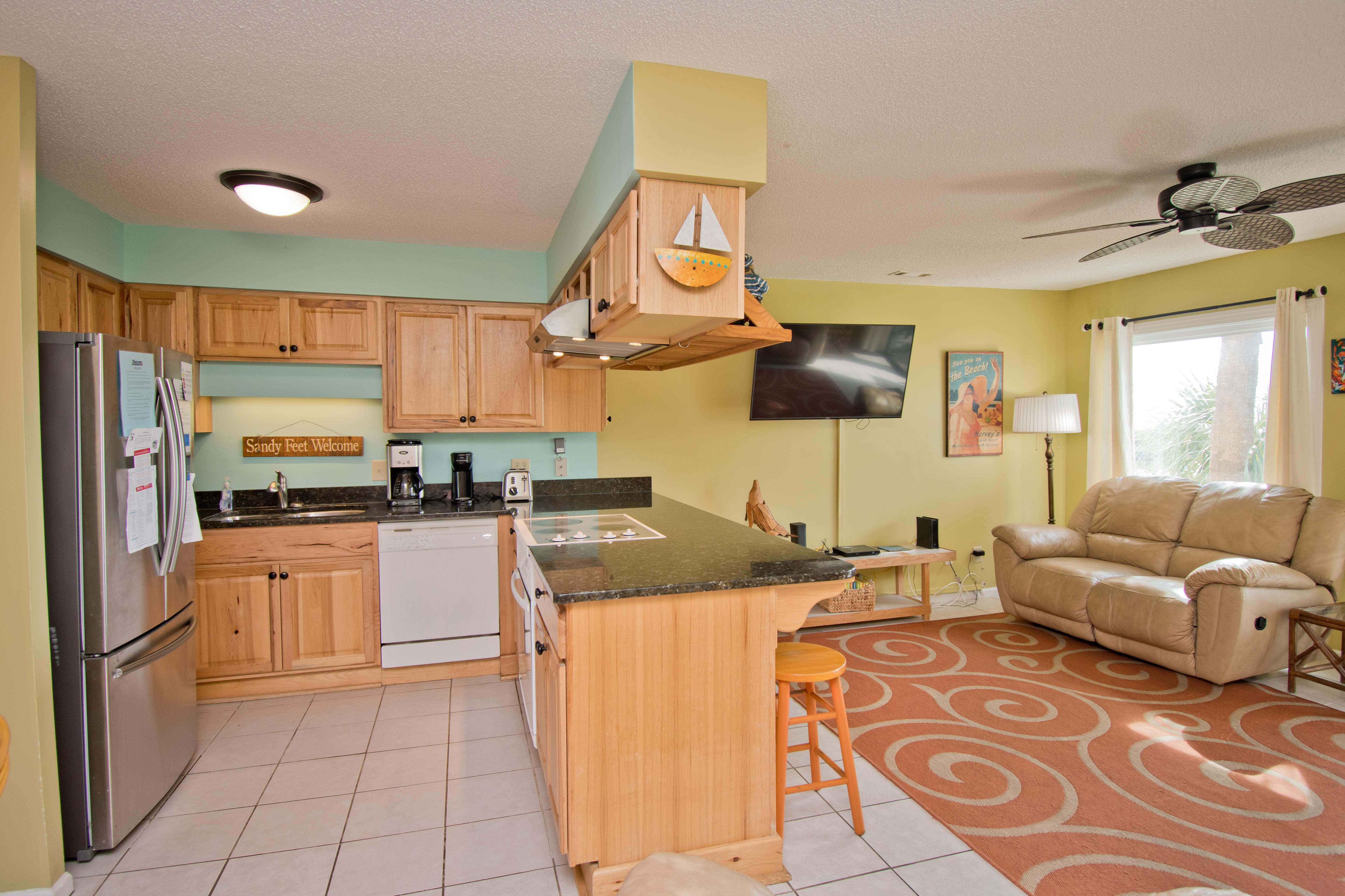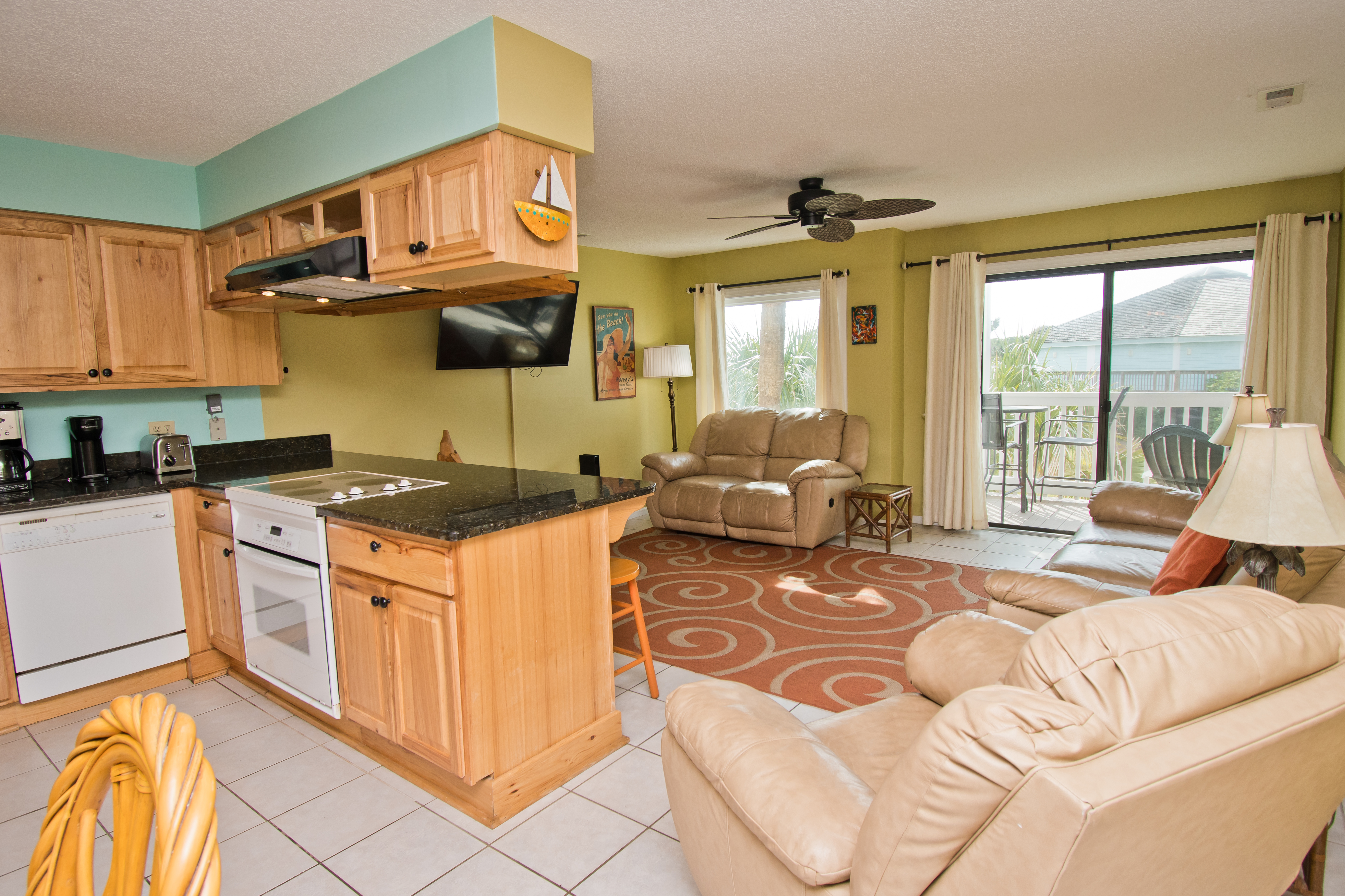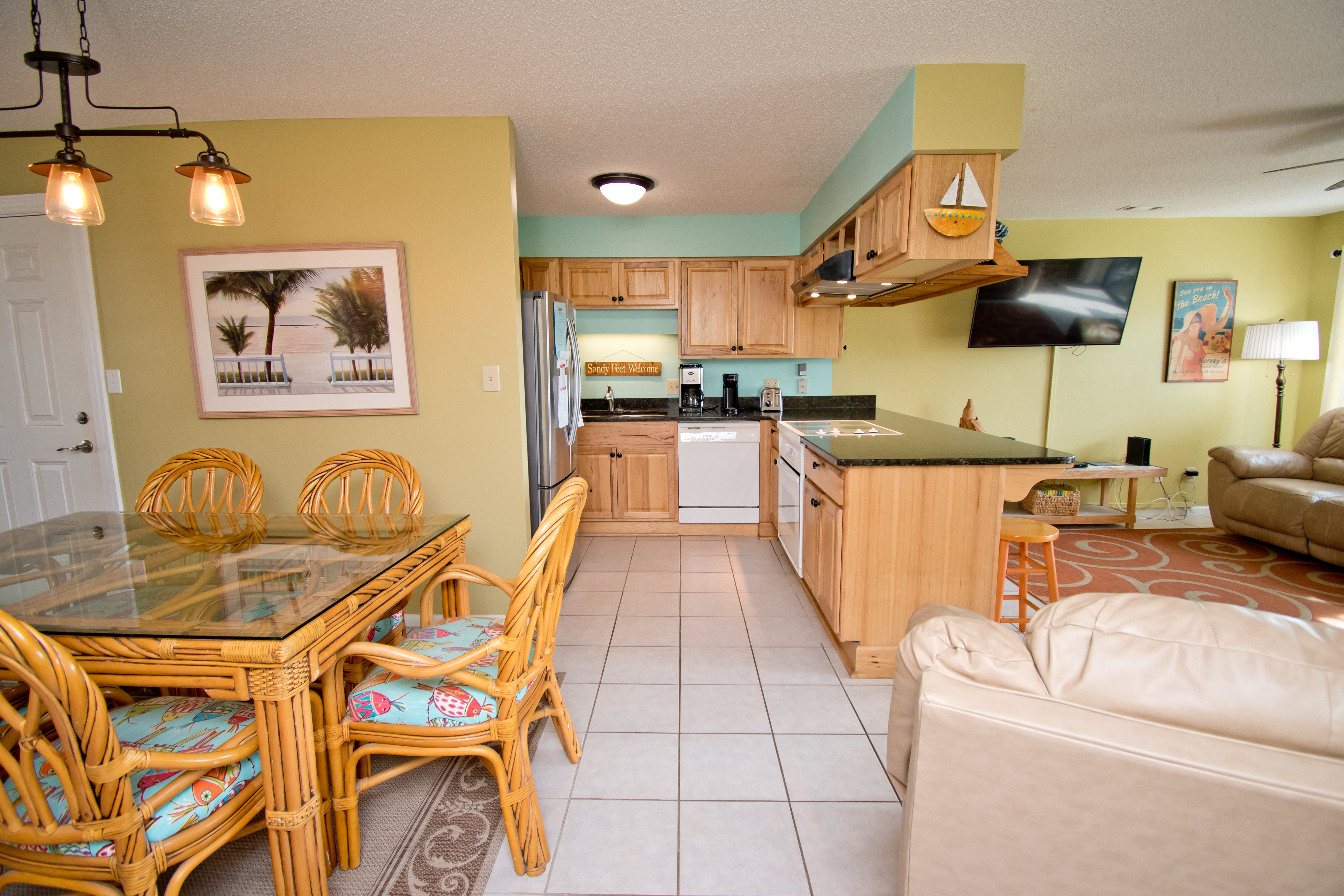 Being on the First Floor makes this condo easily accessible! The Living Area has a covered oceanfront balcony with outdoor furniture. Dining Area. Wet Bar. Kitchen with marble countertops, microwave and dishwasher.
