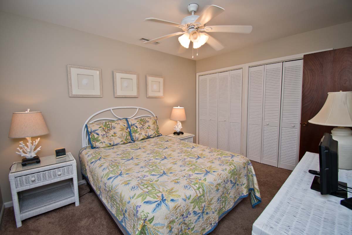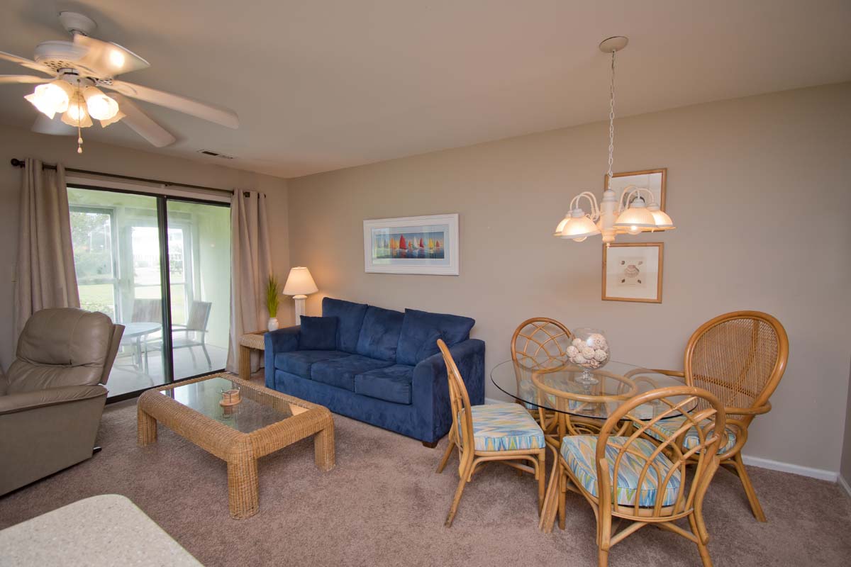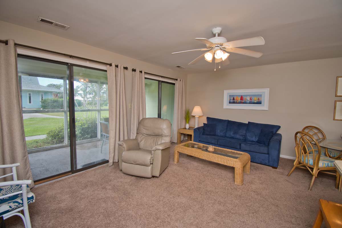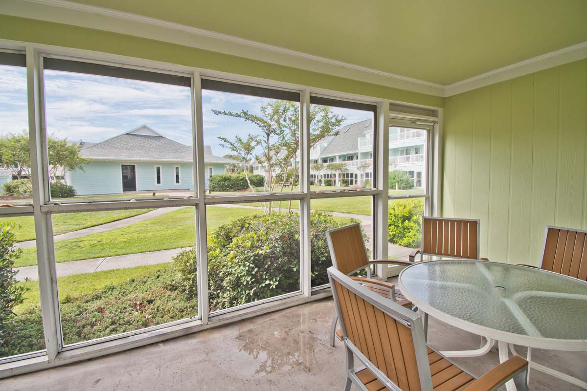 Enjoy the convenience of No Steps at this First Floor unit! The Living Area has a Queen Sleeper Sofa. Screened in porch with furniture faces the clubhouse. Dining Area. Kitchen/Bar has a microwave & dishwasher. Bedroom has a Queen Bed. Full Bath and Half Bath are in the Hallway. Central Heat & Air. Stackable Washer/Dryer. Wireless internet is available. Direct access to the courtyard amenities including pool, grill area, and picnic area from the screened in porch!