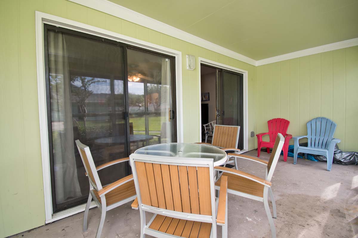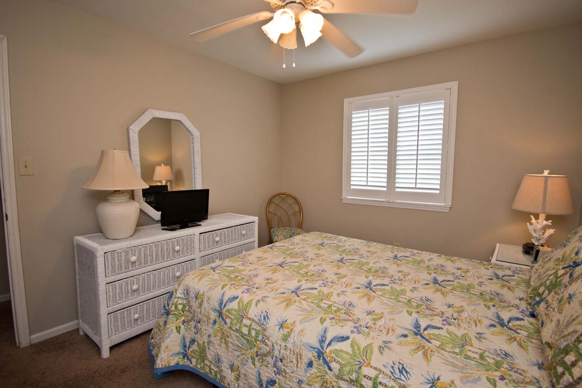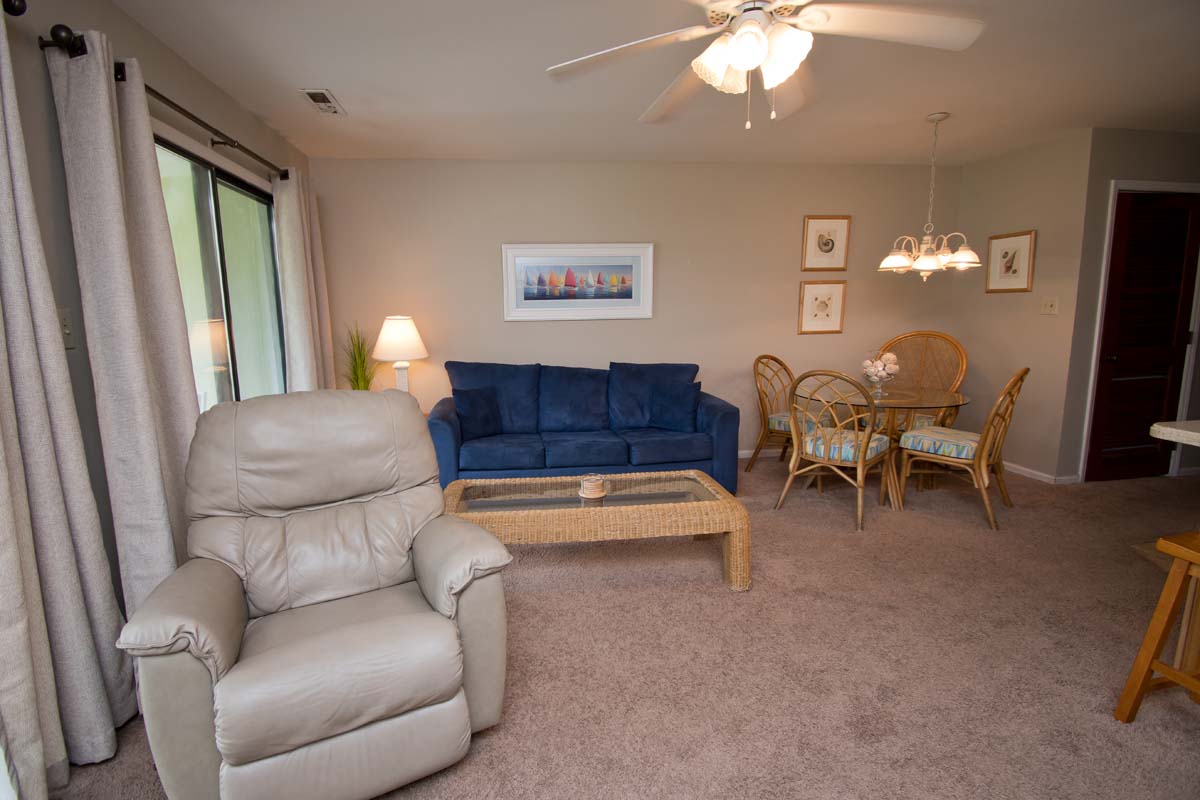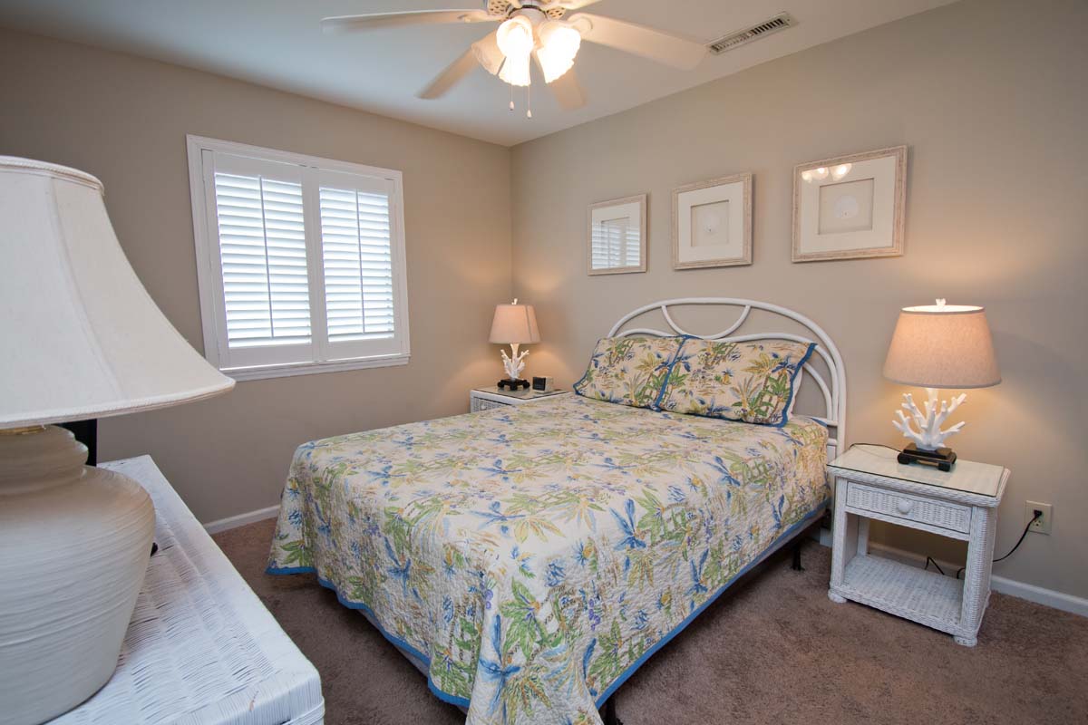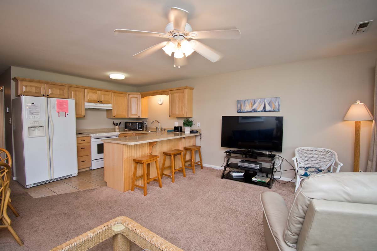 Enjoy the convenience of No Steps at this First Floor unit! The Living Area has a Queen Sleeper Sofa. Screened in porch with furniture faces the clubhouse. Dining Area. Kitchen/Bar has a microwave & dishwasher. Bedroom has a Queen Bed. Full Bath and Half Bath are in the Hallway. Central Heat & Air. Stackable Washer/Dryer. Wireless internet is available. Direct access to the courtyard amenities including pool, grill area, and picnic area from the screened in porch!