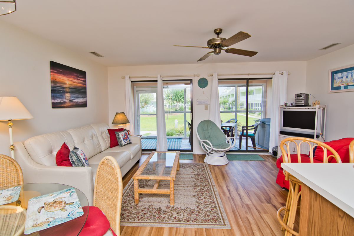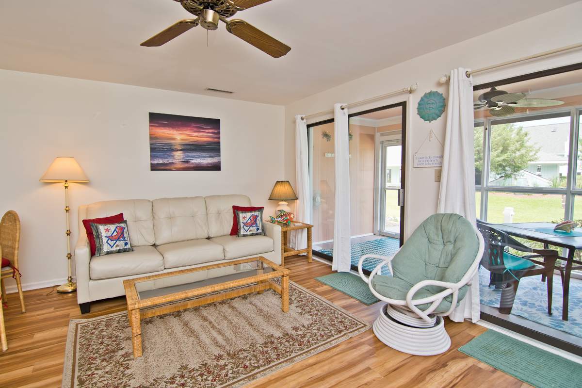 Enjoy the convenience of No Steps at this unit! The Living Area has a Queen Sleeper Sofa that sleeps comfortably (linens are not provided but can added for an additional fee). Screened in porch with 1 Table & 4 Chairs is just off the living area. Dining Area. The well-stocked Kitchen/Bar has a microwave & dishwasher. Bedroom has a comfortable Queen Bed. Full Bath. Central HVAC. Stackable Washer/Dryer.