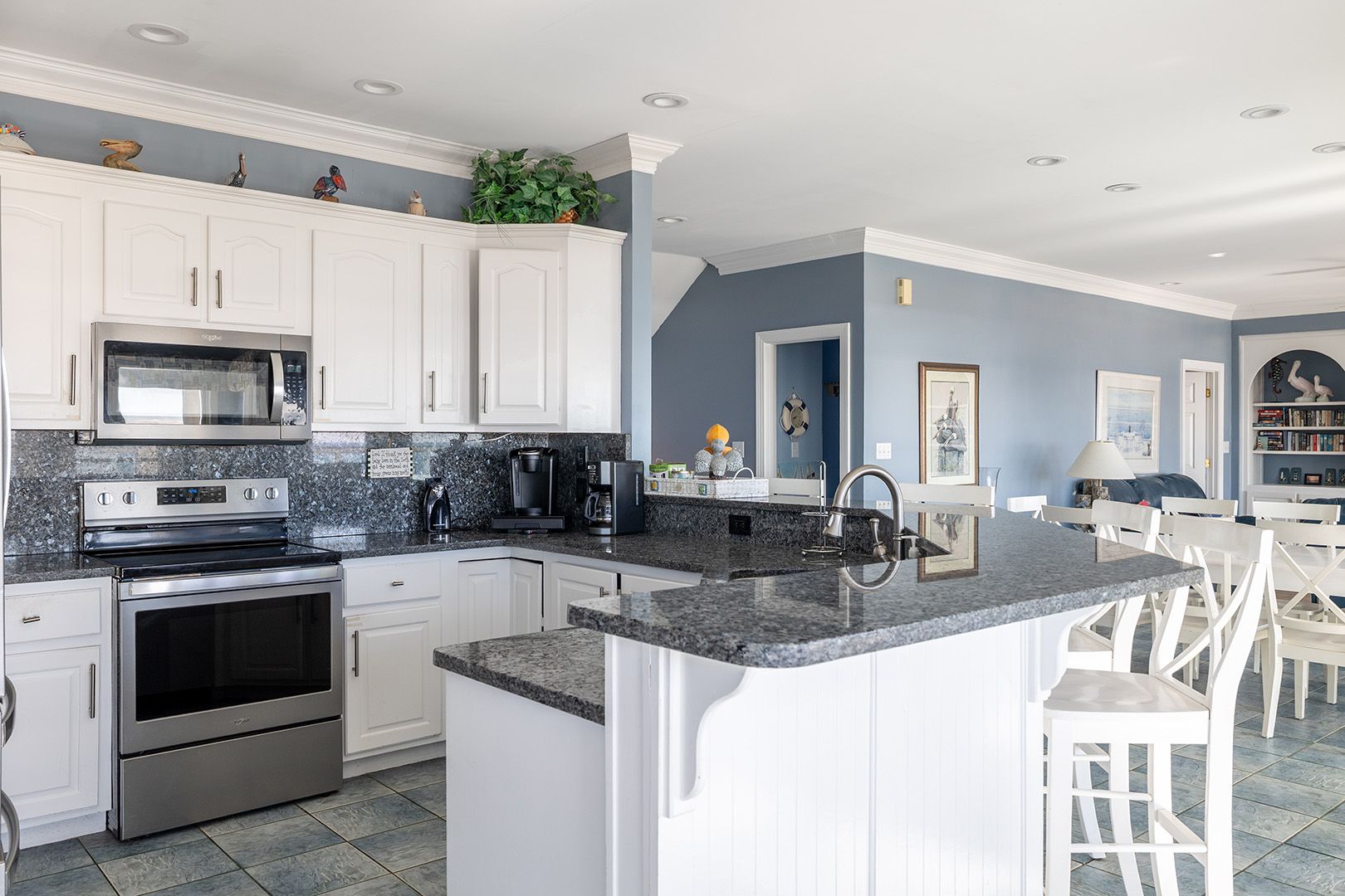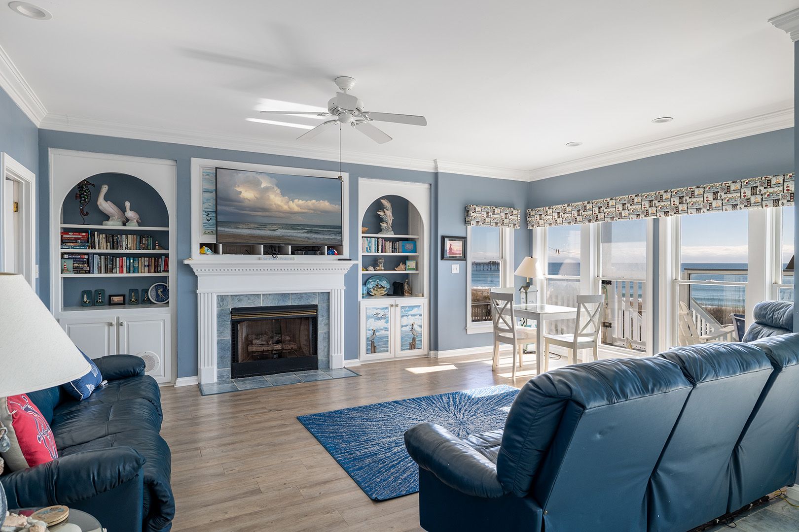 Level One: Great Room with Fireplace with built-in book cases and 42" LED TV with DVR. Windows across entire front of house! Large Dining Area. Kitchen/Bar area with microwave, dishwasher and 50 lb. icemaker! Breakfast Nook. Streetside Bedroom #1 with Queen and 32" Flat Screen TV. Streetside Bedroom #2 with 2 Twins & 32" Flat Screen TV. Full Bath.