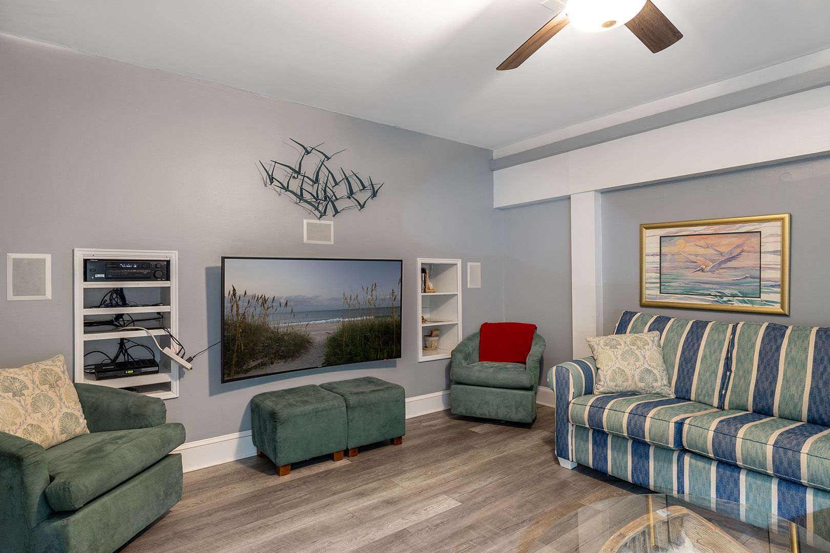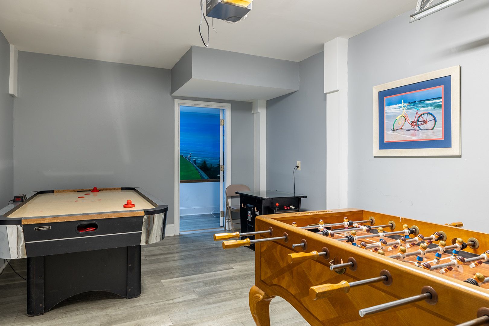 Ground Level: Colorful and Fun Game Room has a Pool Table, Ping Pong Table, mini-fridge, half bath, a Color Cable TV and direct beach and pool access! The Arcade Room has a Foosball Table, an Air Hockey Table, a 60 game Arcade Game Table, a mini-fridge, and special storage for Golf Clubs. Home Theater Room with 57" wide-screen HDTV with Surround Sound. Private office with fax machine, High-Speed Wireless Internet access included! (no computer), and a printer/scanner/copier. Enclosed Hot and Cold Outdoor Shower. Lighted fish cleaning station and a lighted gas grill.
