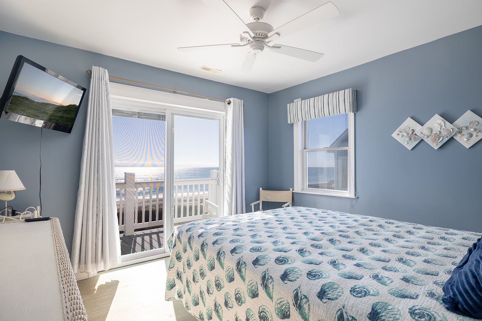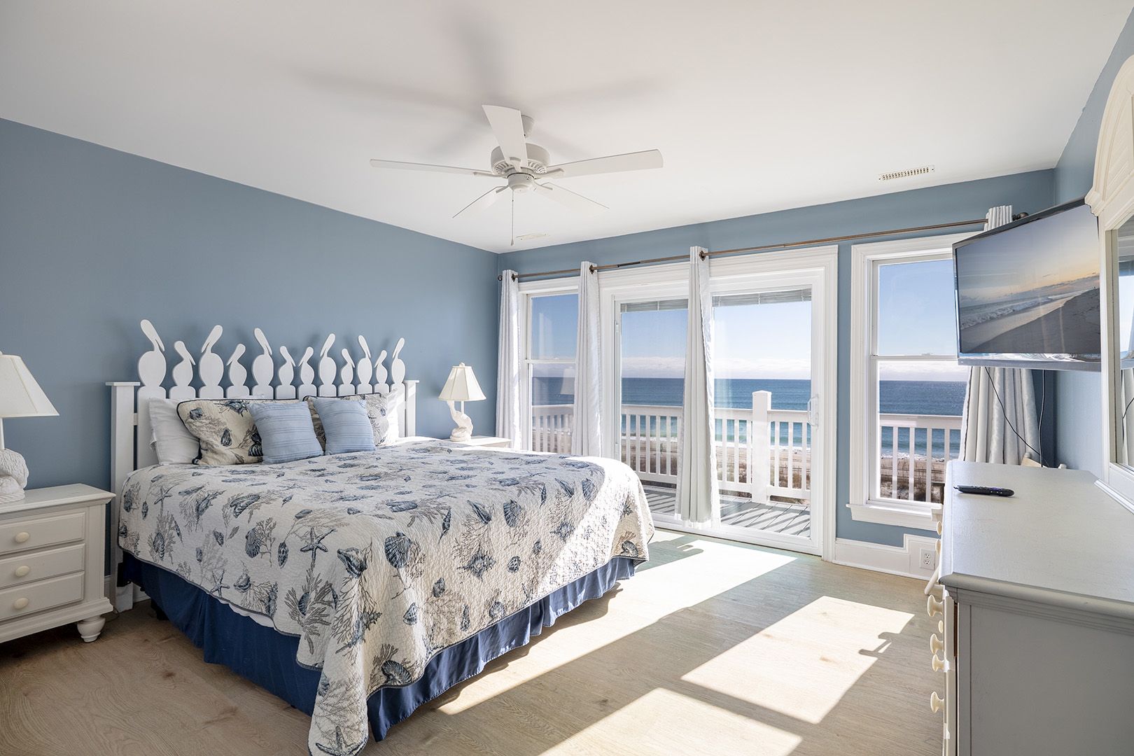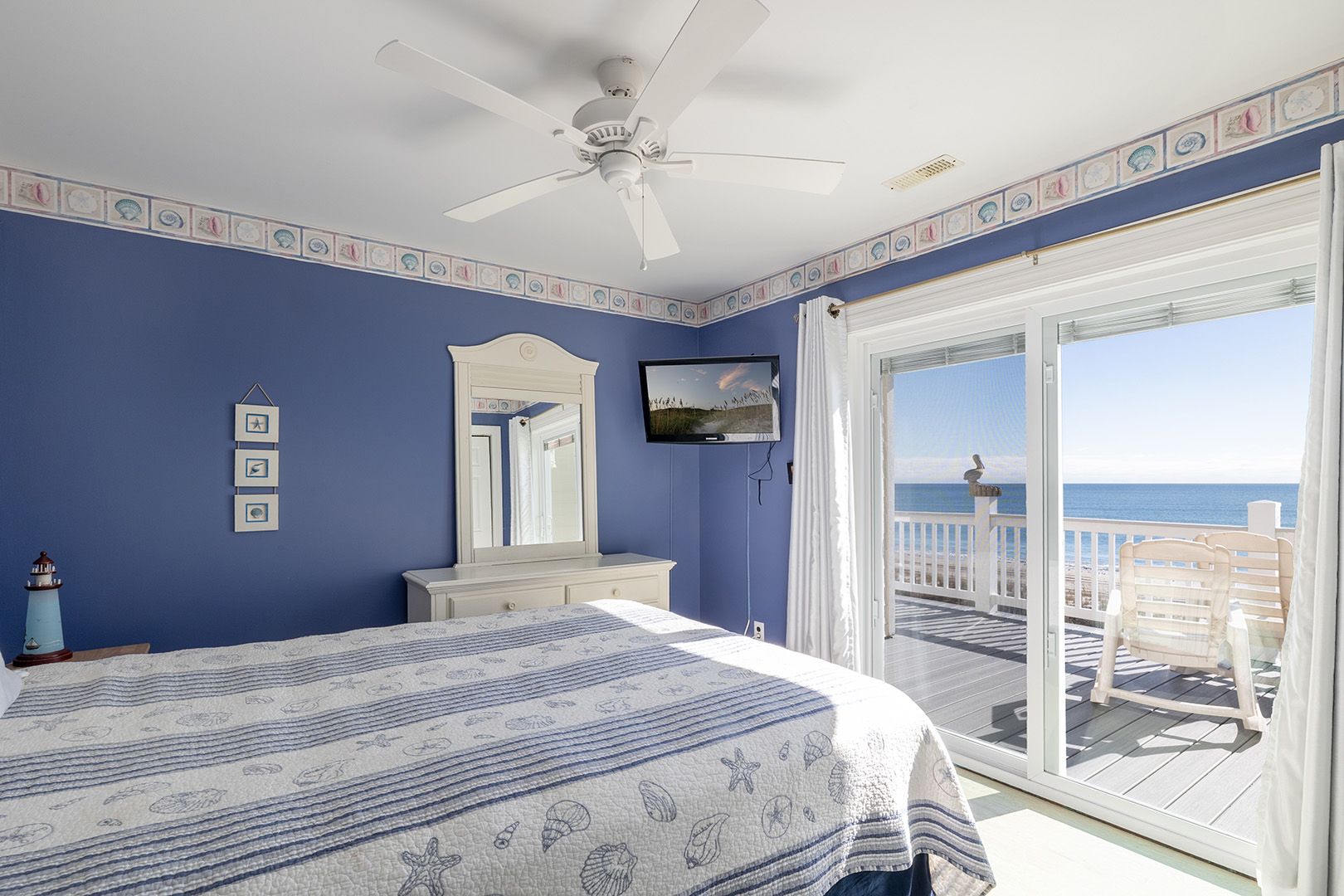 Level Two: Oceanfront Master Bedroom #3 with "Select Comfort" King Air Bed, 32" Flat Screen TV, whirlpool bath and open deck. Oceanfront Master Bedroom #4 with Queen Bed, 32" Flat Screen TV, whirlpool bath & open deck. Oceanfront Bedroom #5 with Queen, 32" Flat Screen TV and open deck. Streetside Bedroom #6 with 1 Double/Twin Bunk Bed with Twin Trundle Bed (in same room) with a 32" Flat Screen TV. Shared Bath.
