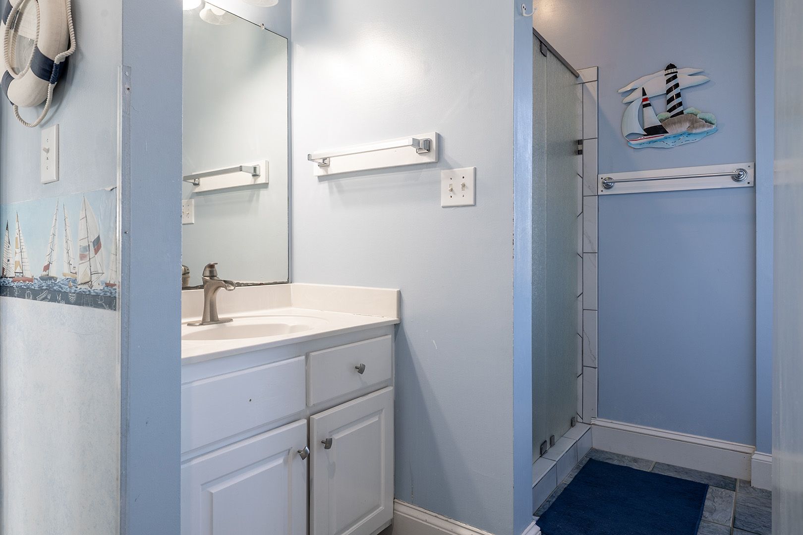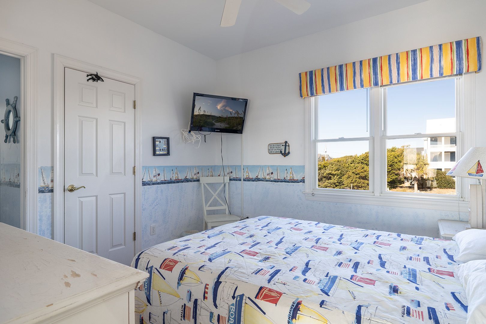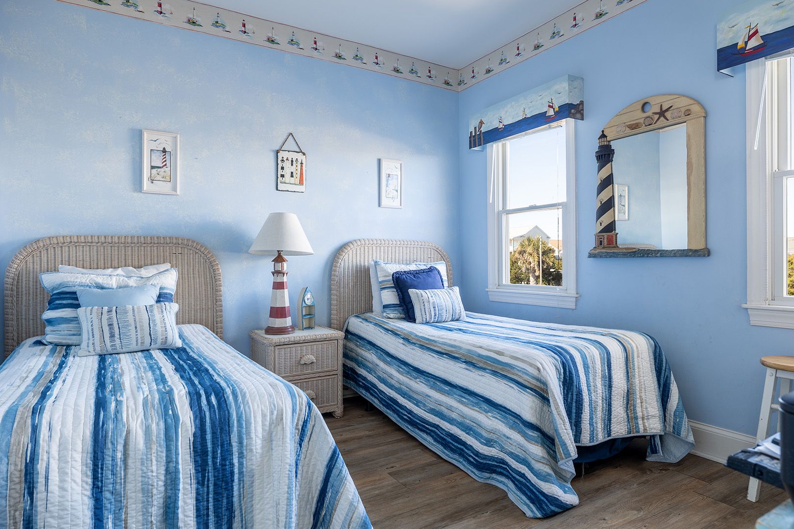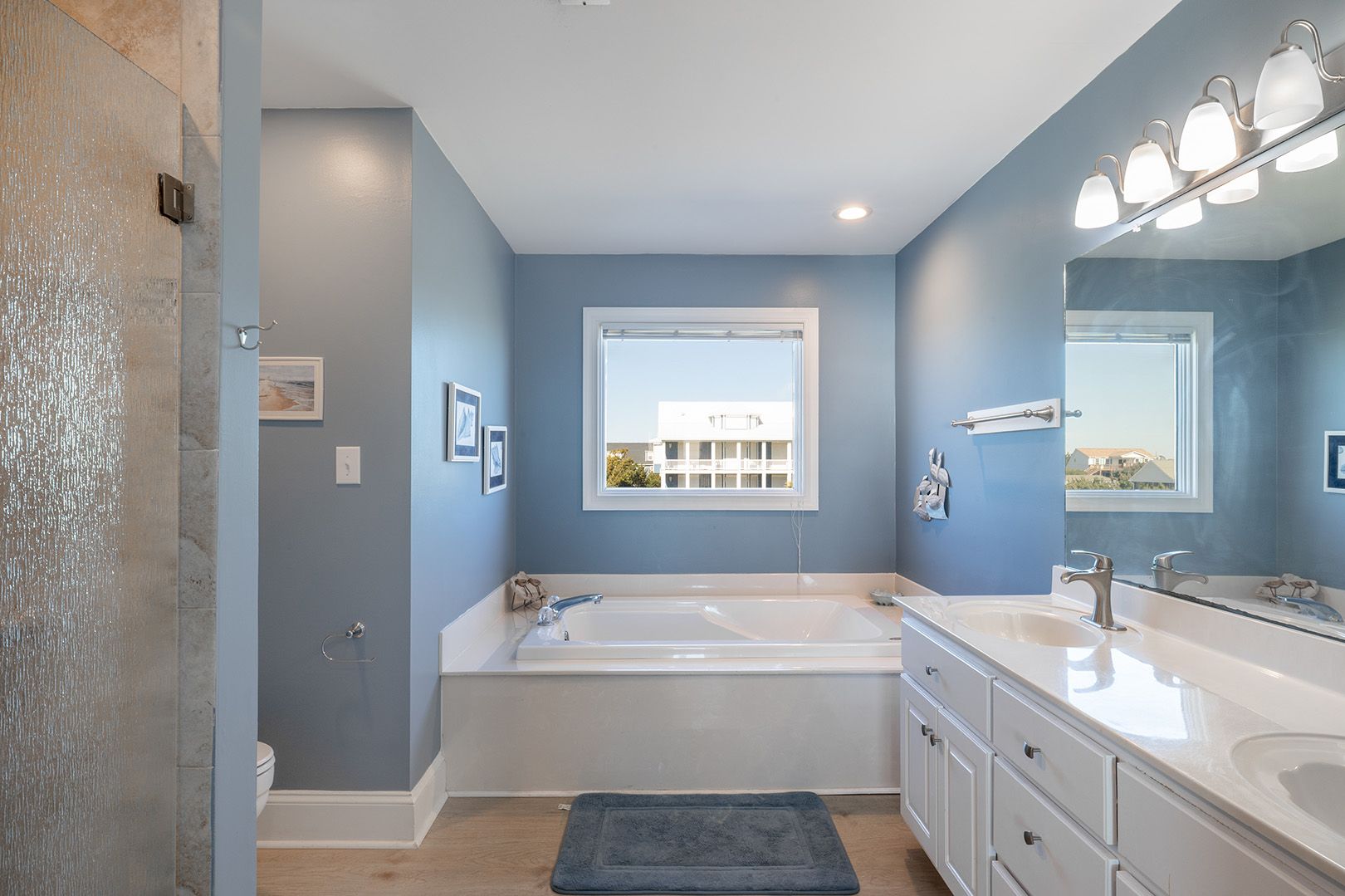 Level Two: Oceanfront Master Bedroom #3 with "Select Comfort" King Air Bed, 32" Flat Screen TV, whirlpool bath and open deck. Oceanfront Master Bedroom #4 with Queen Bed, 32" Flat Screen TV, whirlpool bath & open deck. Oceanfront Bedroom #5 with Queen, 32" Flat Screen TV and open deck. Streetside Bedroom #6 with 1 Double/Twin Bunk Bed with Twin Trundle Bed (in same room) with a 32" Flat Screen TV. Shared Bath.