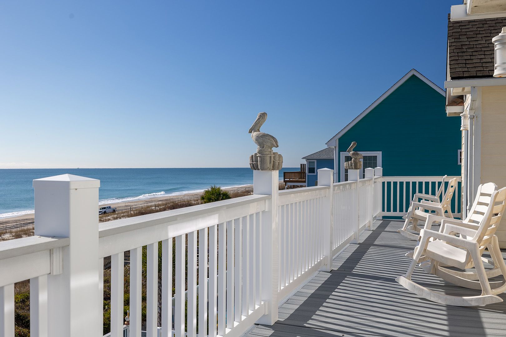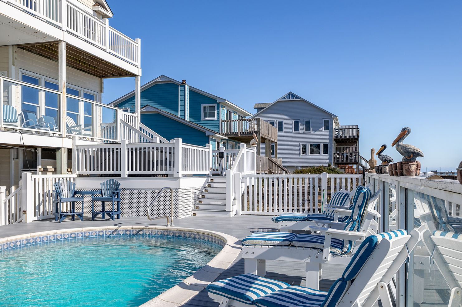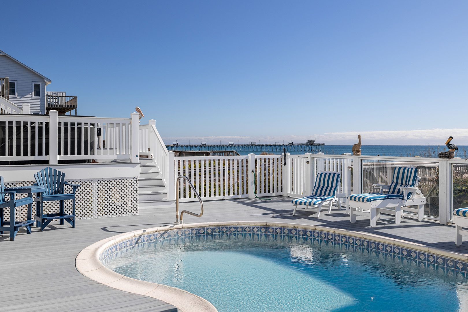 Pelican Perch is a perfect place for your next family vacation! 6-Bedroom, 4 1/2-Bath home on 3 living levels. Private, in-ground, oceanfront Swimming Pool. Spacious Hot Tub overlooks the ocean! Game Room features a Pool Table, Ping Pong Table, Mini-Fridge and Half Bath and an Arcade Room which features a 60 game Arcade Game Table, an Air Hockey Table, and a Foosball Table, and special storage for Golf Clubs! Pool can be heated for $650/week + tax!
