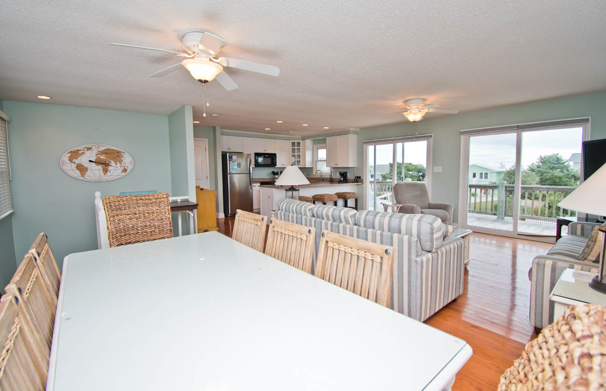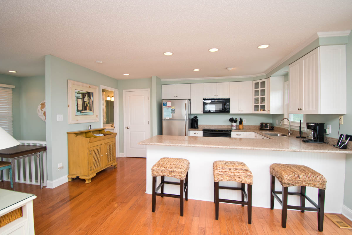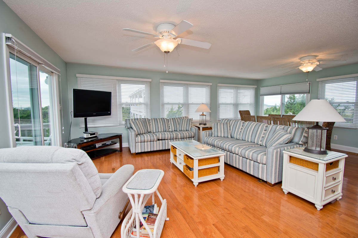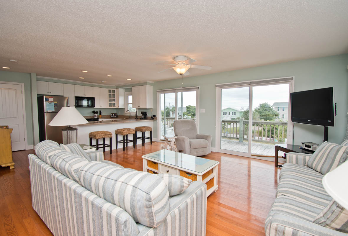 Level Two: Living Area. Beautifully-decorated Living Room, with a 42" High-Definition Flatscreen TV and Oceanview Bistro seating for two. Dining with seating for eight, and additional Bar seating for four. Kitchen has a Dishwasher, Microwave & Icemaker.