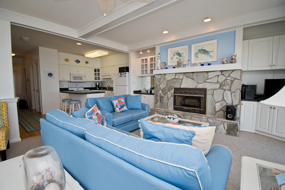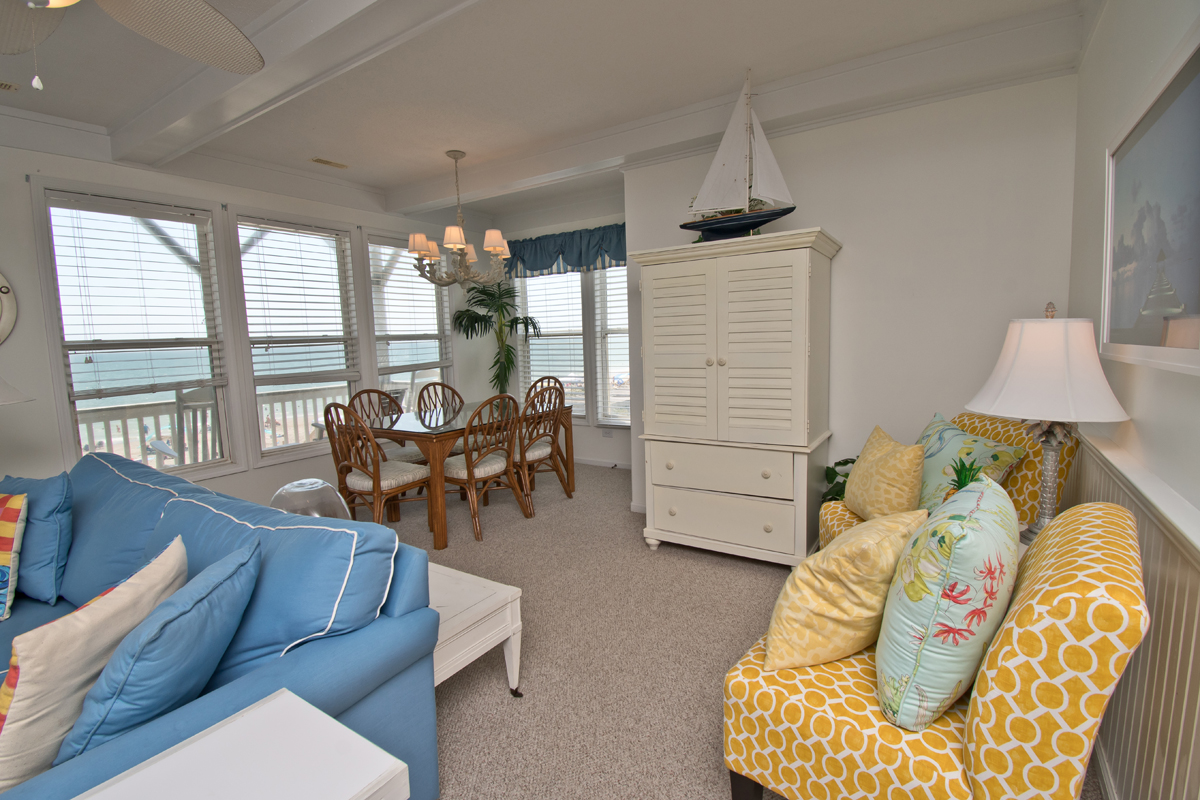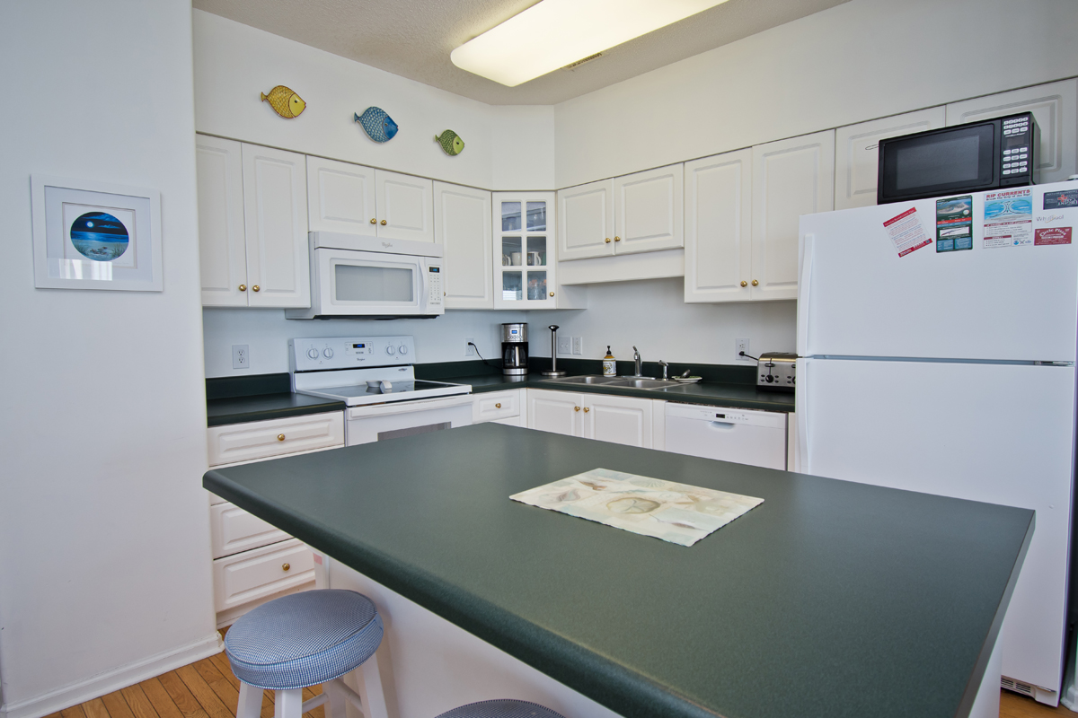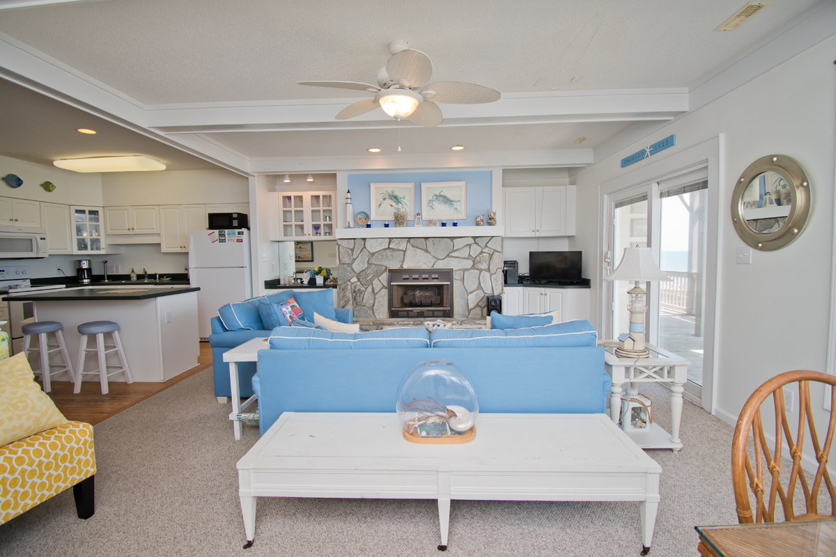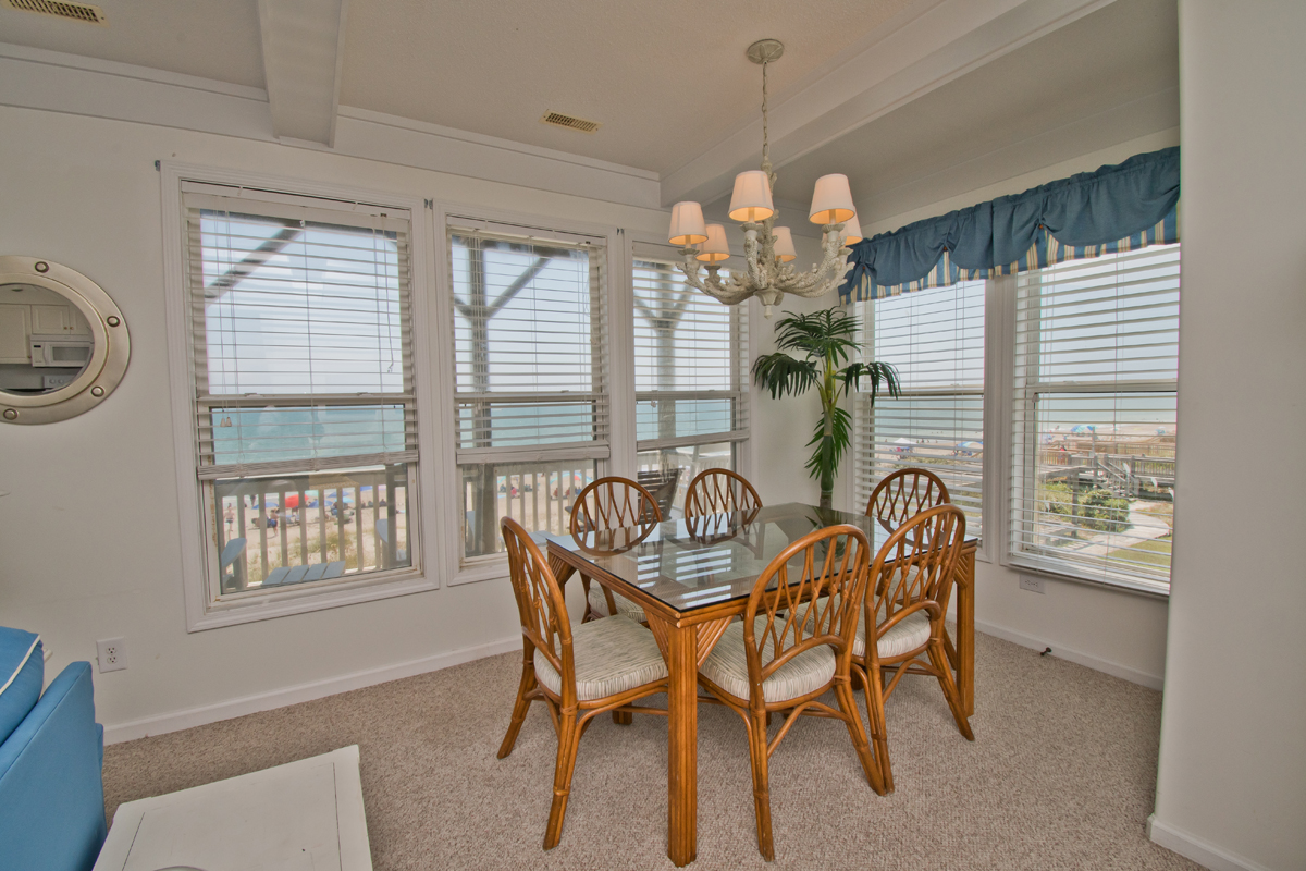 Living Area faces the ocean and has TV, DVD player, CD Player. Dining Area. Large Kitchen has bar seating, wet bar area, dishwasher & microwave. Master Bedroom #1 has a Queen bed and a Full Bath with a Jacuzzi Tub. Bedroom #2 has 2 Twin over Double Futon Bunks. Full Bath in Hall. Central Heat & Air. In unit Washer/Dryer. Rockers and Tables make on-deck views of vistas a vacationers paradise.