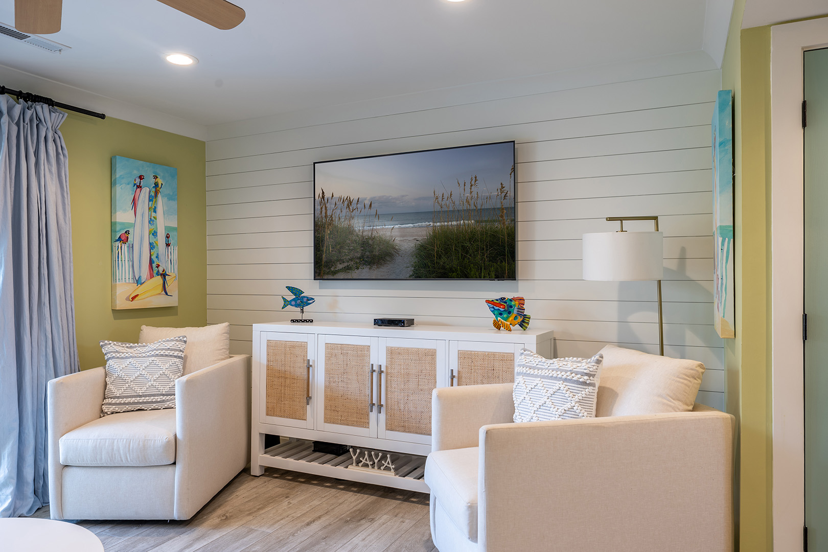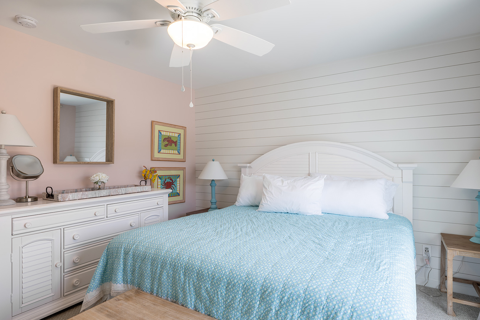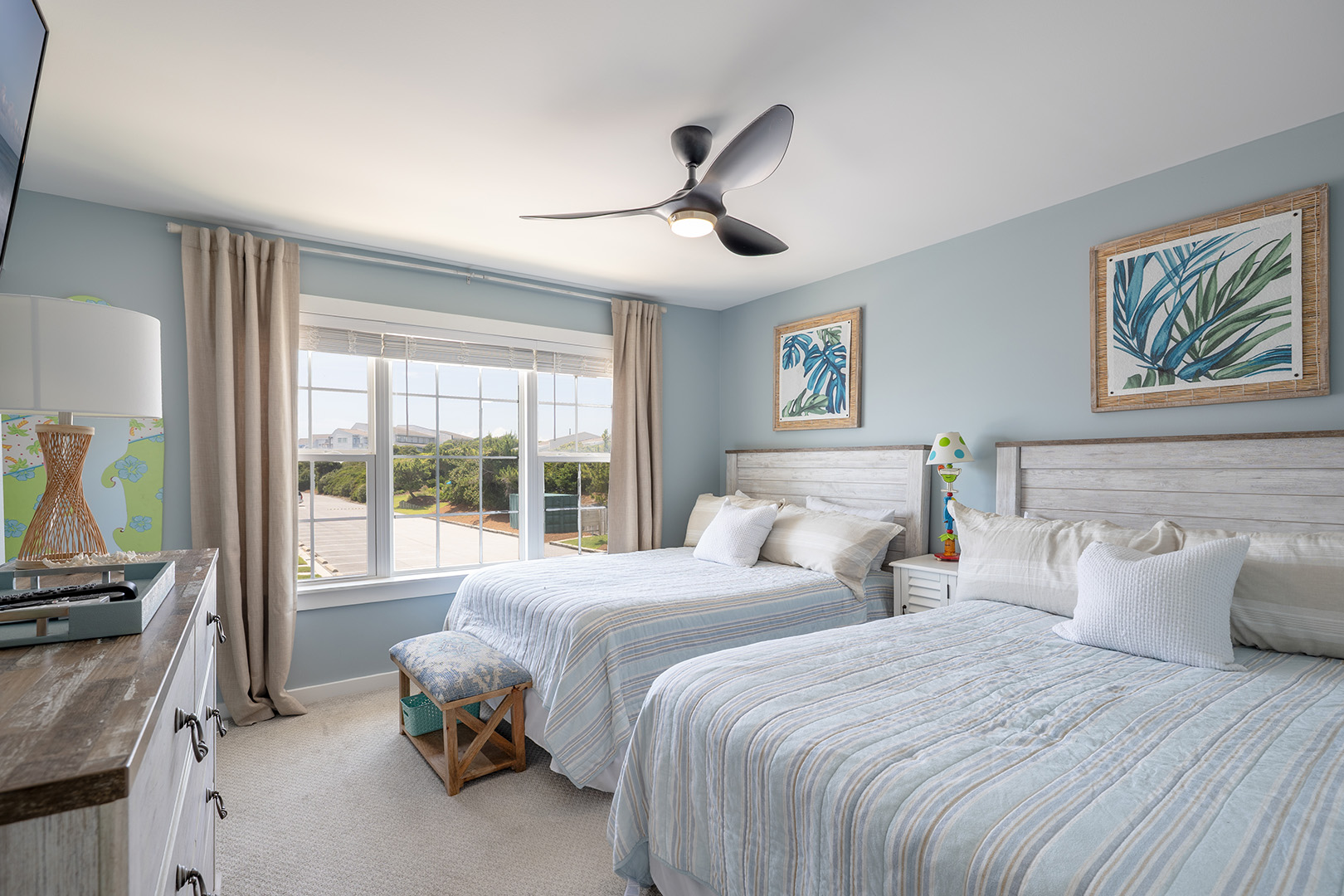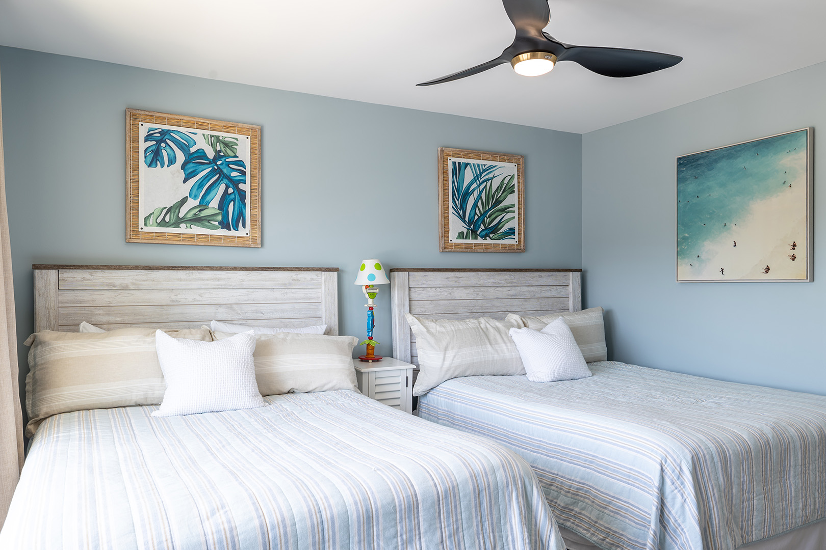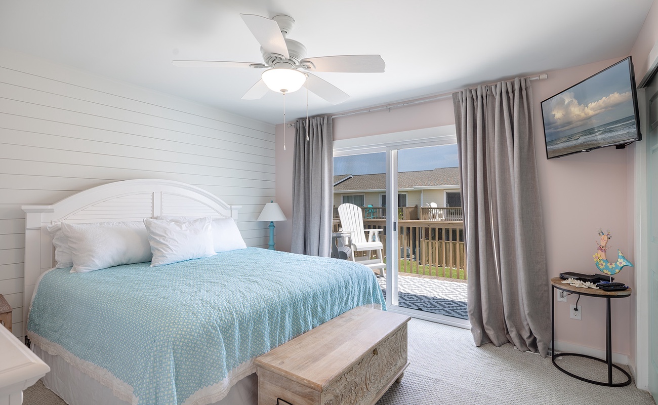 Bedroom #1 offers a King Bed, TV, and Deck Access while Bedroom #2 offers 2 Queen Beds and TV.
