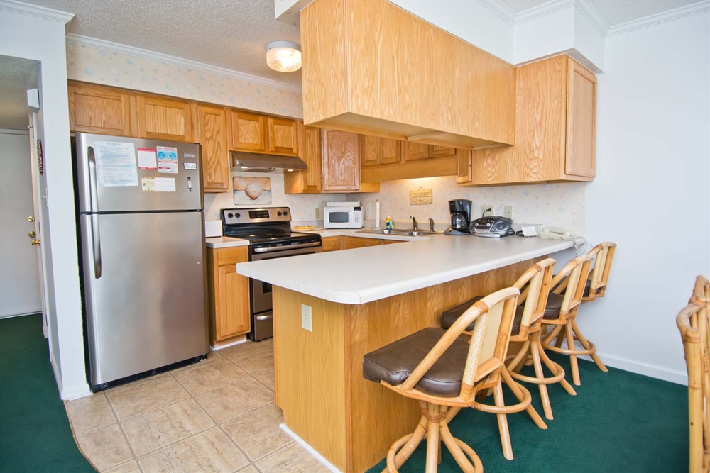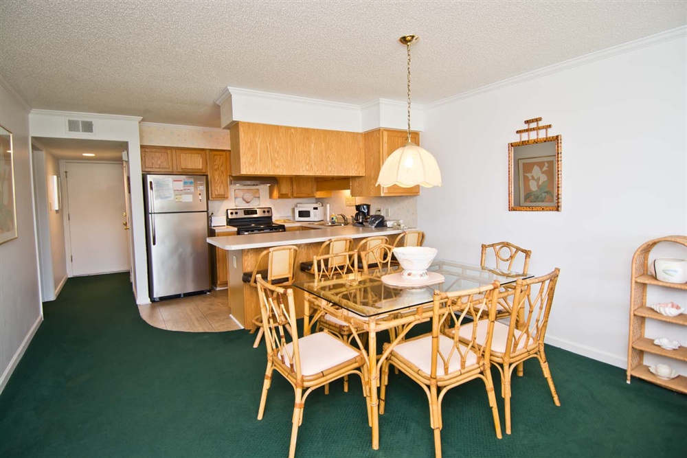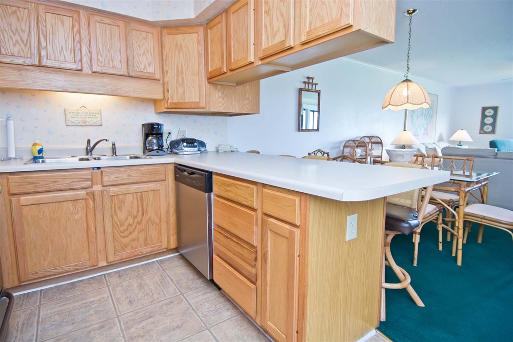 Central HVAC, Wireless High Speed Internet, and Beach Chairs provided for your comfort and convenience! Living Area with Queen Sleeper Sofa, TV, access to the Covered Deck with Table and Chairs, and access to the Shared Hall Full Bath. Dining Area. Kitchen/Bar Area with Dishwasher and Microwave.