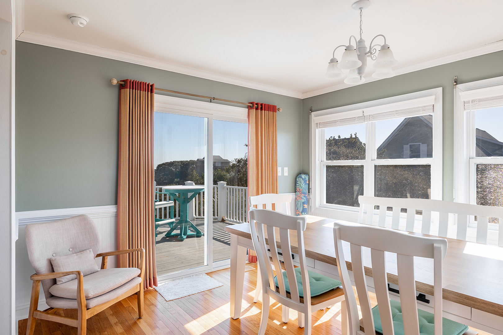 Floor #2: Living area with relcining sofas, TV; Dining Area with large table with 4 chairs and bench seating; Fully Equipped Kitchen with Refrigerator, Stove, Oven, Microwave, Dishwasher, Keurig Coffee Maker, Toaster Oven, Slow Cooker, and Blender; Bathroom #3 with claw foot soaking tub; Outdoor Deck with high top table and chairs and rocking chairs.