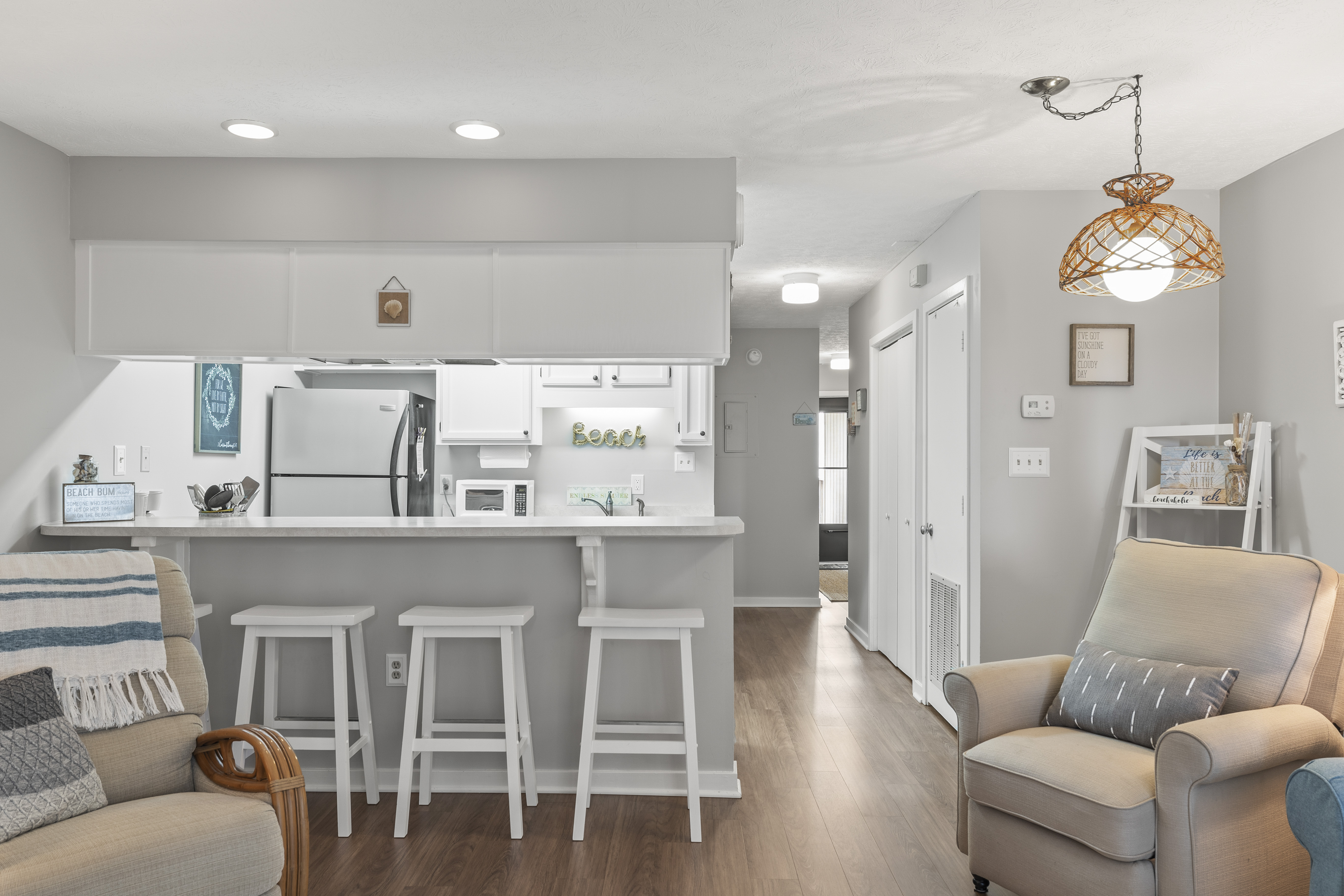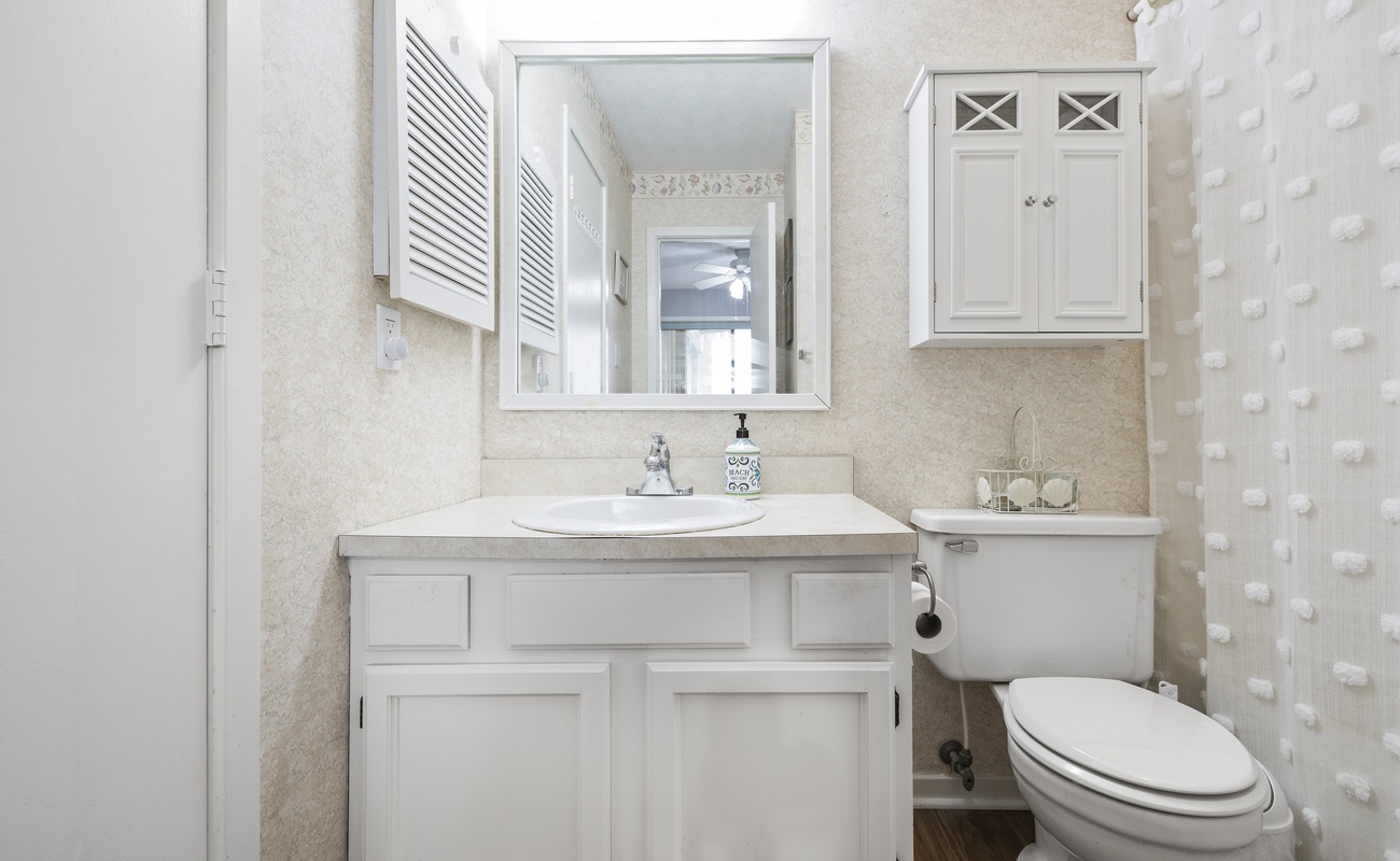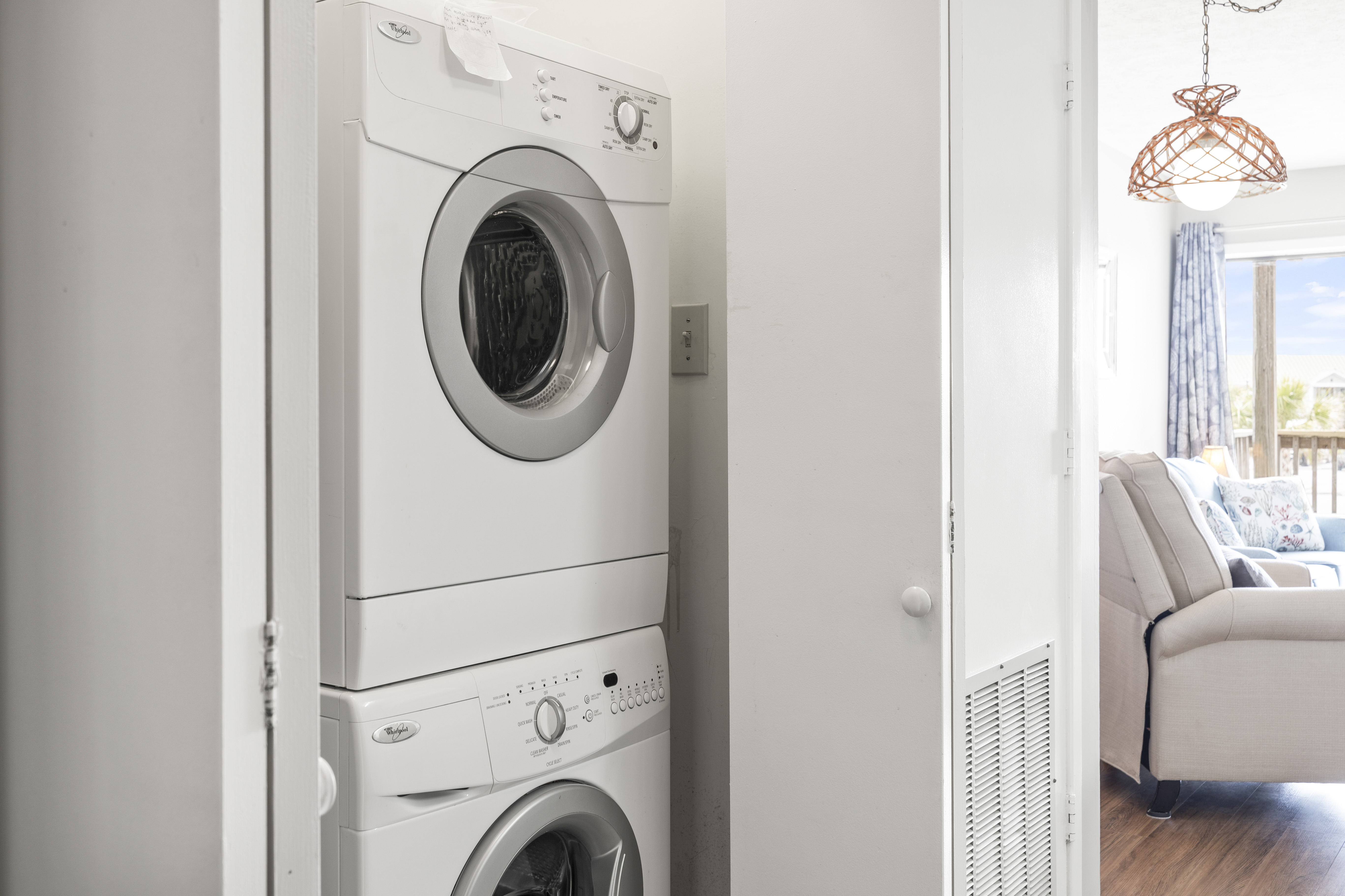Amenities: WiFi, 2 TVs, Basic Cable, Central Heat & Air, Interior Washer/Dryer, Fully Equipped Kitchen with Coffee Maker, Oven, Refrigerator with Attached Icemaker, Microwave, Dishwasher, and a Blender. Private Covered Deck with Deck Furniture.