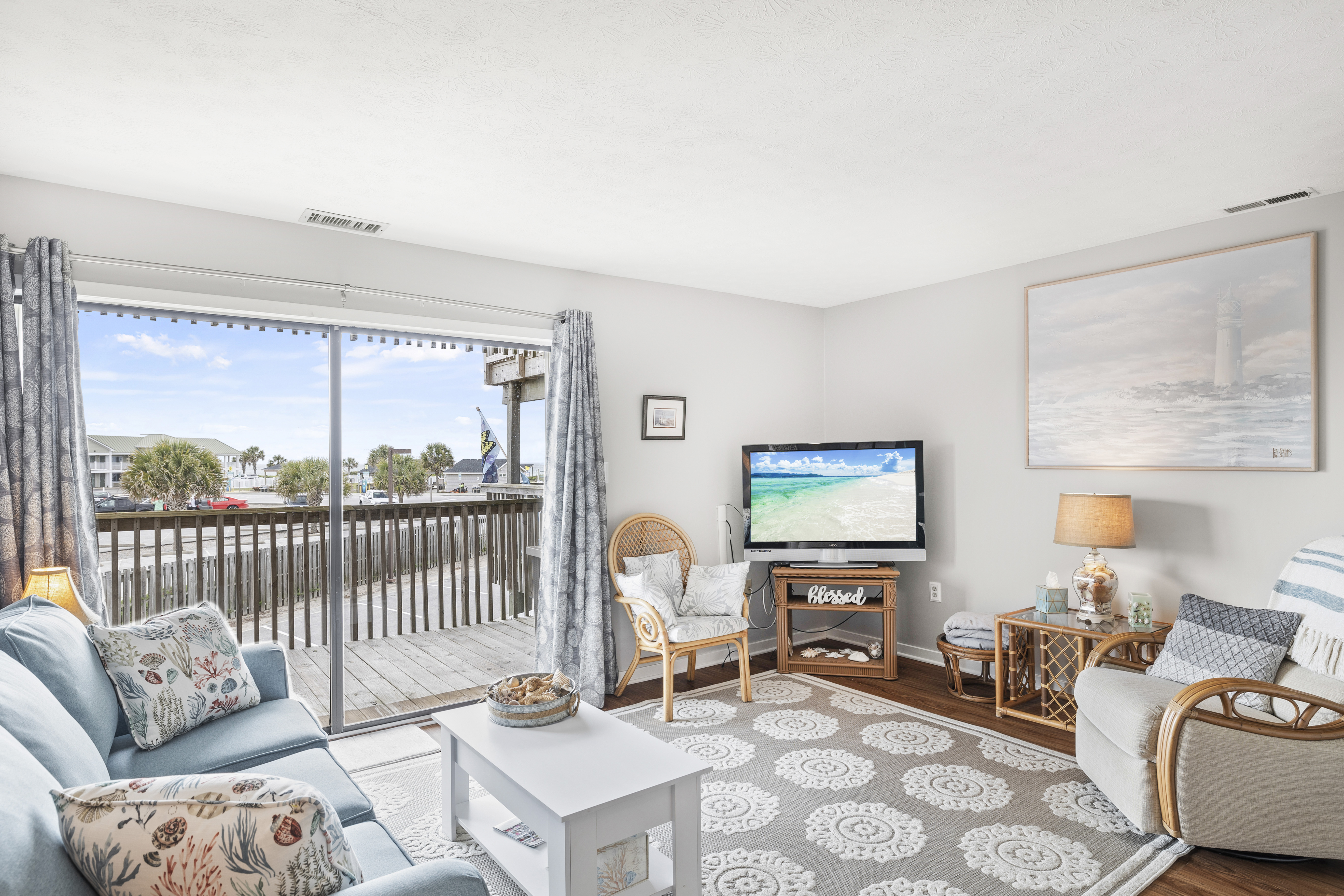 Queens Court 3102 is a 1 Bedroom, 1 Bath First Floor Angled Oceanview Condo. Living Area has a Queen Sleeper Sofa (Linens are NOT Provided for Sleeper Sofa) and a private Covered Deck with furniture. Bedroom has a King Bed.