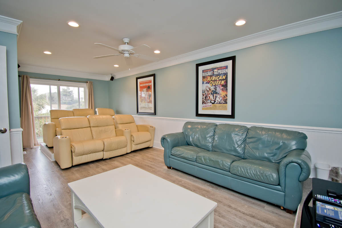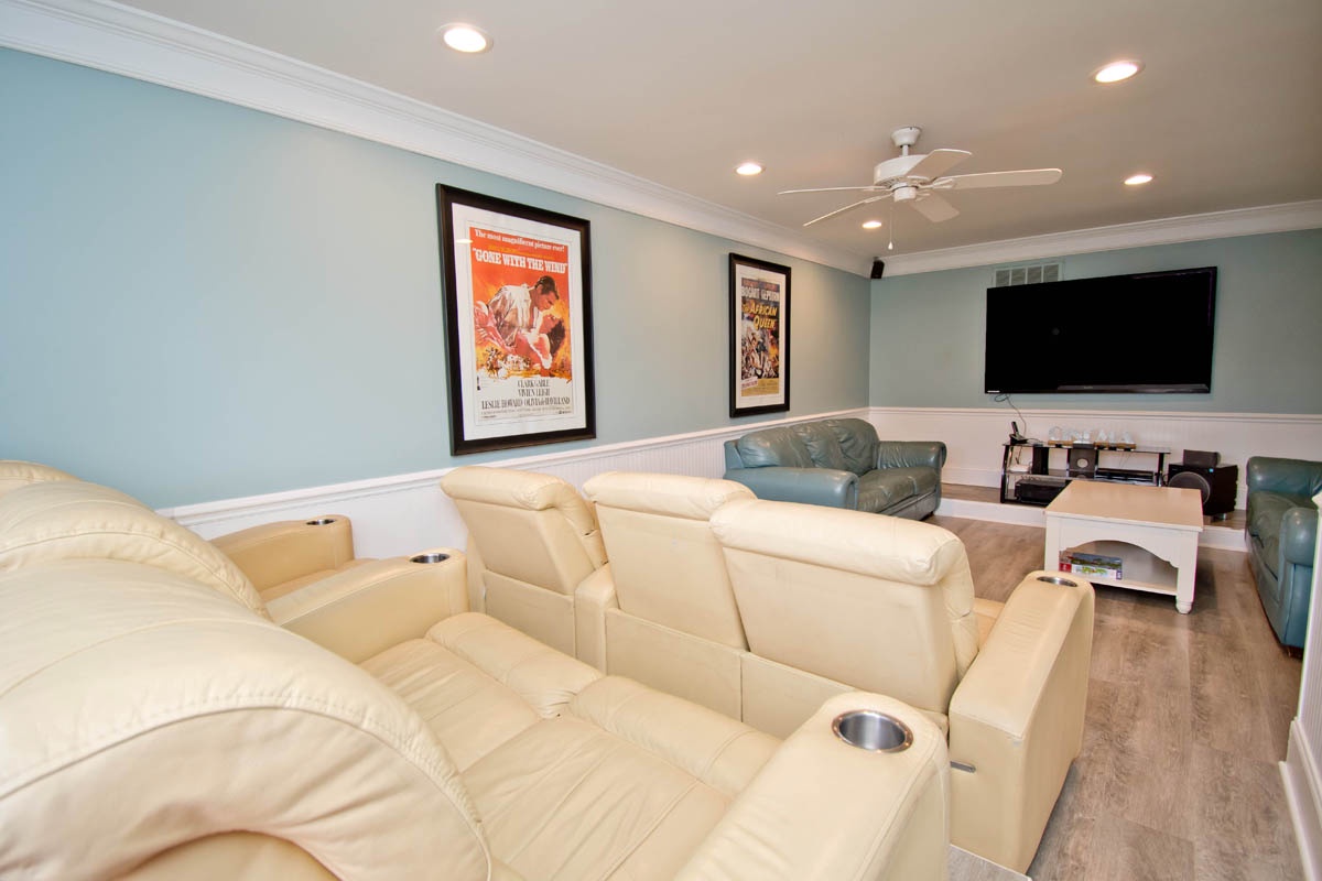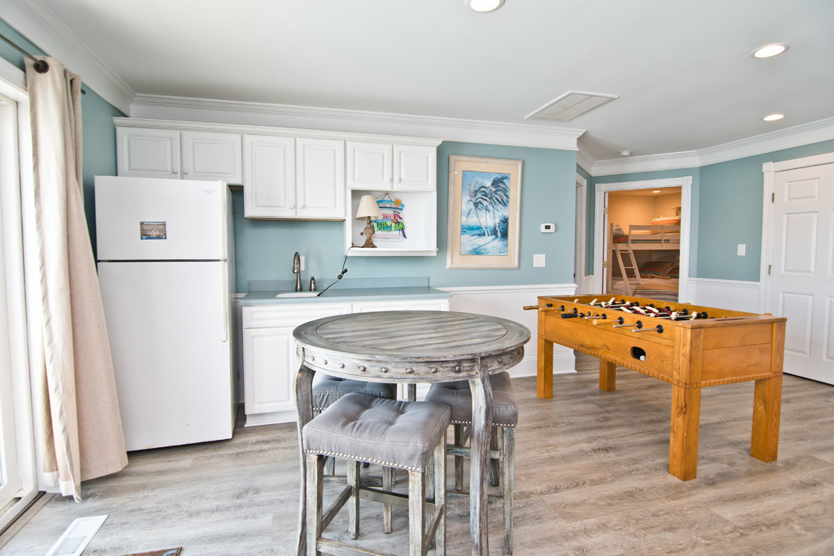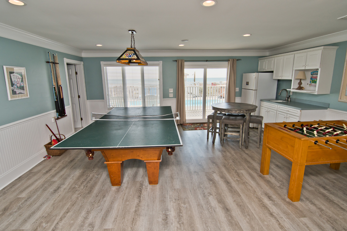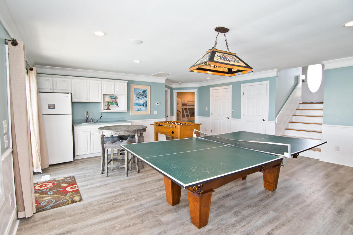 Level One: Media room and game room with ping pong table and pool table, kitchenette area with full sized refrigerator and sink. Bedroom #1 has a double/twin bunk and a twin with a TV and deck access. Bedroom #2 has a double/twin bunk with a twin, TV and DVD player. Bedrooms #1 and #2 share a hall bath. There is also a half bath on this level for added convenience.