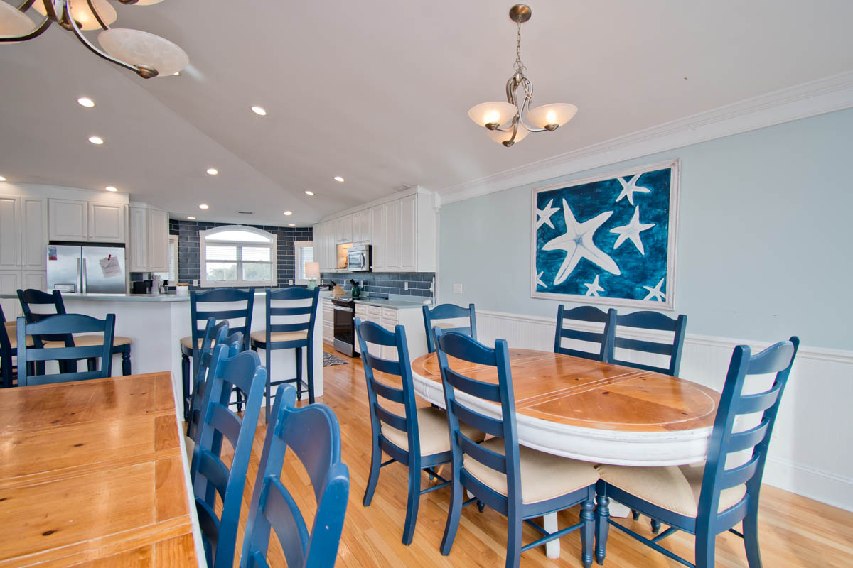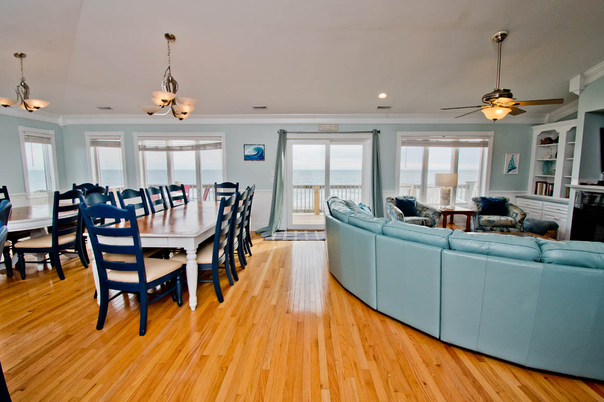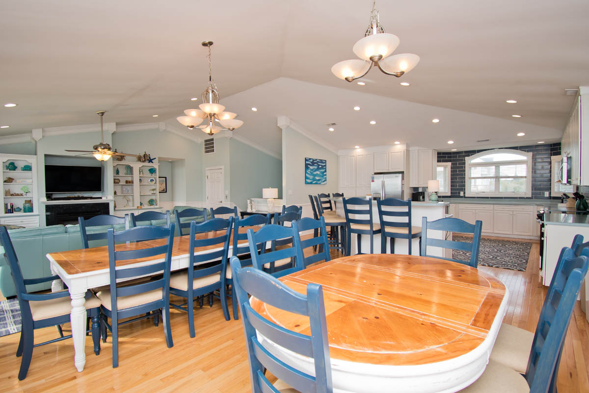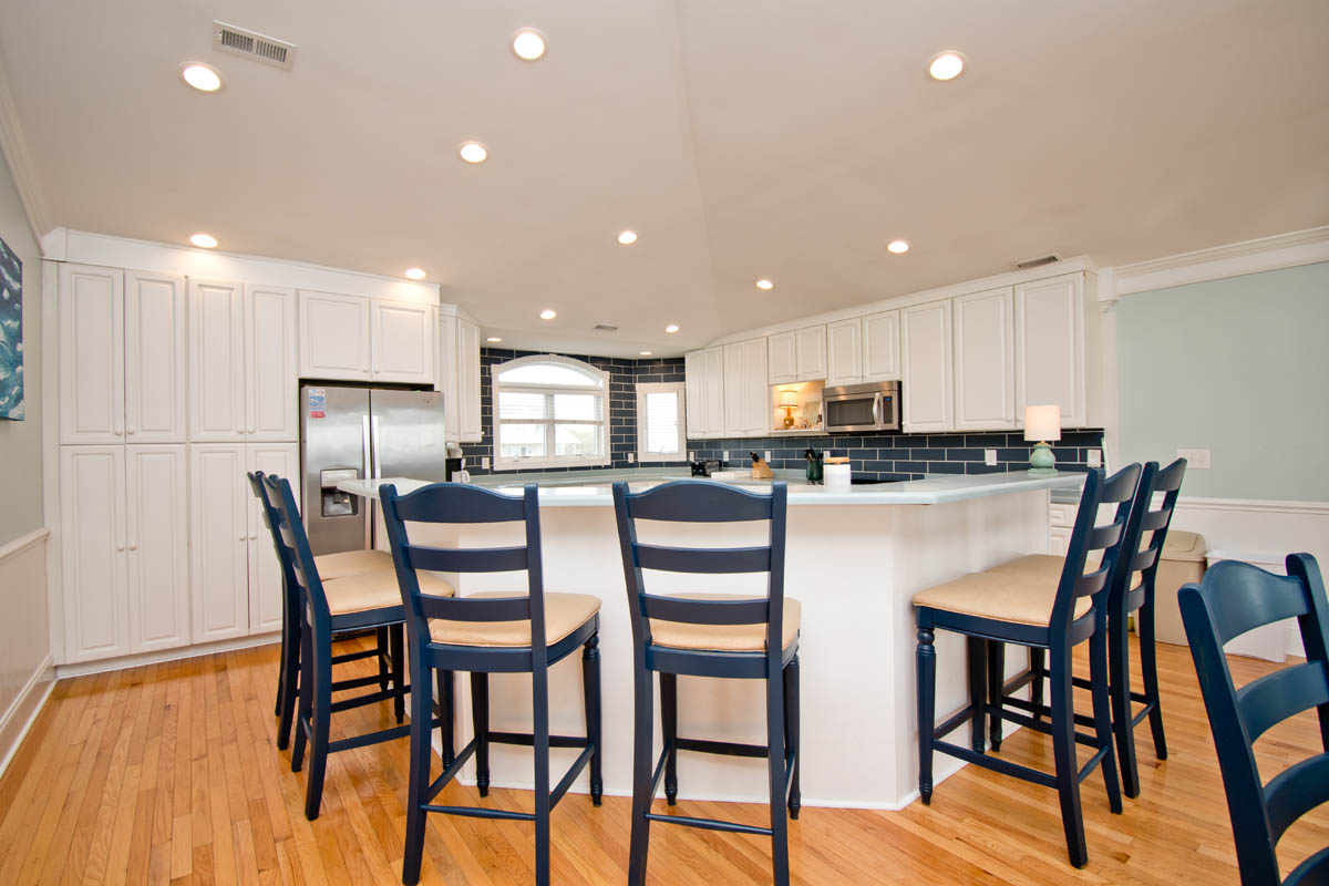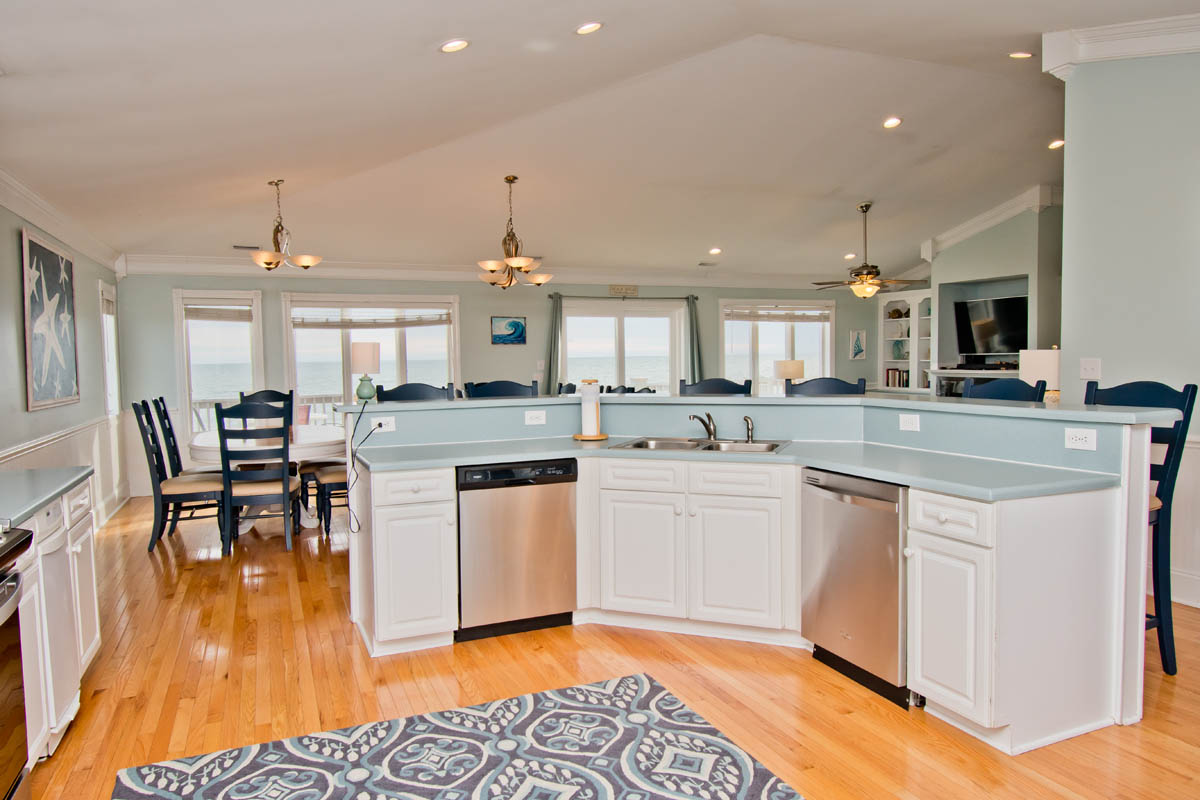 Level Three: The top level boasts the best views, so of course the main family gathering areas can be found here. A spacious open layout allows everyone to be together, while cooking, dining or watching the waves roll in from the open top deck. The kitchen has wide and ample counterspace to cook for a crowd with ease and the dining area has 2 tables plus bar seating so there's always room for the entire family to eat together.