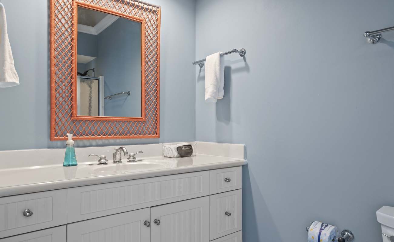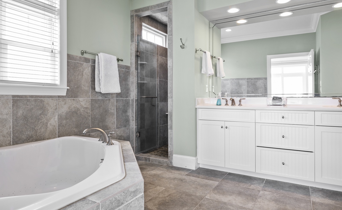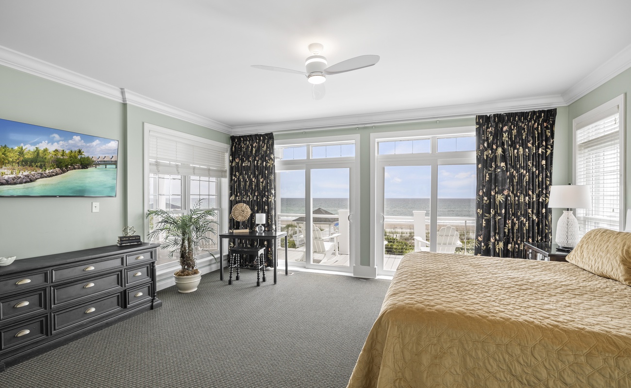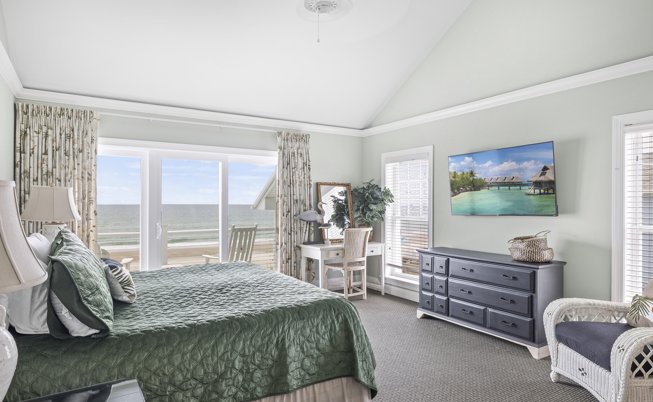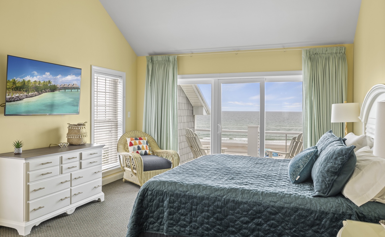 Here on this same second level, there are 2 king bedrooms, both which have their own in-suite bathrooms and own Roku TVs. One of the king bedrooms faces the ocean, leads out to a deck and has its own large corner Jacuzzi tub. The other king bedroom is handicap/ wheel chair accessible and only a few steps away from the elevator.