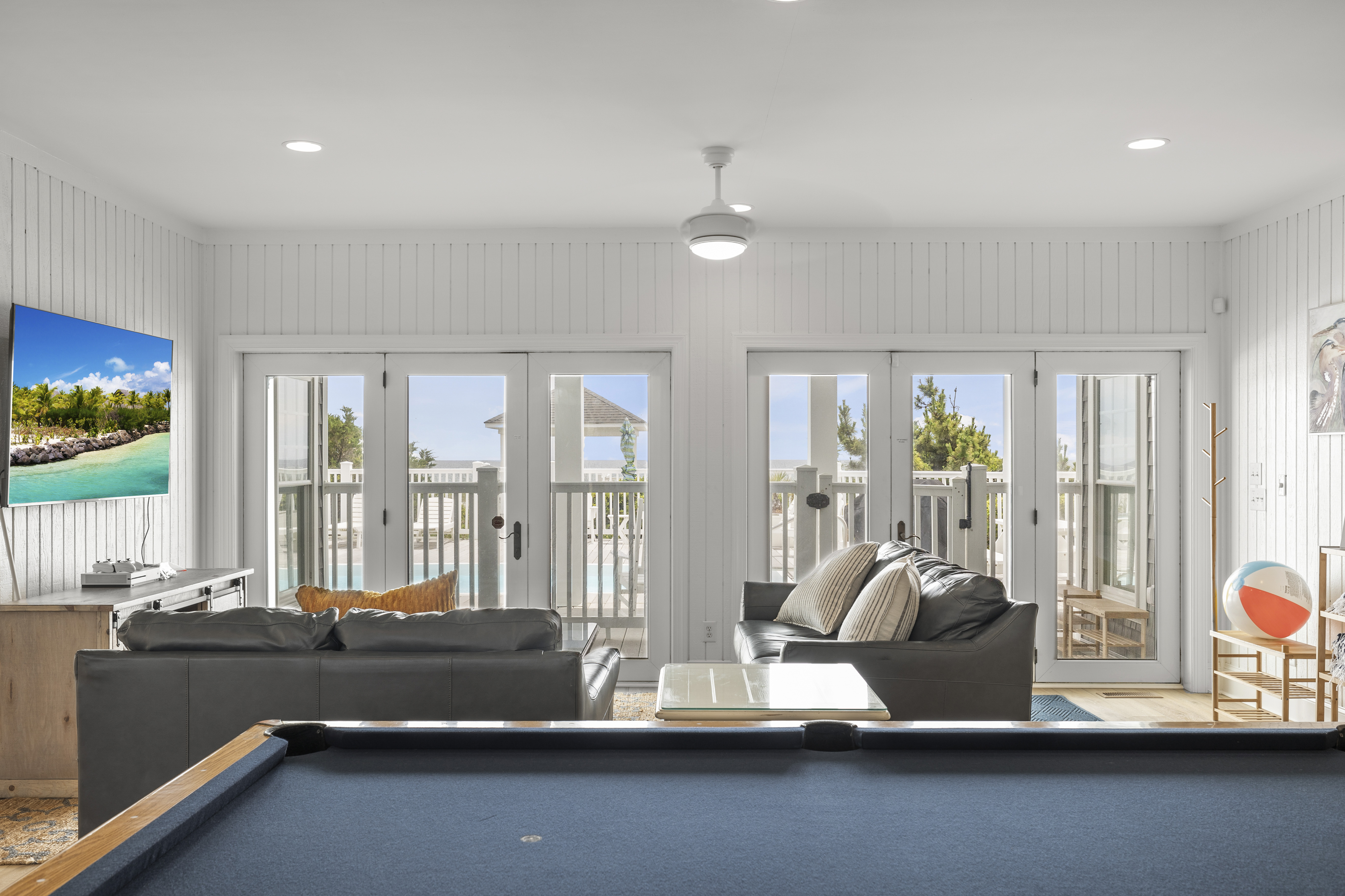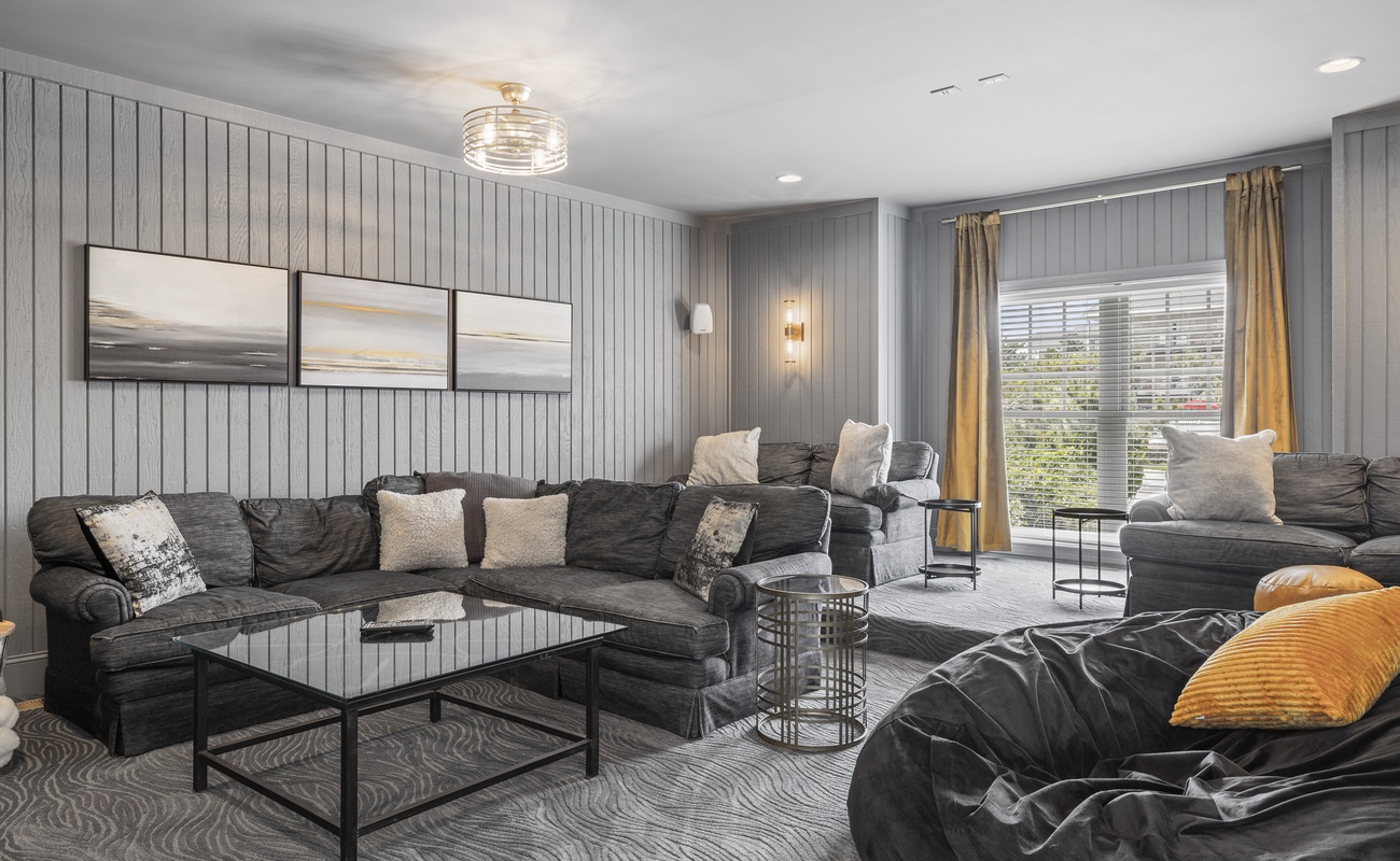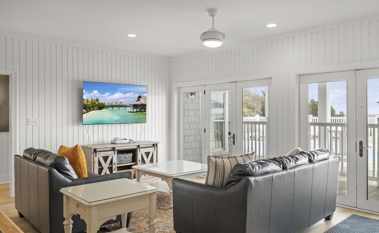 The first level has a lounge area with gaming system, billiards table, decadent theater room and leads directly out of the pool and beach. A kitchenette and full-sized refrigerator are the perfect partners for outdoor grilling, chilling and al fresco activities. There are also 3 bedrooms on this level—each boasting (2) queen beds and its own 55” Roku TV—perfect for kids and couples alike. The 2 full baths on this level are spacious enough to service both the bedrooms and those taking advantage of the amenities on the same level.