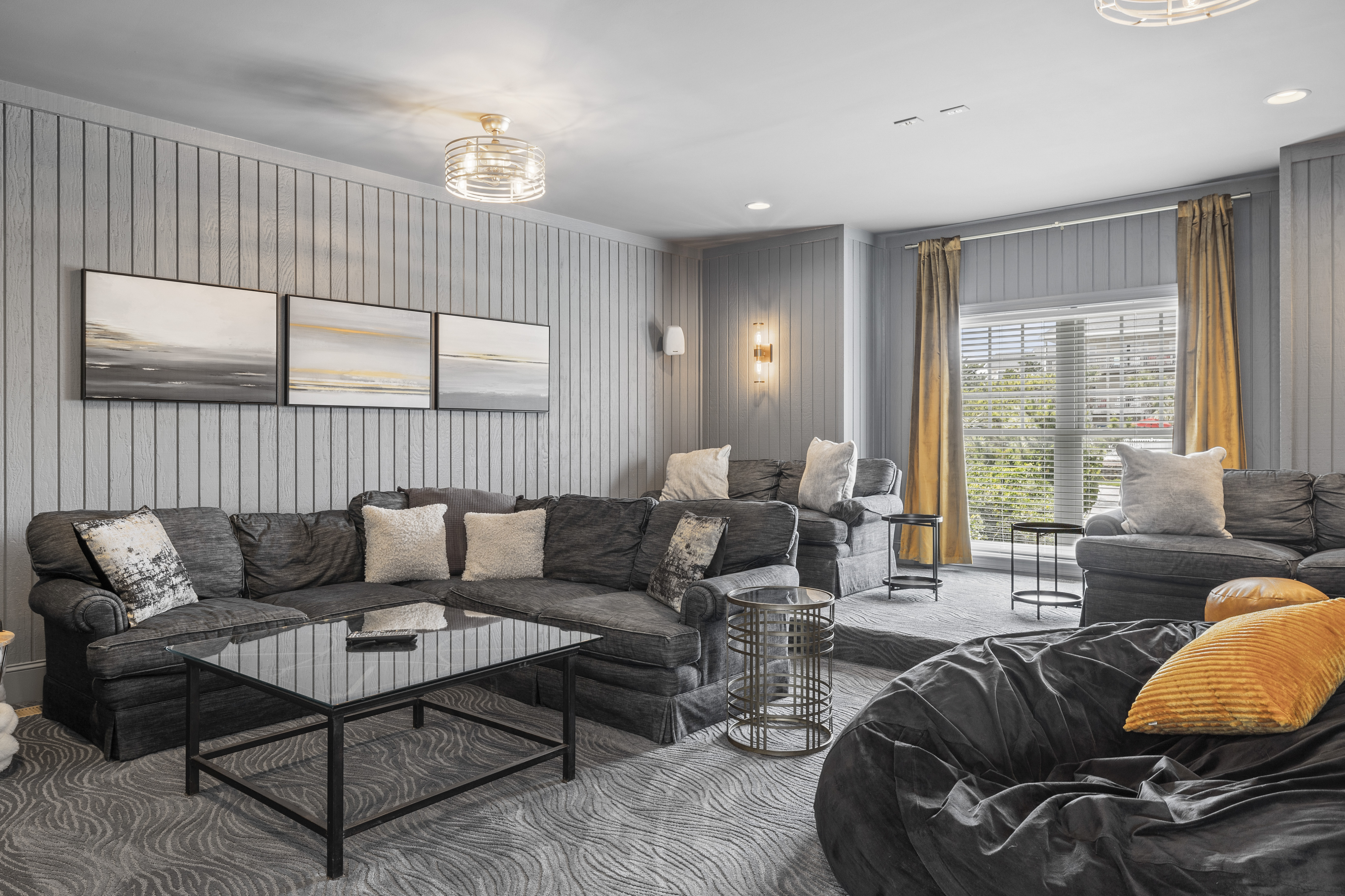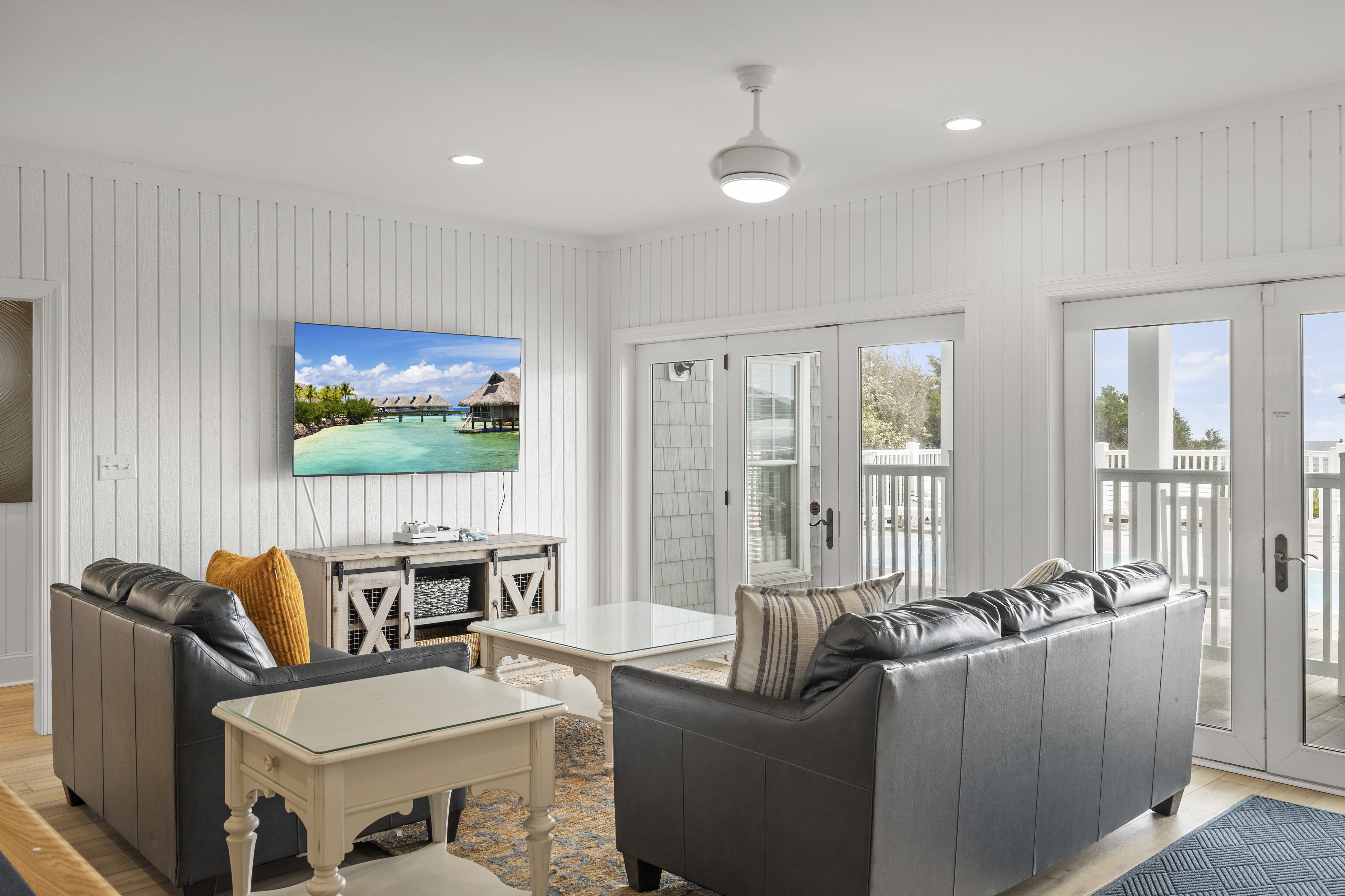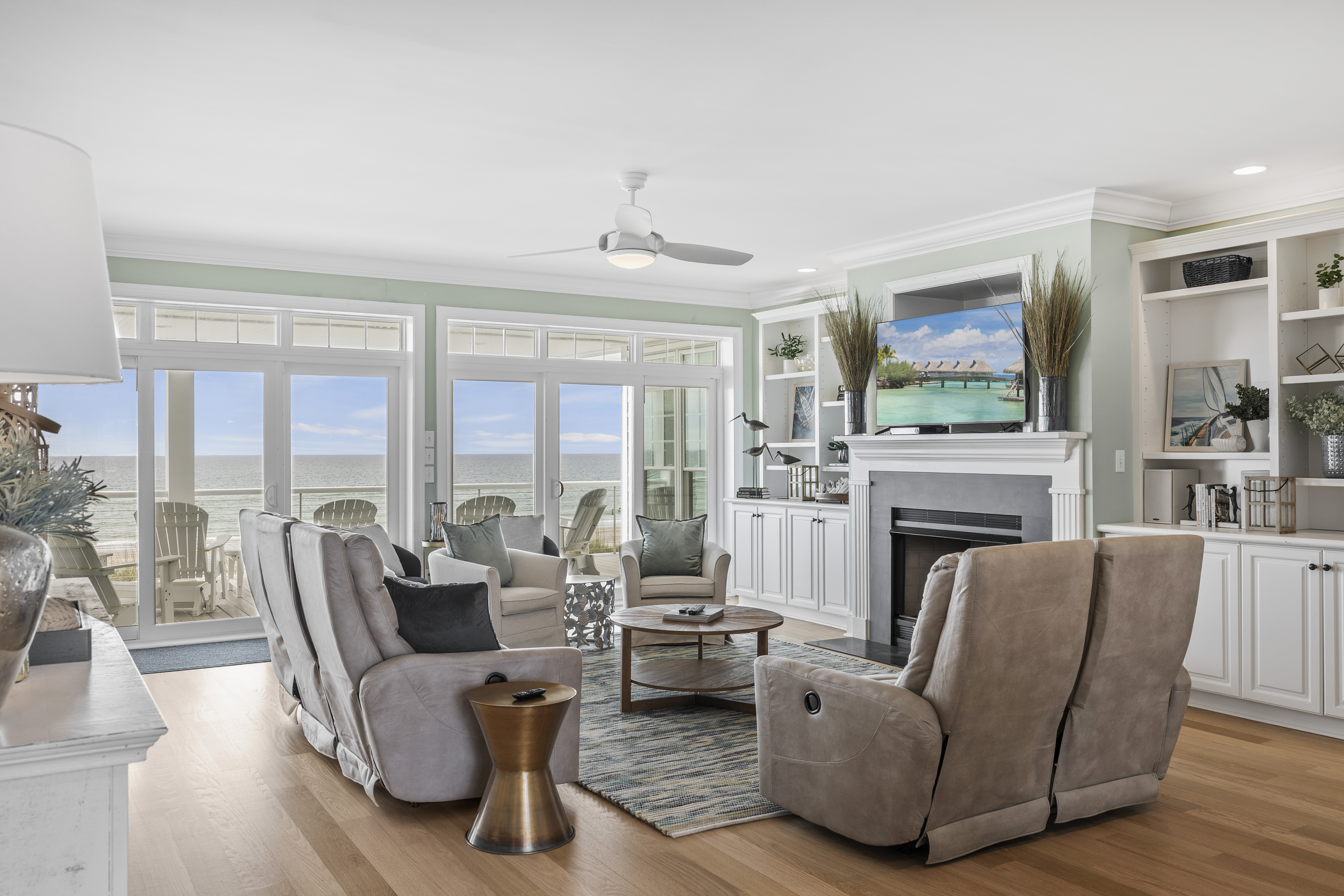 The first level has a lounge area with gaming system, billiards table, decadent theater room and leads directly out of the pool and beach. A kitchenette and full-sized refrigerator are the perfect partners for outdoor grilling, chilling and al fresco activities. There are also 3 bedrooms on this level—each boasting (2) queen beds and its own 55” Roku TV—perfect for kids and couples alike. The 2 full baths on this level are spacious enough to service both the bedrooms and those taking advantage of the amenities on the same level.