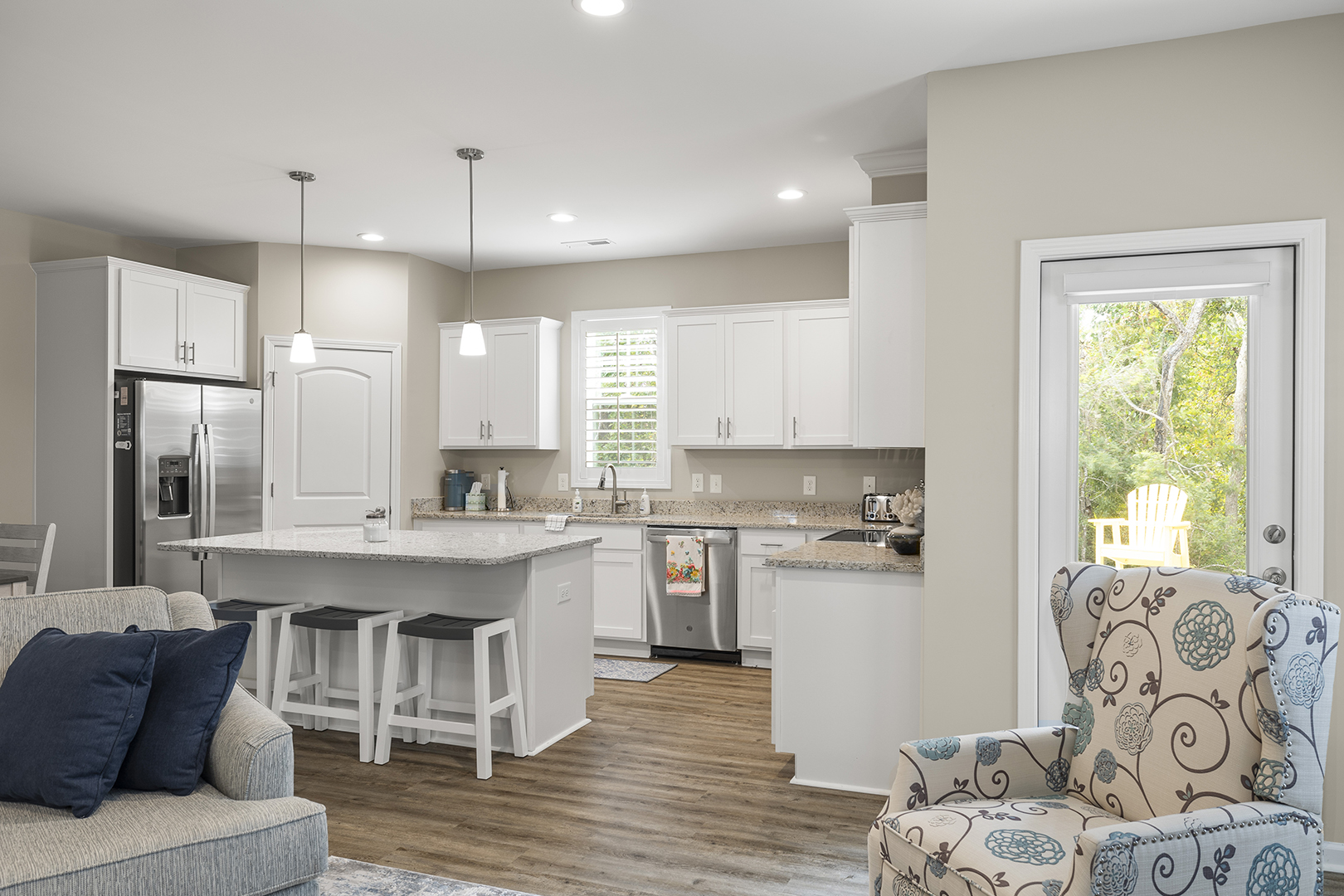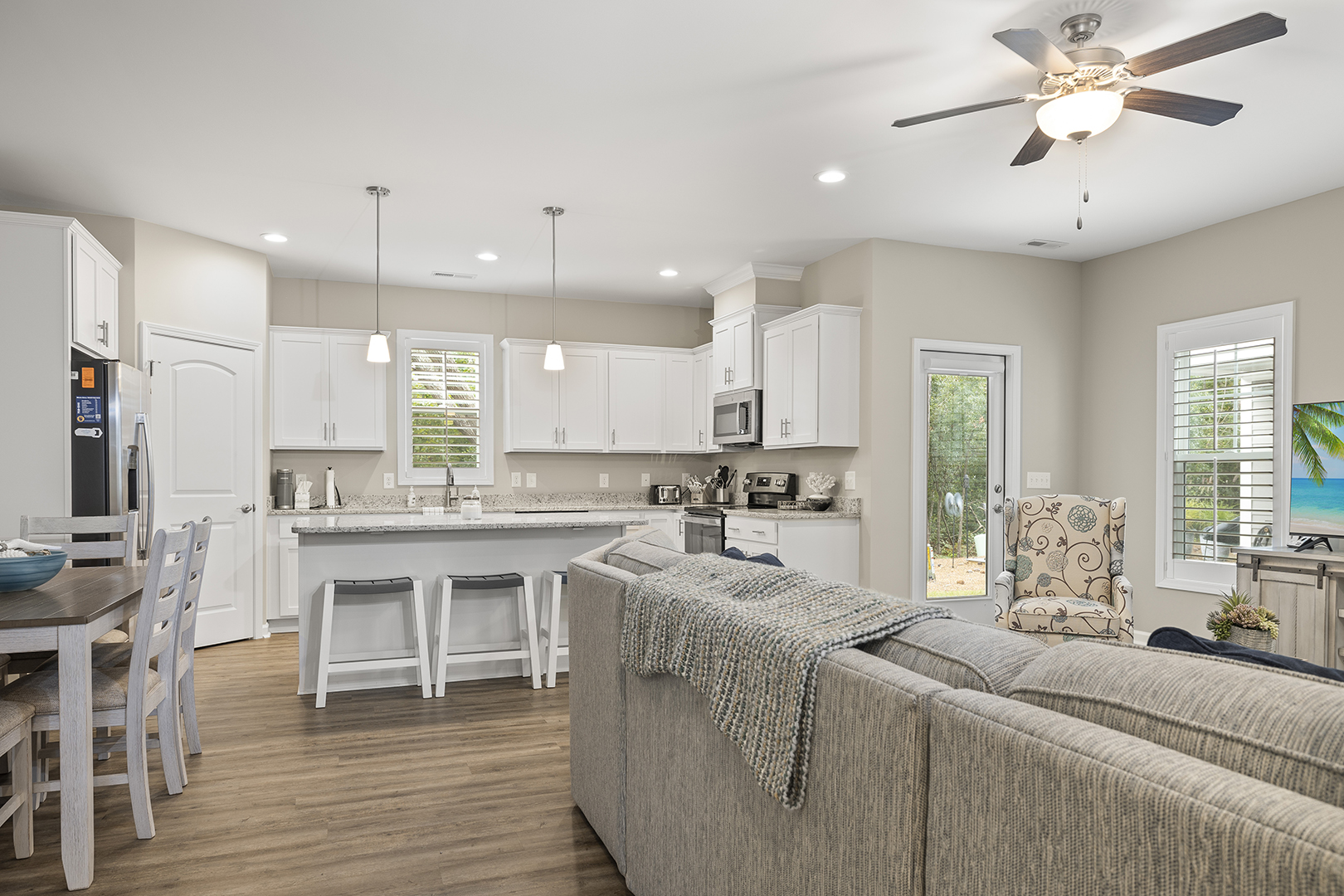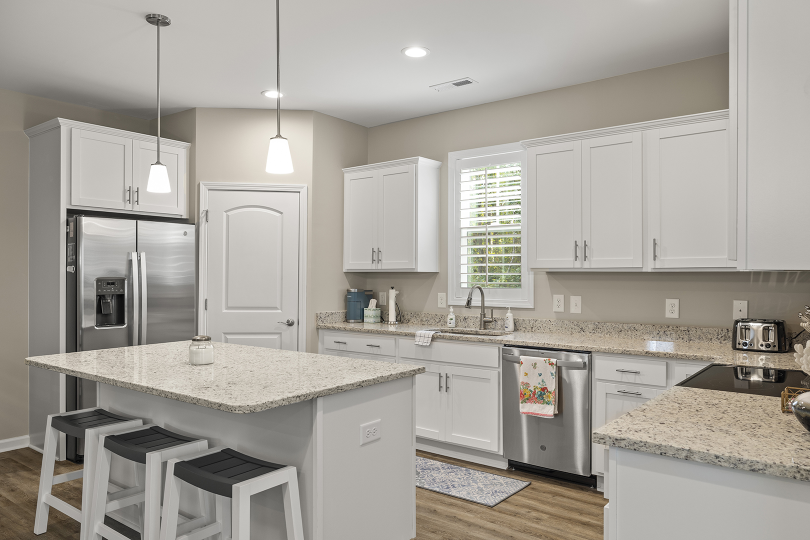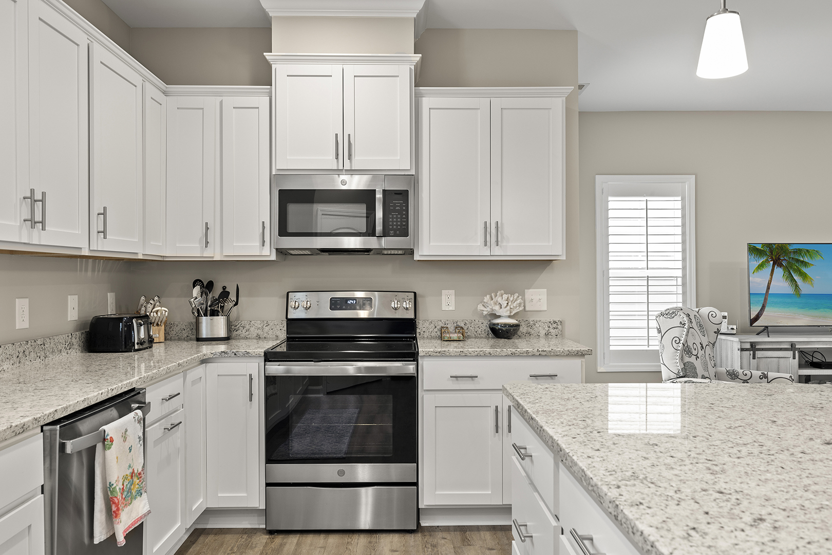The fully-equipped kitchen has a coffee maker, garbage disposal, oven, refrigerator, microwave, and dishwasher.