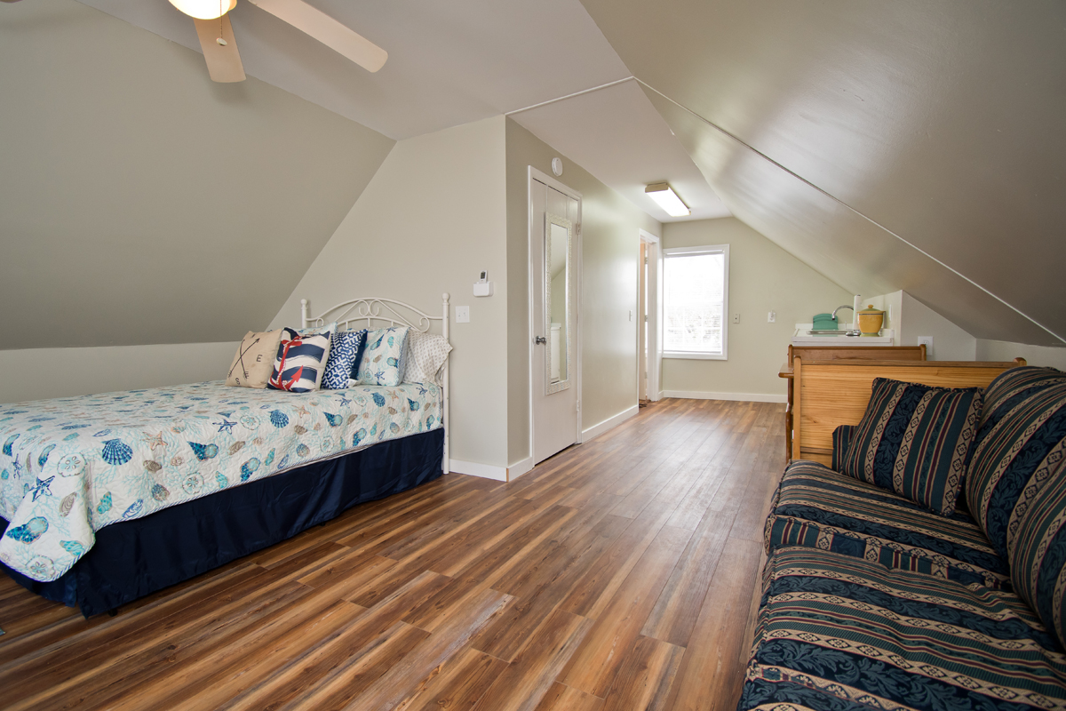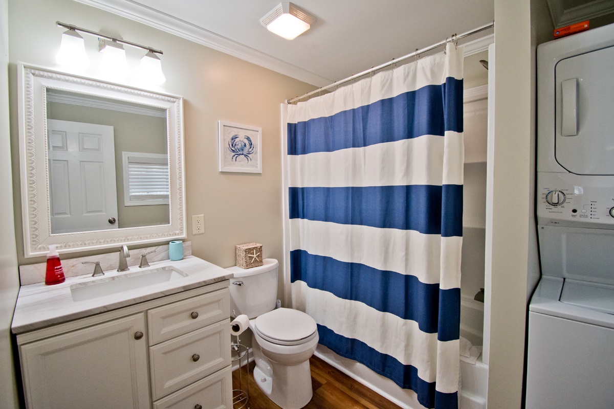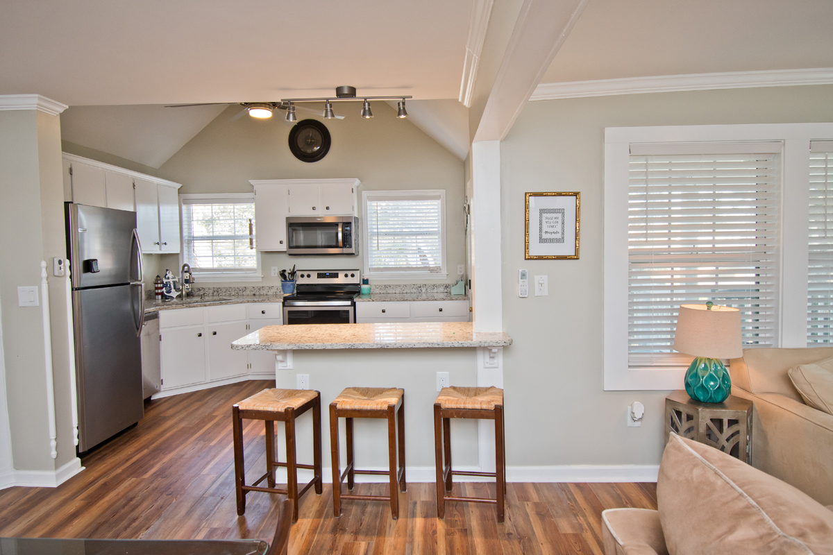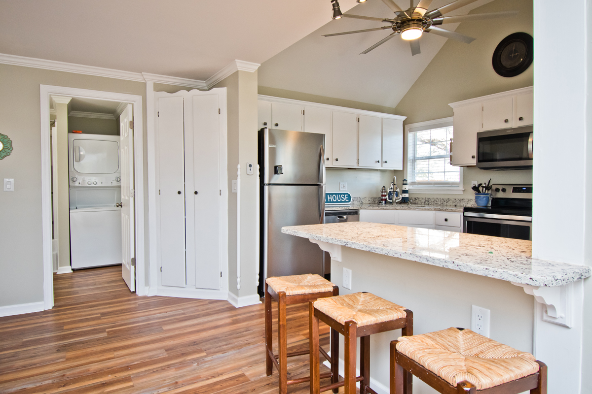 Level One: Bedroom #1 has a Queen Bed with Full Bathroom. Bedroom #2 has two Twin Beds. Full Bath in Hall. Living Room area with Flat Screen TV and DVD Player with Roku access. Fully equipped Kitchen with a refrigerator, microwave, toaster oven, oven and dishwasher!