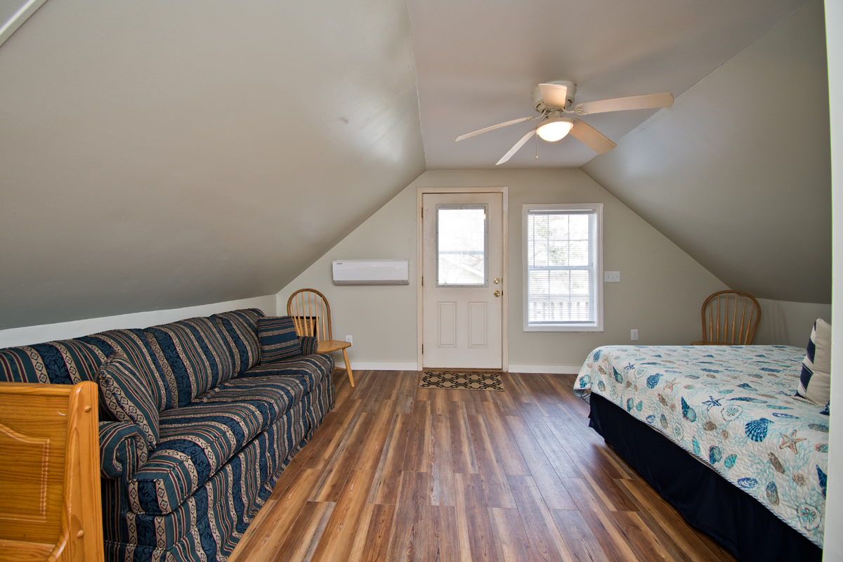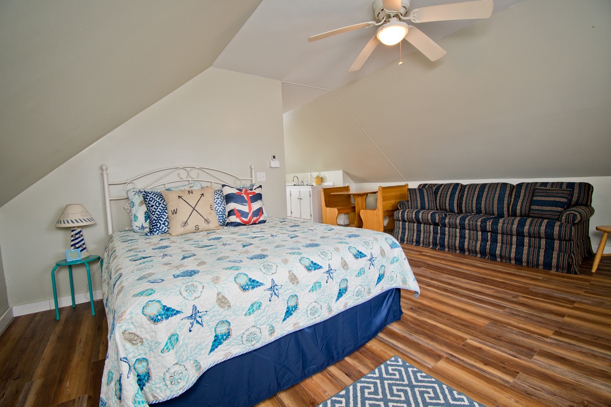 Level Two: is a suite with a separate entrance with shower, Queen Bed, sofa, table and small Kitchen area.