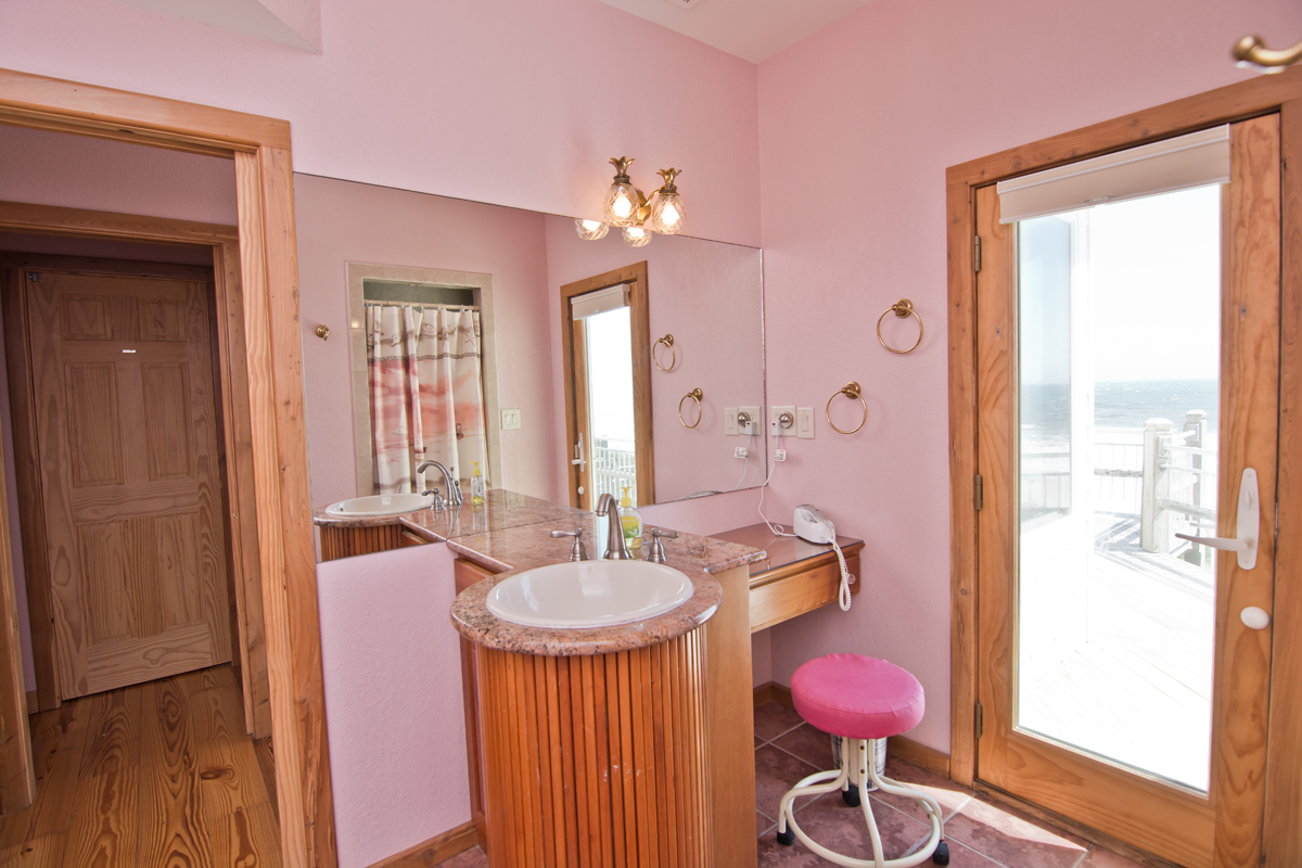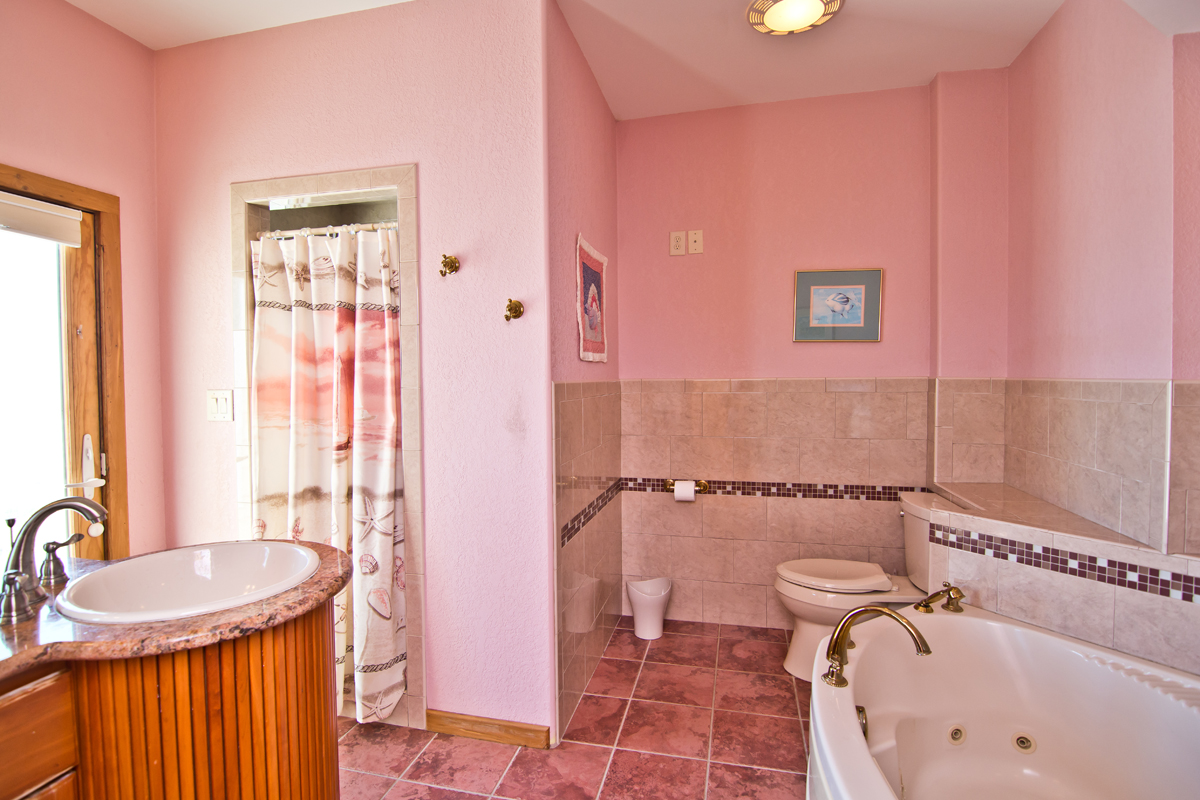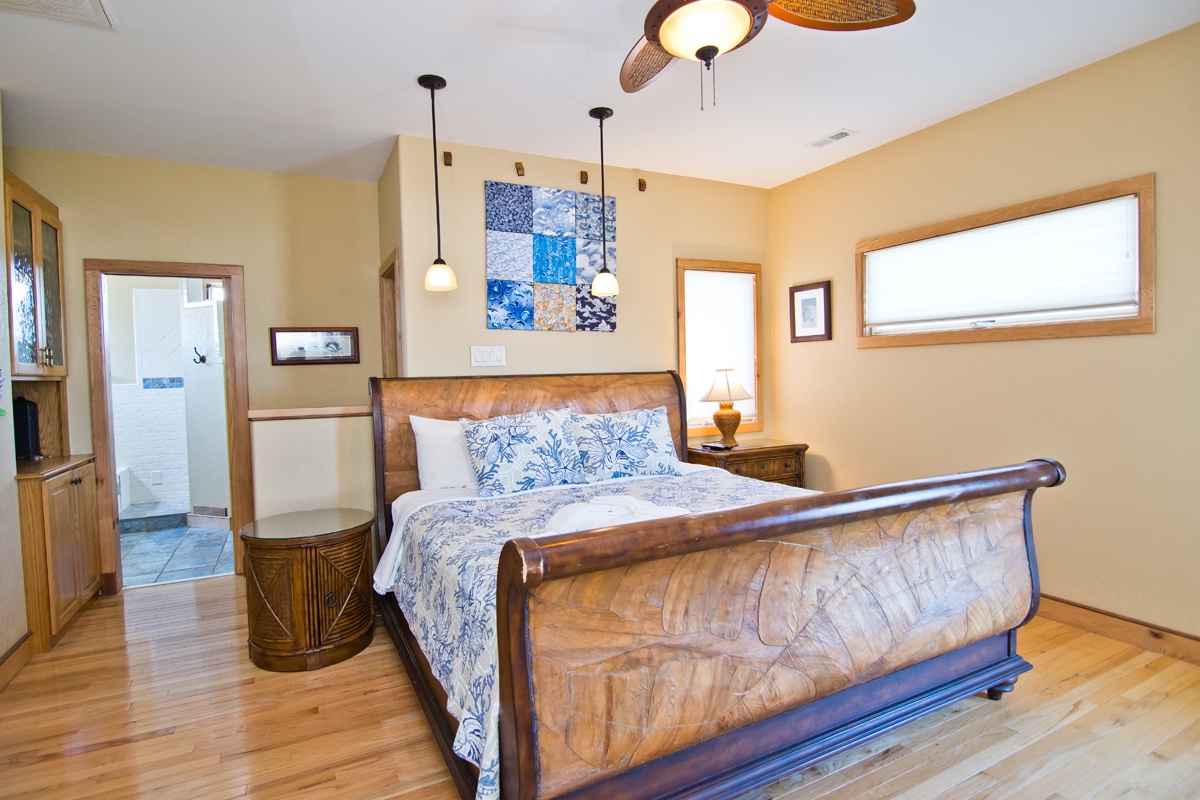 You'll pass a splendid wooden mermaid on the way to Level Two, via the tropical bamboo-slat staircase. Bedroom #3 is just past the Laundry Room and is the "Tiki Room," a bedroom with beach-style written all over it, from the surfboard-themed custom-made quilt on the Queen bed and curtains, to the Hawaiian Tikis and Kukui Nut necklace, and other tropical decorations. It also has a Private Bath. Bedroom #4 is the Master Bedroom. The Master bedroom has beautiful custom-built King head and foot boards designed and crafted by the Home Owner. The room is warm with dark woods, Butterscotch walls, a cozy leather couch, and soft lighting. There is private access to the wrap-around Deck and Ocean views. The Master bathroom is open and light with amazing aqua blue, emerald green and white-flecked tiles throughout. The shower has a Rain-style shower head and is completely open, giving a very "spa-feel" to it. Bedroom #5 The next Master bedroom also has a King bed, covered in a charming, pink tropical bedding. The quilt is even more lovely surrounded by Bubblegum pink walls and soft accents throughout the room. In the center of the room is a delightful "church-peak" ceiling, with oak beams and fantastic lighting, and gives the room an ethereal quality. The windows are large and cover the walls, on the Oceanfront side, allowing for incredible Oceanfront views. If you want even better views there is a private door to the spacious Deck. The private bath beautifully accented with deep Coral floor tiles, has a Garden-style, Jacuzzi bathtub, dual-head shower with seating and a Vanity. Directly next door is Bedroom #6 , another Master bedroom with a King bed covered by a custom quilt created by Mrs. Home Owner. The quilt is layers of bright and summery colors, with turtles swimming through the Ocean. The walls are in a complimentary Mint green and the windows are angled allowing for panoramic Ocean views. The adjacent, private bathroom is decorated in aquas and blues and has a Jacuzzi bathtub, with seating inside of the shower, lovely tiny, pearlescent tiles on the lavatory and an aqua lavatory sink and silver fixtures throughout.
