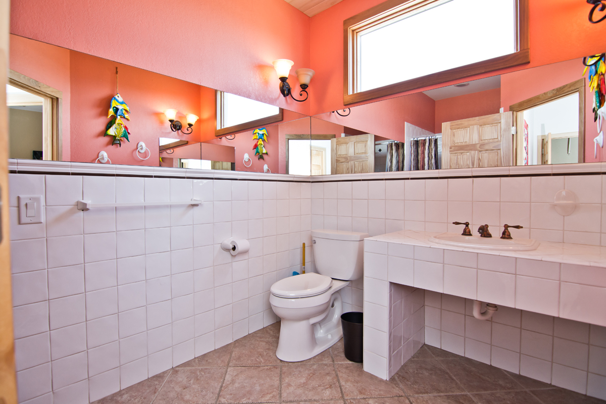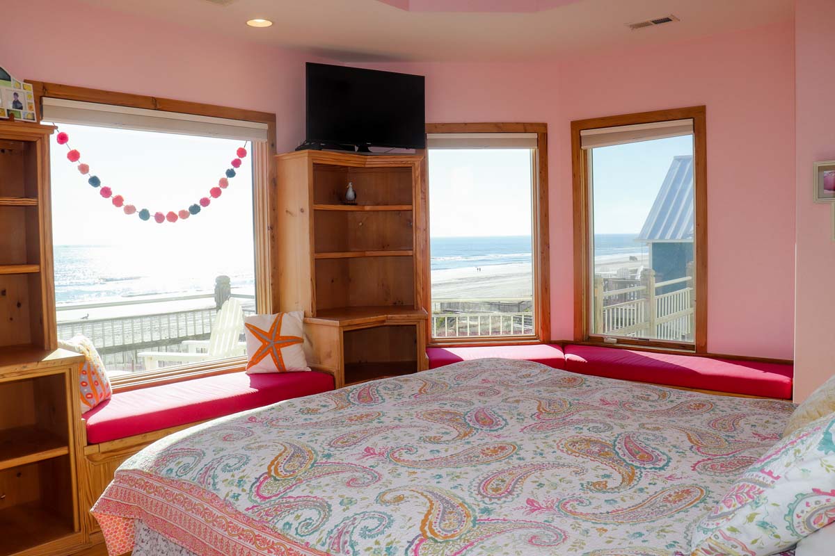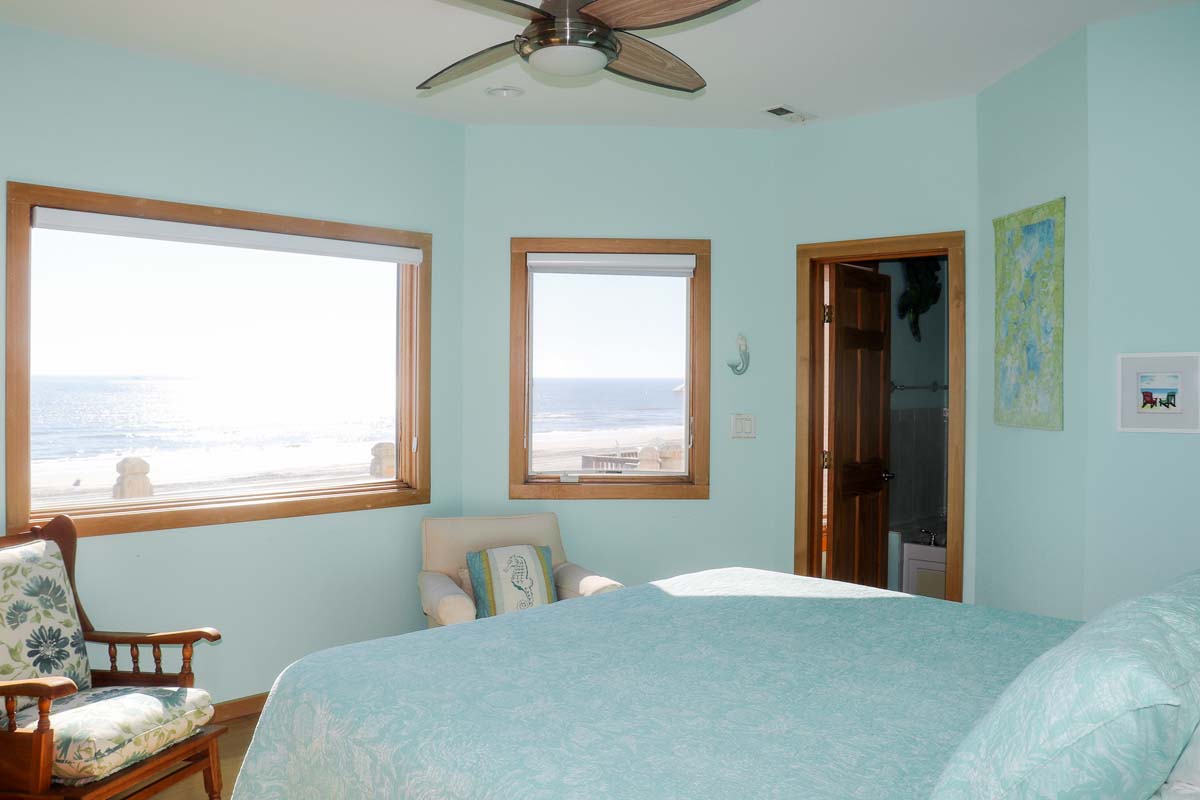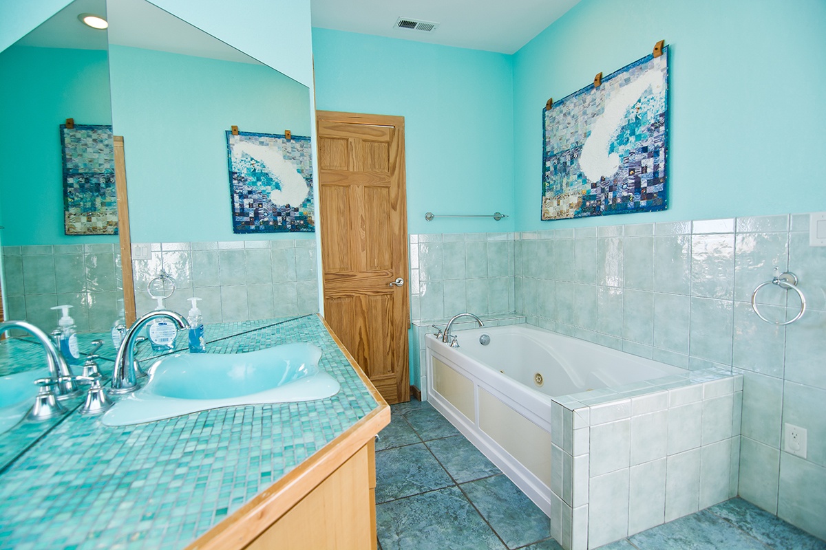 You'll pass a splendid wooden mermaid on the way to Level Two, via the tropical bamboo-slat staircase. Bedroom #3 is just past the Laundry Room and is the "Tiki Room," a bedroom with beach-style written all over it, from the surfboard-themed custom-made quilt on the Queen bed and curtains, to the Hawaiian Tikis and Kukui Nut necklace, and other tropical decorations. It also has a Private Bath. Bedroom #4 is the Master Bedroom. The Master bedroom has beautiful custom-built King head and foot boards designed and crafted by the Home Owner. The room is warm with dark woods, Butterscotch walls, a cozy leather couch, and soft lighting. There is private access to the wrap-around Deck and Ocean views. The Master bathroom is open and light with amazing aqua blue, emerald green and white-flecked tiles throughout. The shower has a Rain-style shower head and is completely open, giving a very "spa-feel" to it. Bedroom #5 The next Master bedroom also has a King bed, covered in a charming, pink tropical bedding. The quilt is even more lovely surrounded by Bubblegum pink walls and soft accents throughout the room. In the center of the room is a delightful "church-peak" ceiling, with oak beams and fantastic lighting, and gives the room an ethereal quality. The windows are large and cover the walls, on the Oceanfront side, allowing for incredible Oceanfront views. If you want even better views there is a private door to the spacious Deck. The private bath beautifully accented with deep Coral floor tiles, has a Garden-style, Jacuzzi bathtub, dual-head shower with seating and a Vanity. Directly next door is Bedroom #6 , another Master bedroom with a King bed covered by a custom quilt created by Mrs. Home Owner. The quilt is layers of bright and summery colors, with turtles swimming through the Ocean. The walls are in a complimentary Mint green and the windows are angled allowing for panoramic Ocean views. The adjacent, private bathroom is decorated in aquas and blues and has a Jacuzzi bathtub, with seating inside of the shower, lovely tiny, pearlescent tiles on the lavatory and an aqua lavatory sink and silver fixtures throughout.
