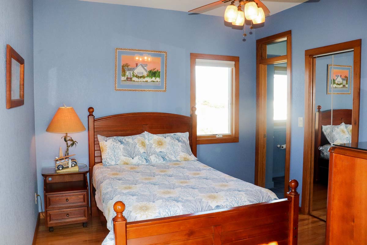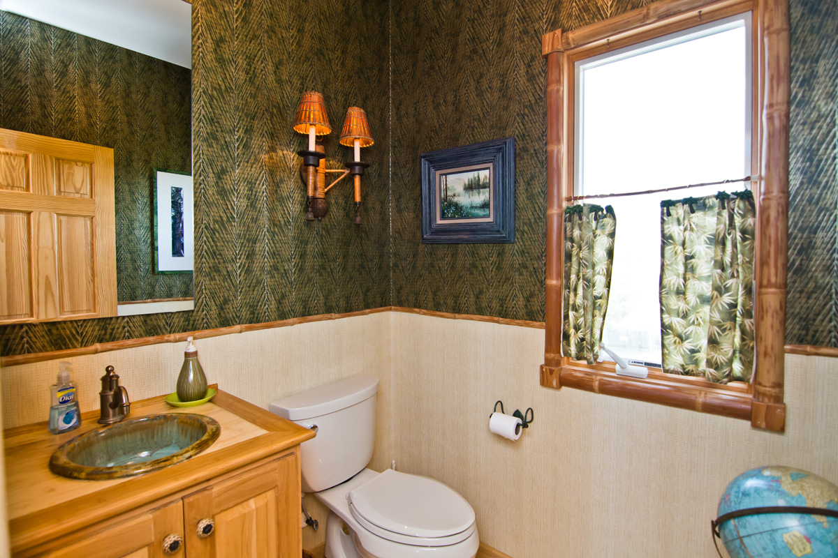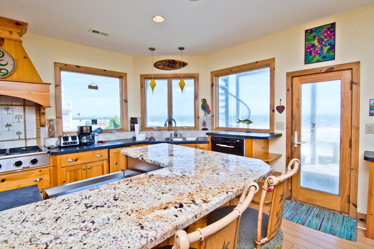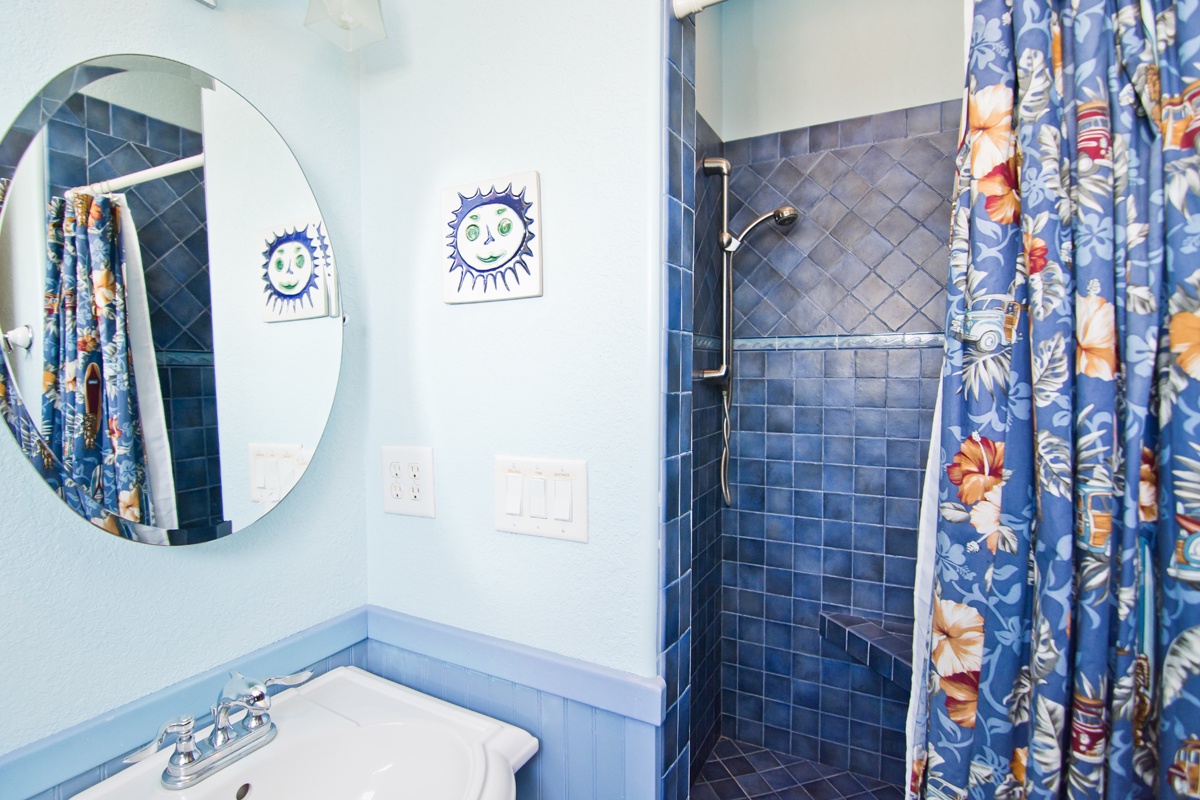 For those that love to dabble in the Kitchen, the extravagant Gourmet Kitchen is on Level One and includes: an Oven, Griddle, 6-Burner Commercial Cook-Top, Large Designer Sub-Zero Refrigerator, Microwave and Dishwasher. The stunning marble-topped Island has a Grill, Vegetable Sink and Trash Compacter. Outside of the Kitchen Area, the Dining Area is warmly decorated with rich light and dark woods and the dining table seats 10. The Dining and Living Areas make up the Great Room and are separated by a Bar, with seating for four. The Great Room is furnished with high-end tropical treatments and the windows, which span from the Kitchen to the Living Area, are floor-to-ceiling and offer fantastic Ocean views. A quaint Sitting Area sits against the windows, with Oceanfront views, next to the main Living Area, with a handsome leather sofa and loveseat. In the Living Area, an attractive Mahogany bookcase/entertainment center encases the Gas Log Fireplace. High-Speed Wireless Internet for your convenience. Next to the Office is a half-bath designed with a tropical theme; bamboo wall-coverings with palm leaves, modern tile-blend lavatory and wood sink. Bedroom #1 The first bedroom on Level One is a quaint room decorated in soft florals, with lovely custom rounded treatments framing the window and around the door leading to the Deck. This room has a Queen bed, with private access to the wrap-around deck and delightful Ocean views. Bedroom #2 The second bedroom has a Double bed with a Twin Bunk Set that was custom-designed and created by the Home Owner. It is a fantastic! The bed hangs from jute-wrapped bars attached to a large wooden fish on the ceiling, with fish embeded into the gorgeous woods, and carved wooden legs. This room is decorated in warm tones, and Butterscotch walls, with tropical accents on the walls and bedcoverings. There is also private access to the wrap-around Deck and Ocean views. The shared bath off the hallway is bright and sunny with Coral walls, colorful ceramic fish lining the main wall and is accentuated with white tiles and copper fixtures.