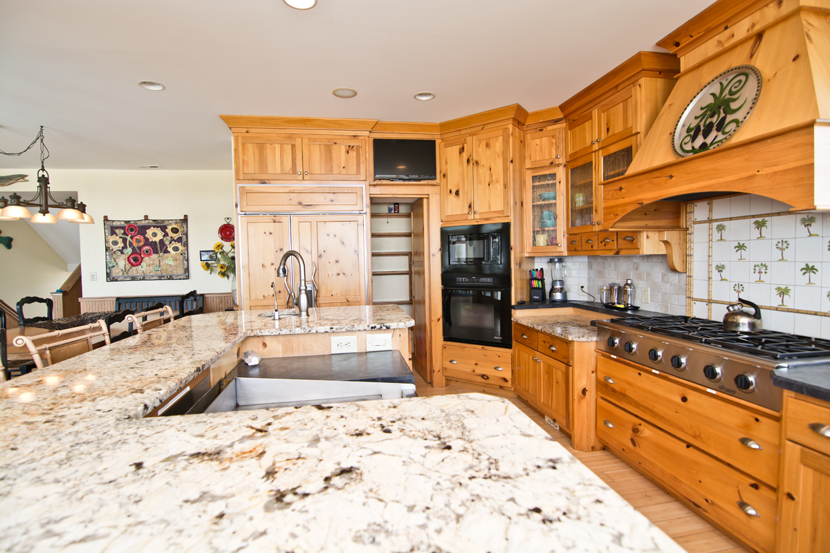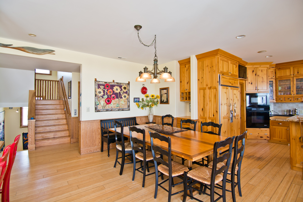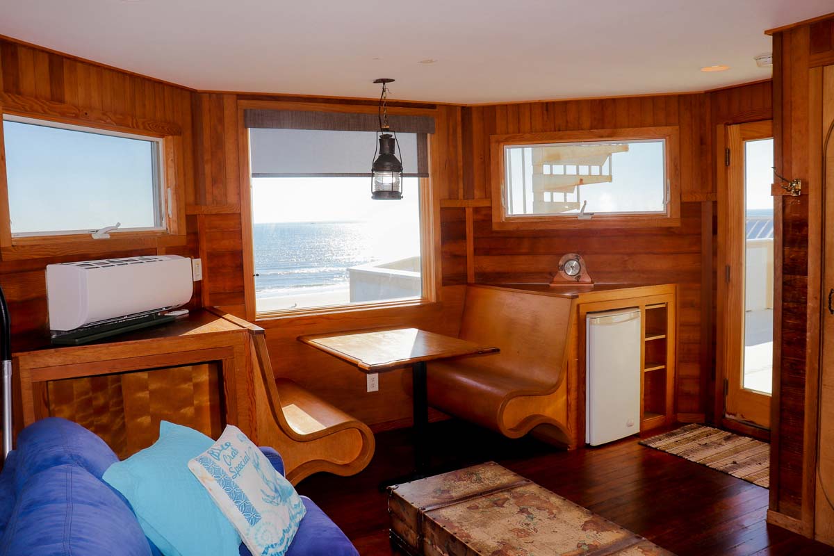 Take the ladder or the Elevator from Level Two to the Observation Room on Level Three and enter a seagoing vessel, complete with portholes into the Steam Bath, with Gold-Plated Fixtures, and the over-sized Full Bath, with a Rain-style shower head. The wooden treatments throughout this home, one such being the door going to the Steam Room, were designed and created by the Home Owner. These special treatments incorporated into this already fantastic home will make your stay here even more satisfying. In this Room, there is ample seating be it on the suede, cobalt blue couch or at the diner-esque hand-carved wooden benches and table. With the large deck outside, and a small Refrigerator this area is a great place for a cozy gathering of friends and family.