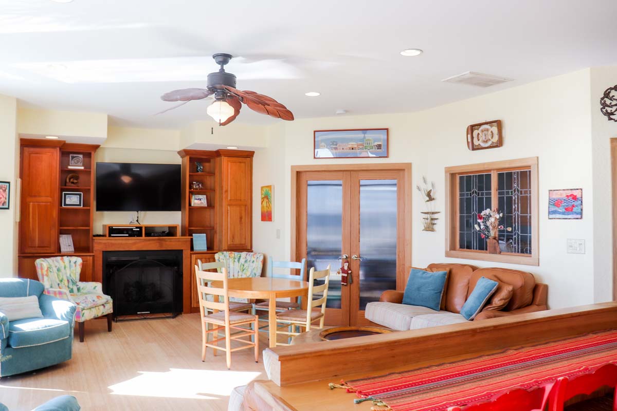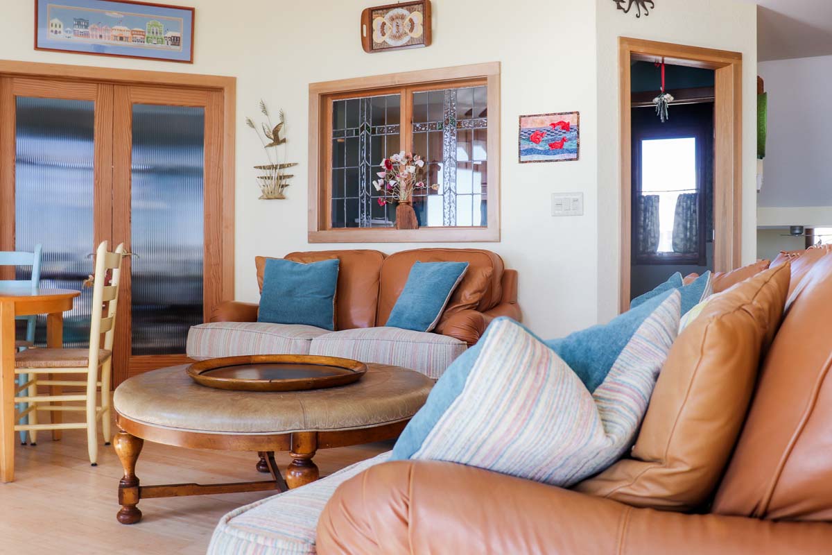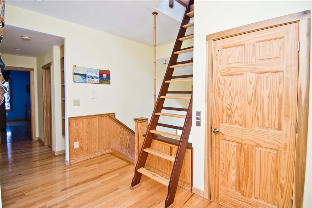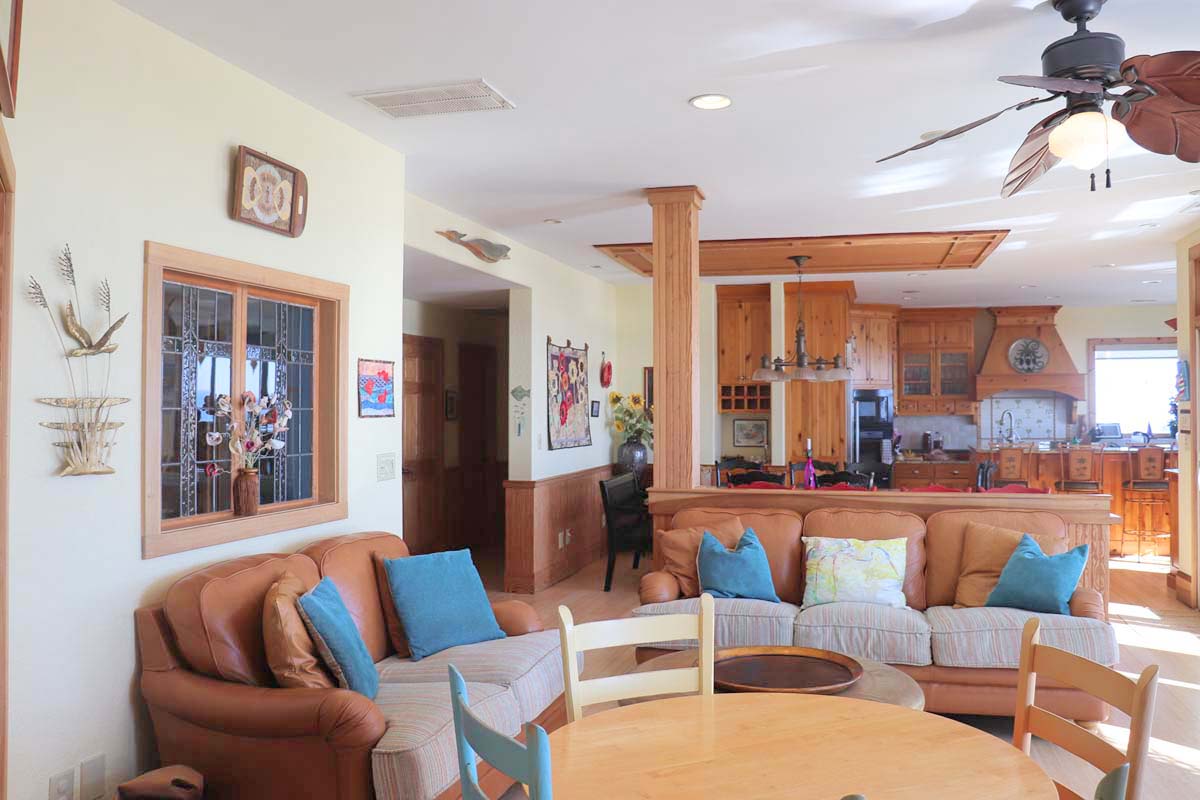 Take the ladder or the Elevator from Level Two to the Observation Room on Level Three and enter a seagoing vessel, complete with portholes into the Steam Bath, with Gold-Plated Fixtures, and the over-sized Full Bath, with a Rain-style shower head. The wooden treatments throughout this home, one such being the door going to the Steam Room, were designed and created by the Home Owner. These special treatments incorporated into this already fantastic home will make your stay here even more satisfying. In this Room, there is ample seating be it on the suede, cobalt blue couch or at the diner-esque hand-carved wooden benches and table. With the large deck outside, and a small Refrigerator this area is a great place for a cozy gathering of friends and family.