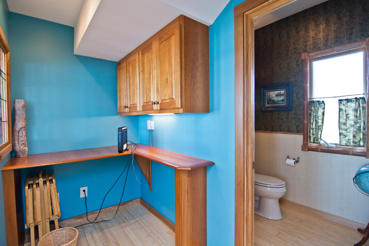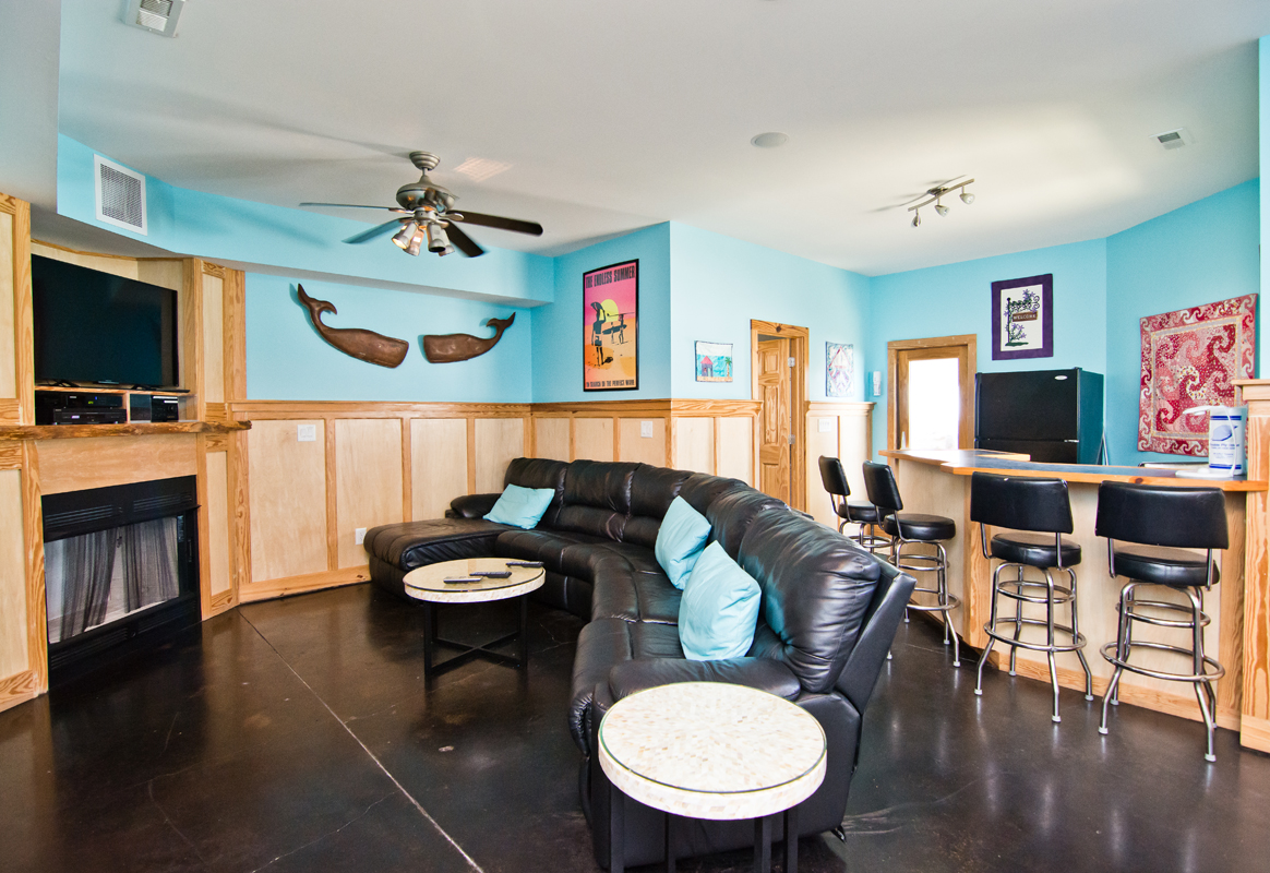 At Ground Level, once inside the beautiful Foyer incorporates an open and luxurious wooden staircase with over-sized windows and tropical bamboo treatments. The nearby Media/Game Room is decorated in an ecletic blend of modern meets old world, dark and light woods meshing together with black and pewter modern details. The Main Room has ample seating for large gatherings, and a charming selection of artwork and decorations are perfect conversation pieces. The private Home Theater has a 3' X 6' Screen with cozy seating for 10. The Pool Table is lit by a Surfboard and backed by a mural-sized World Map and is a great place to relax, sit around with friends and family playing Pool and taking in the fantastic ocean views. There is also a 3-Hole Skill Pool Table and a Sitting Area with a leather couch, a Fireplace, a Sony PlayStation II, and a large Cable Color TV. The Ping-Pong Table is in a private adjacent room. The well-appointed Kitchenette/Bar Area has a Refrigerator and Dishwasher. A Twin Bunk is available and a half-bath is just off of the Kitchenette/Bar Area. The Elevator is accessible on this level.