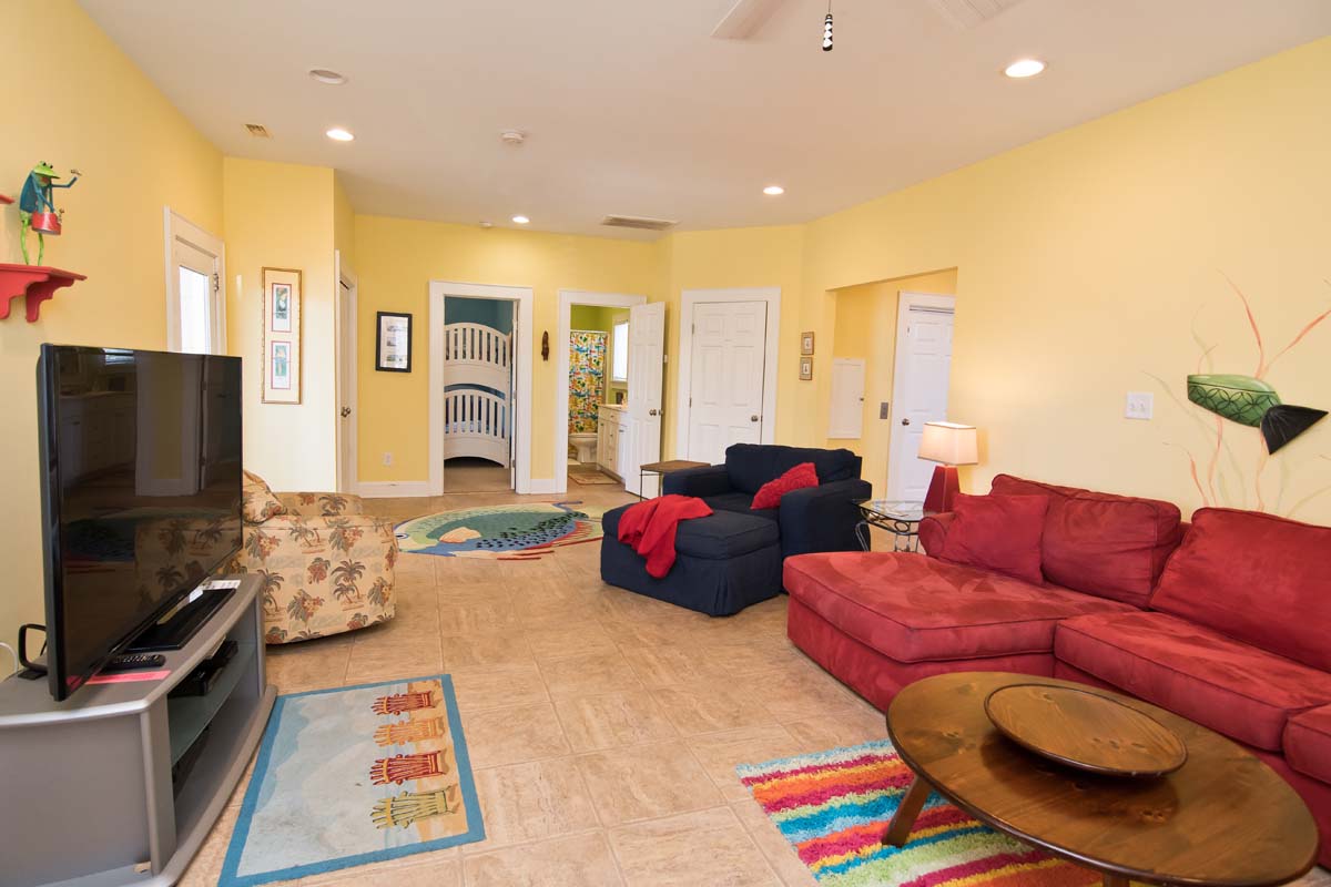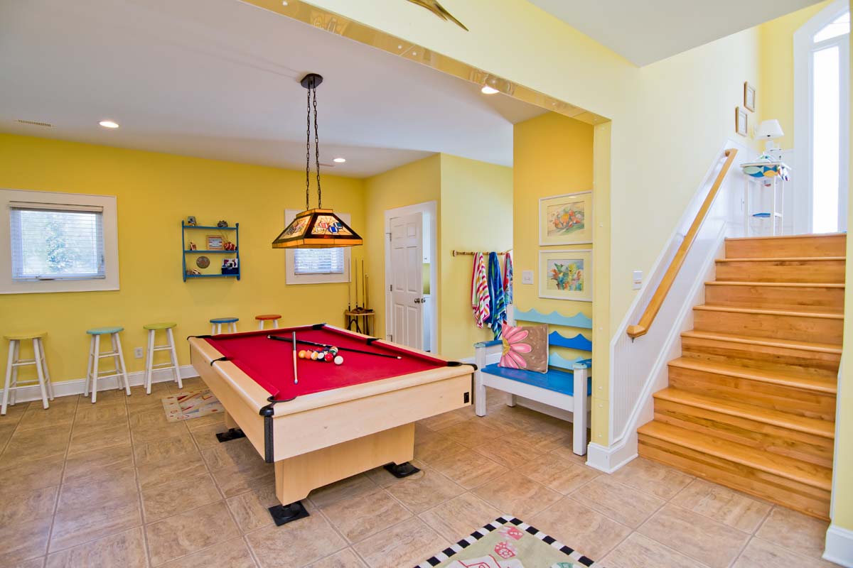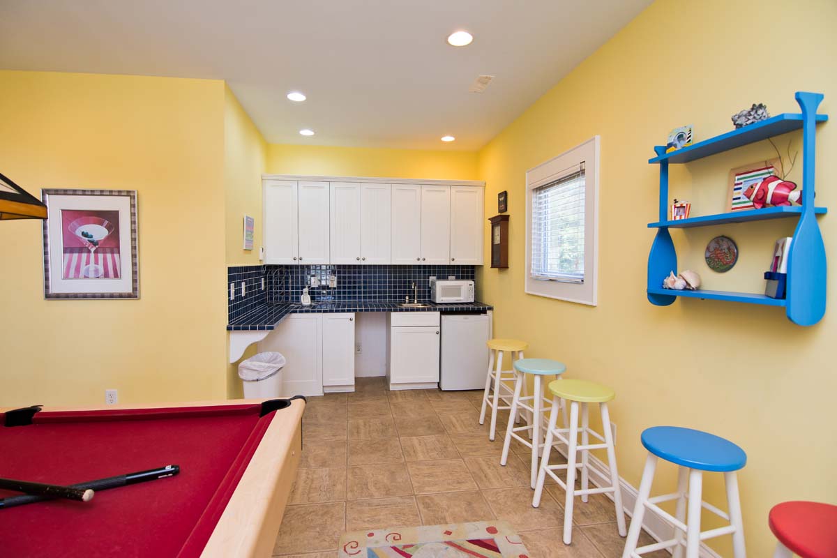 When you enter Sea Notes, at Ground Level, the first rooms you see are the bright and fun Media and Game Rooms. The Media Room is decorated in lively primary colors and furnished with a Cherry, suede-like sectional and over-sized, Denim blue chair. The walls are full of sea life, from the entertaining musical frogs to the brilliantly colored fish making their way through sea reeds. Next door is the Game Room - in the middle of the Game Room sits a Fire Engine Red Pool Table, and is cornered by a deep blue-tiled Kitchenette, with a Microwave and Refrigerator. Next to the Pool Table is a charming, hand-crafted bench that was created by a local wood worker. It has an Ocean Wave-styled back and large blue fish armrests, perfect for a home at the beach!