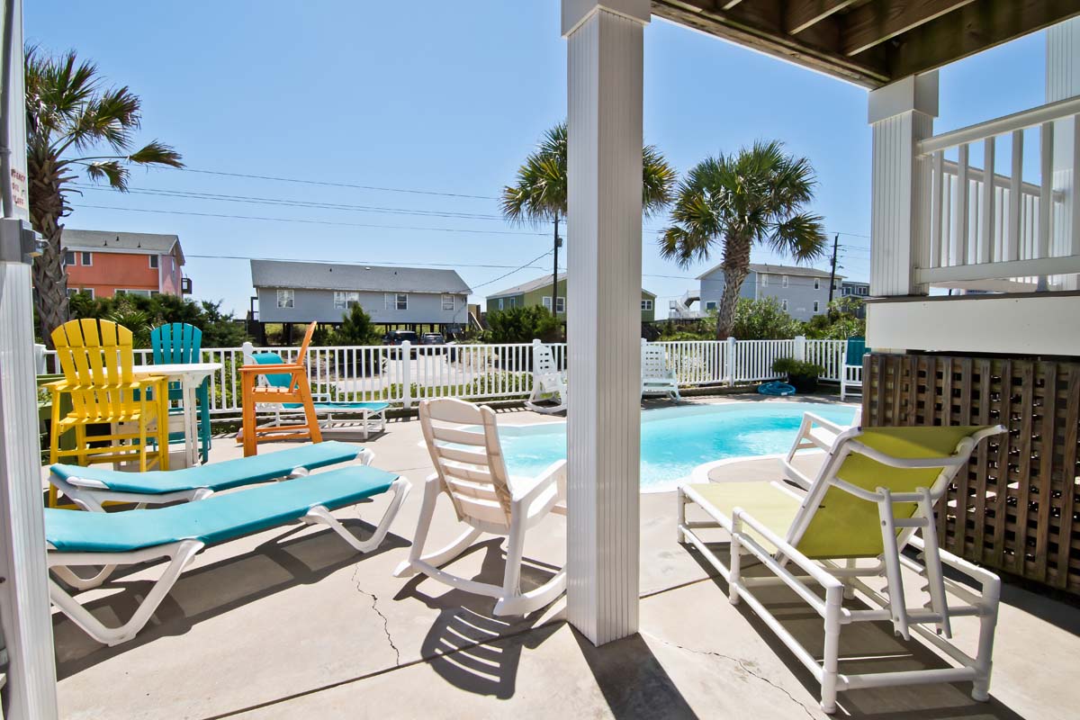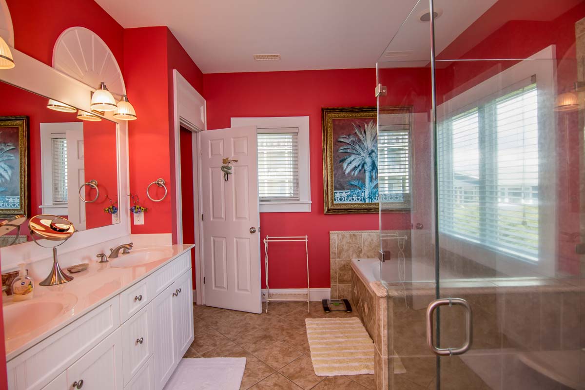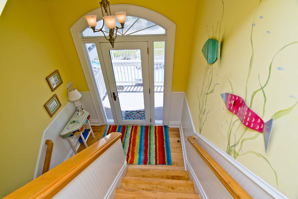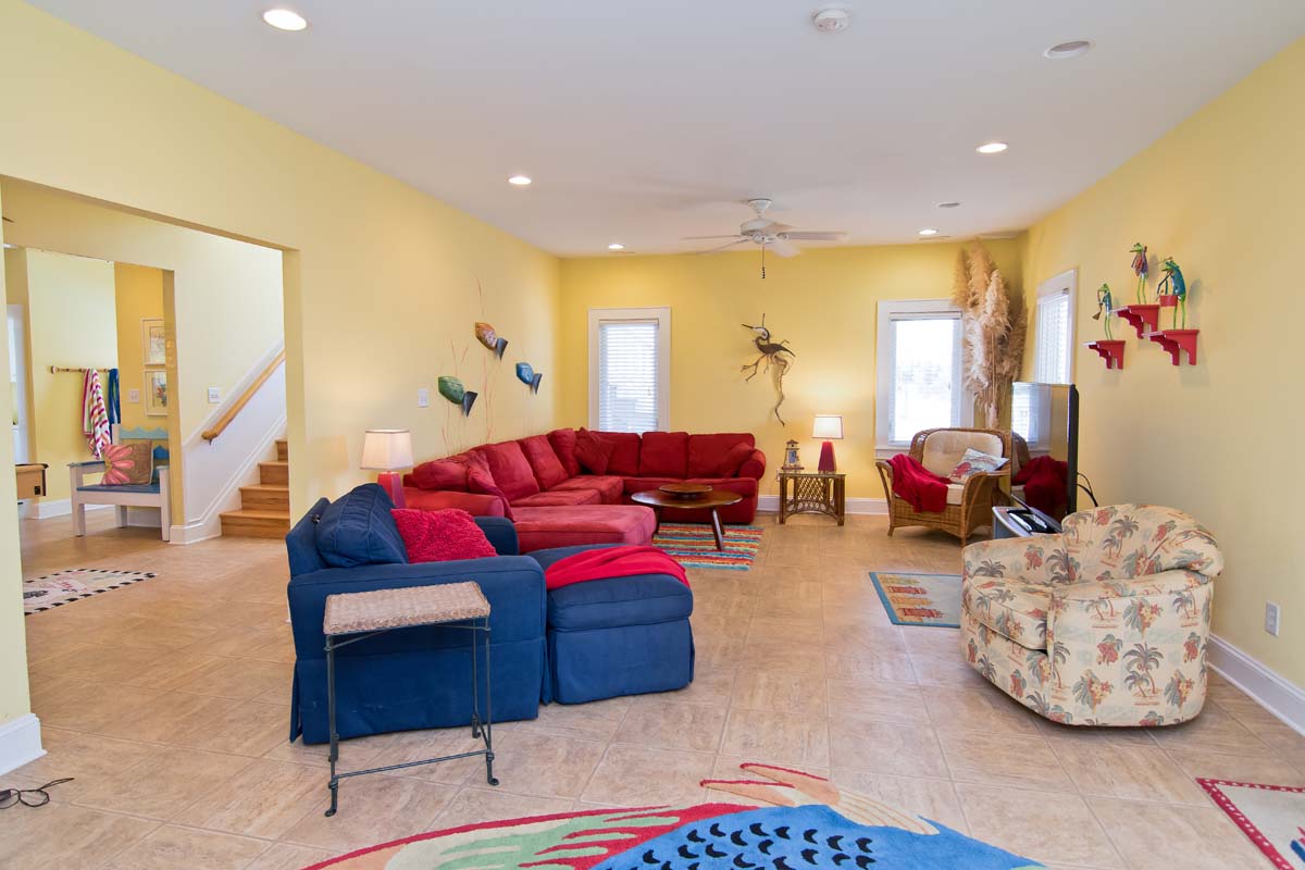 When you enter Sea Notes, at Ground Level, the first rooms you see are the bright and fun Media and Game Rooms. The Media Room is decorated in lively primary colors and furnished with a Cherry, suede-like sectional and over-sized, Denim blue chair. The walls are full of sea life, from the entertaining musical frogs to the brilliantly colored fish making their way through sea reeds. Next door is the Game Room - in the middle of the Game Room sits a Fire Engine Red Pool Table, and is cornered by a deep blue-tiled Kitchenette, with a Microwave and Refrigerator. Next to the Pool Table is a charming, hand-crafted bench that was created by a local wood worker. It has an Ocean Wave-styled back and large blue fish armrests, perfect for a home at the beach!