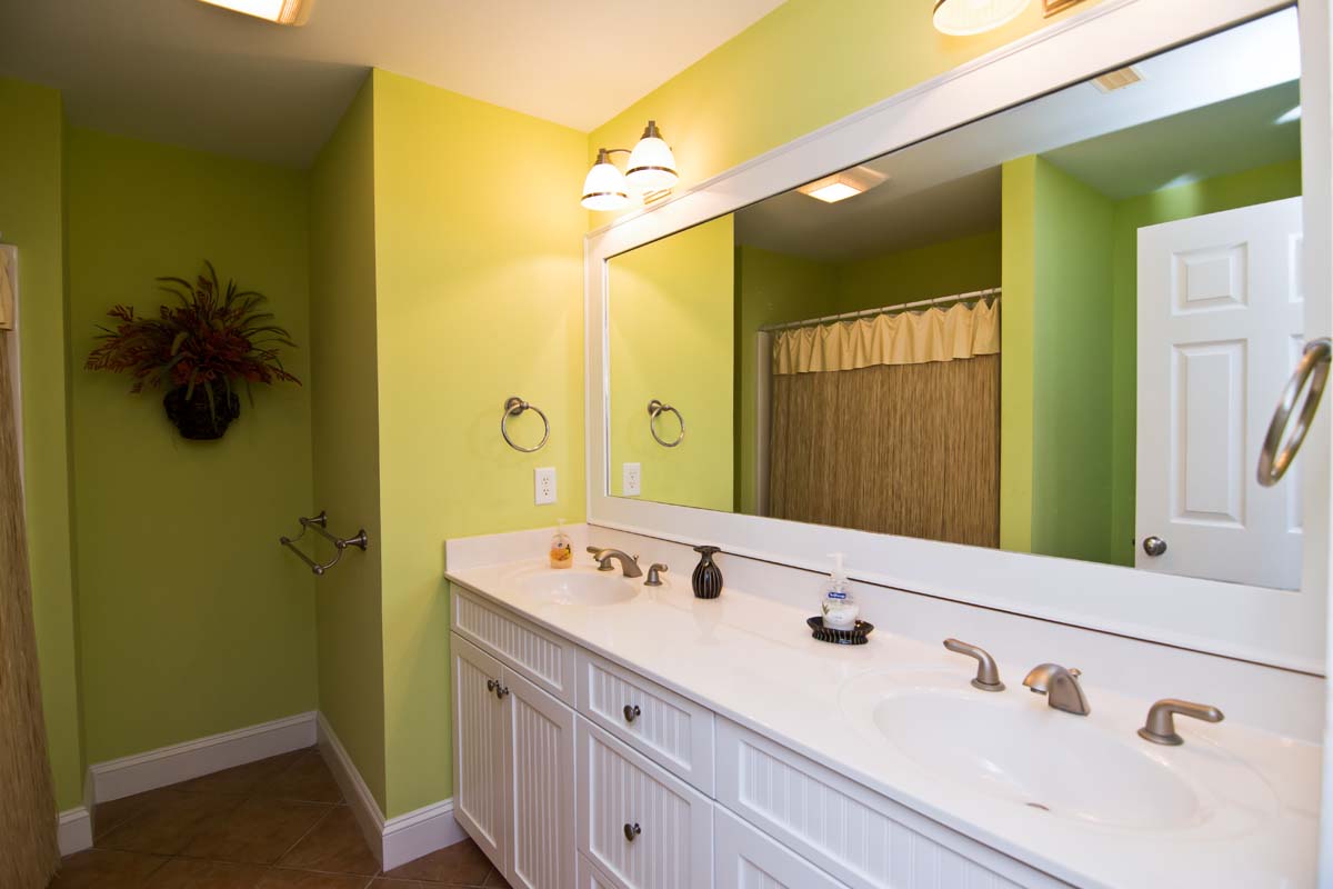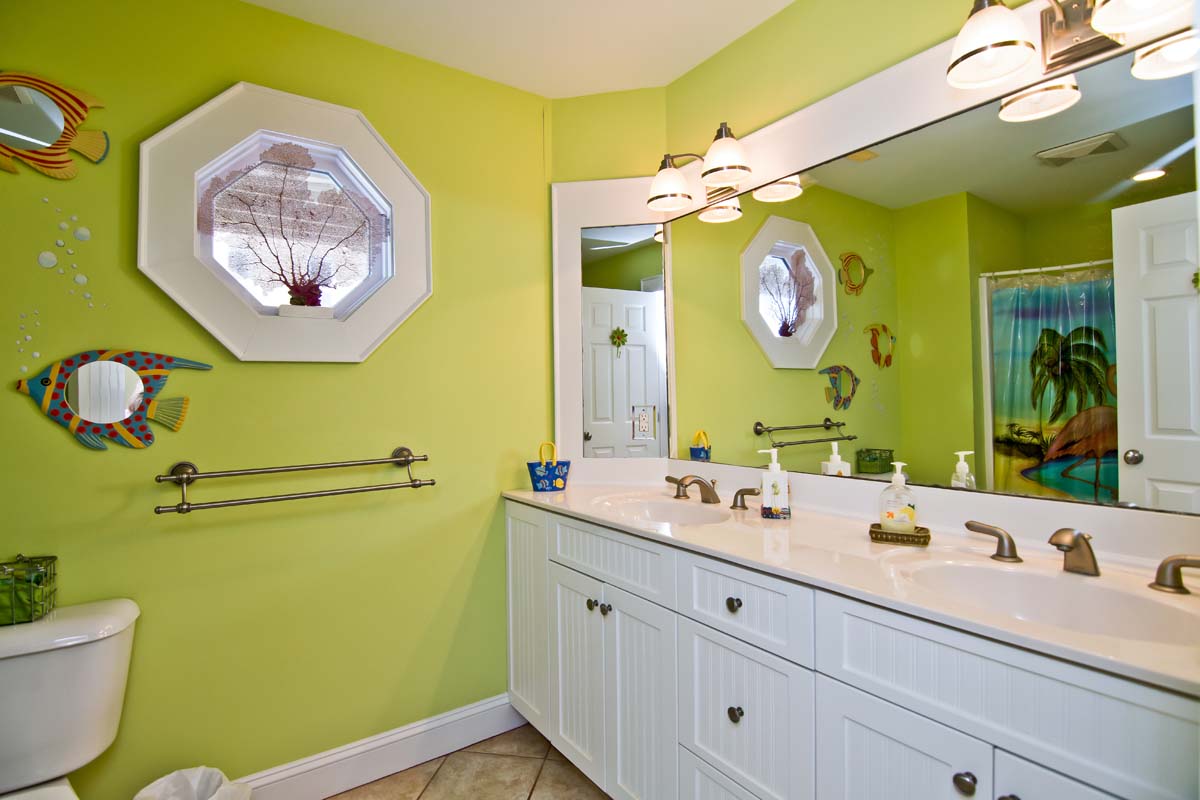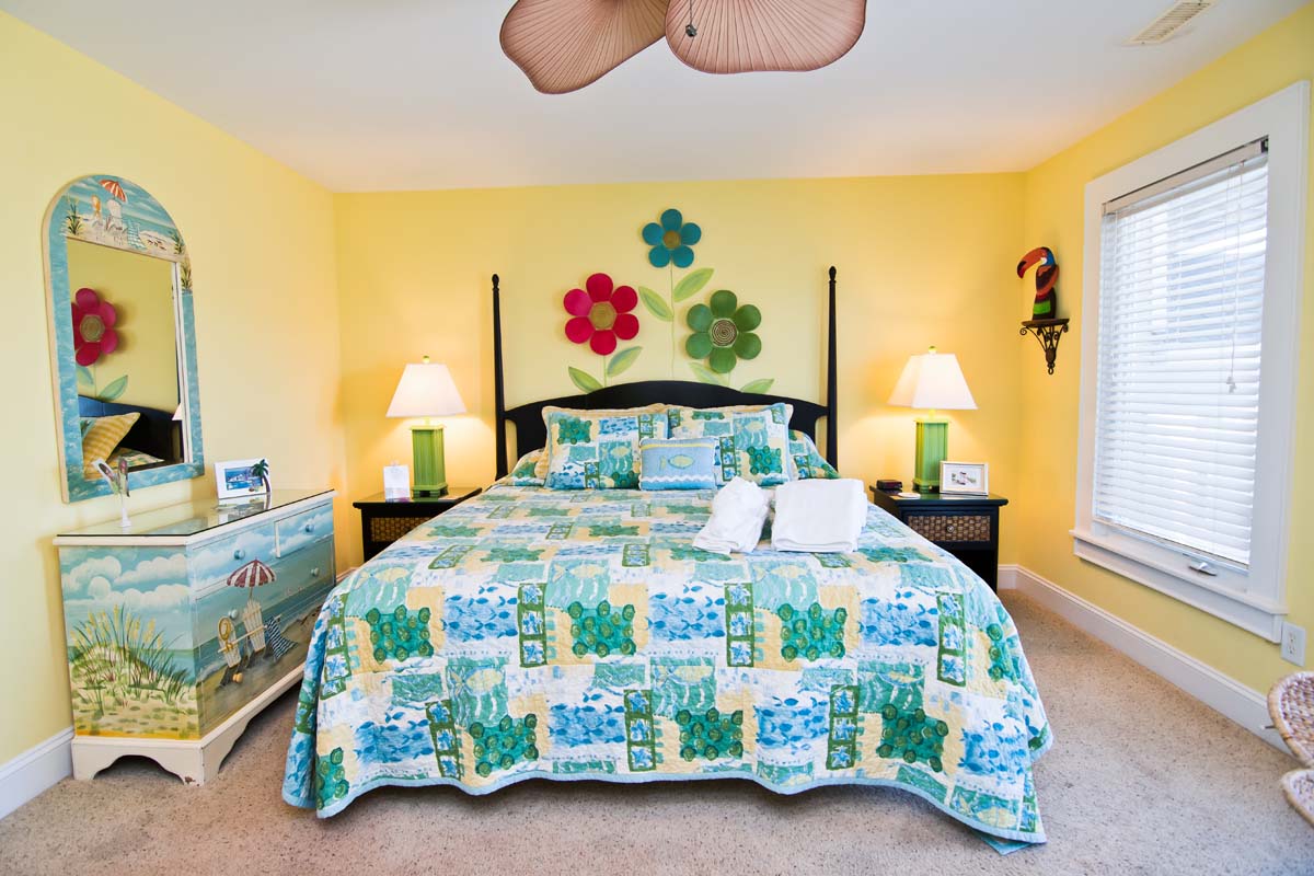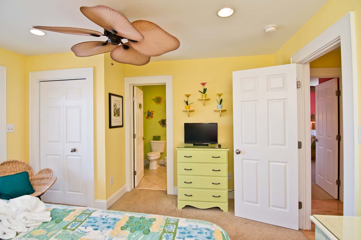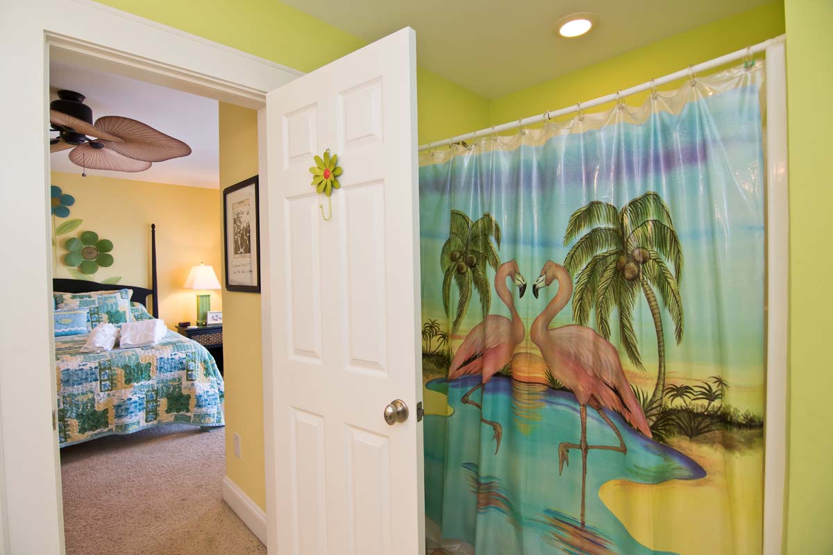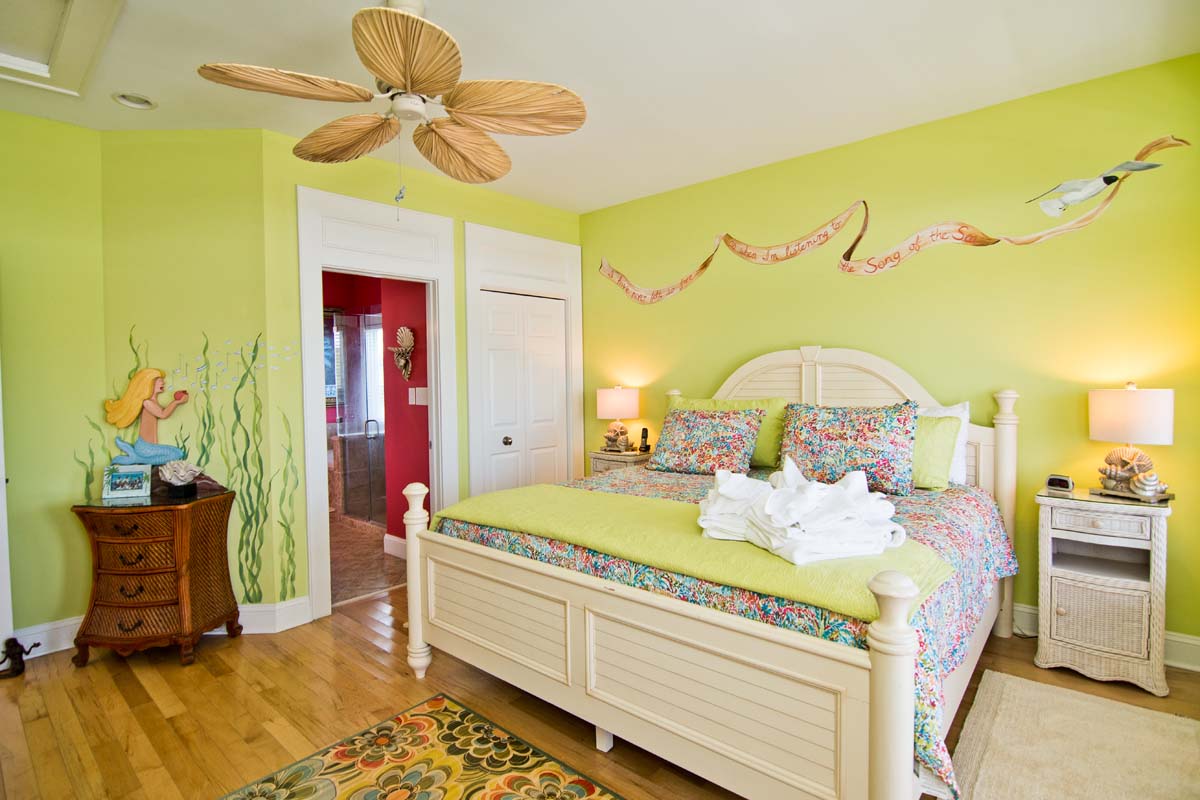 On the way to the 2nd bedroom, on Level One, there is so much to take-in as you walk through the delightful "marine life" hallway and over the over-sized and brightly colored fish-shaped area rug! In the 2nd bedroom, the "Summer Time" room, there is a King bed, and an abundance of eclectic art adorning the walls. The furnishings have a tropical, Indonesian-inspired feel and are a great match for the bamboo and additional treatments found throughout the room. The full-bath, in this room, is unusually bright and "beachy," with fish spouting air bubbles from the Melon walls.