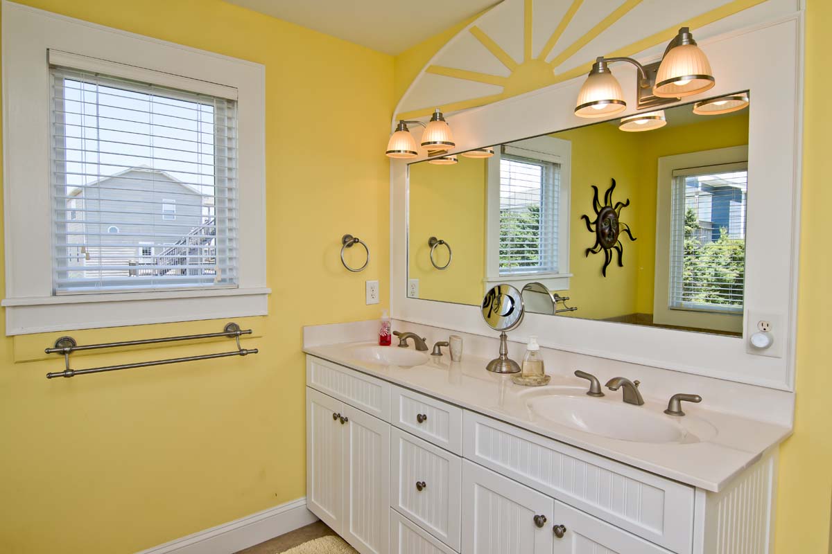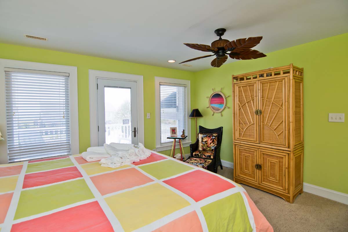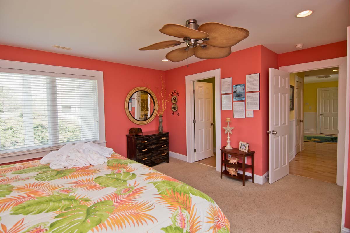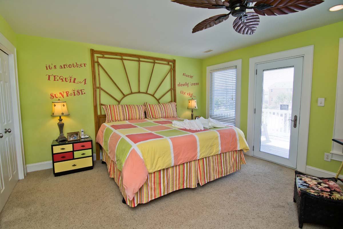 Navigate over to the spirited sailboats and stripes-themed bedroom, located next to the Media Room, with a Double Twin Bunk Set and a Twin Bunk Set...it is a perfect place for the kids. The adjoining bathroom is complimentary with its brightly painted walls and marine-themed decorations and the kayak paddle towel bar is a perfect touch! Even the stairways are delightful! Both of the stairways are brightly painted, and are full of marine-themed knick-knacks and furnishings, and the first stairway is even painted with a lovely marine life mural! You'll love to wake up in the "Tequila Sunrise" Bedroom!