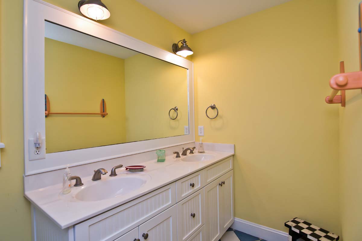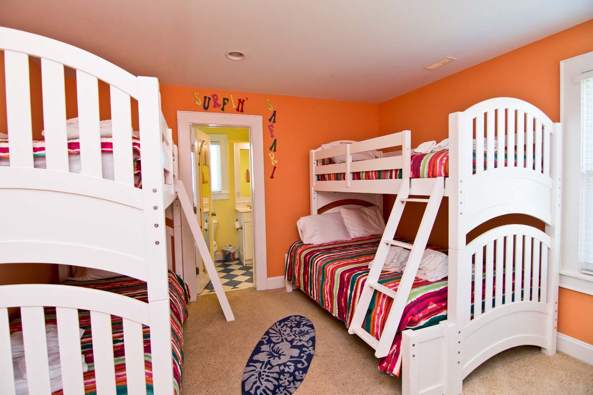The kids will be crazy about the "Surfini Safari" bedroom! "Surfini Safari" is also on Level One allowing the kids easy access to the adults on the trip. The Twin and Double/Twin Bunk Sets are bedecked with lively striped bedcoverings which are made even brighter against the Tangerine walls. The Surfboard mirror and Surfboard handles, a unique addition to the chest of drawers, match perfectly with the beachy scenes found in the adjoining full-bath. This room is so kidcentric there are even colorful footstools at the lavatories!