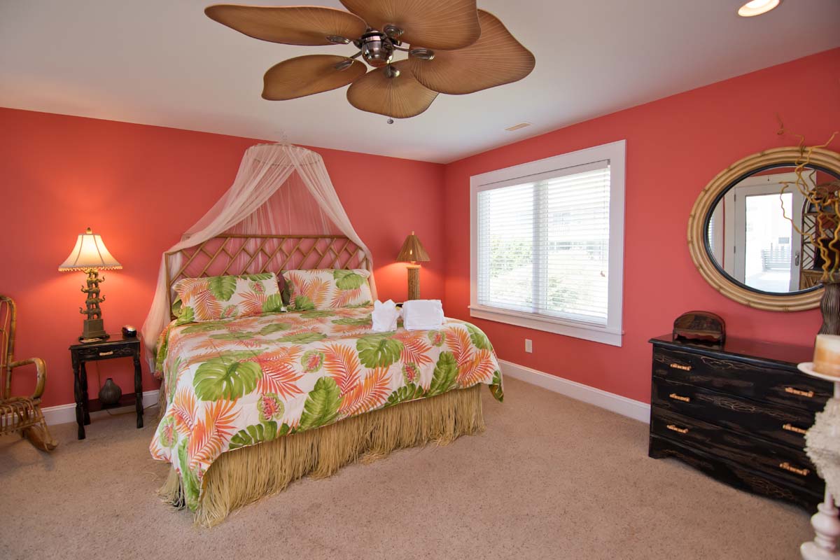 The "Bali Hai" bedroom, also on Level One, is named for the famous and fabulous musical "Bali Hai." The sheet music to "Bali Hai" is framed and hung against deep Salmon walls. Also making this bedroom special are the other tropically-inspired treatments, such as, the Raffia Hula bedskirt on the King bed, which is also drapped with romantic mosquito netting over the top of the bamboo headboard, the Raffia Hula skirt shower curtain in the bathroom, and Indonesian-inspired object art.