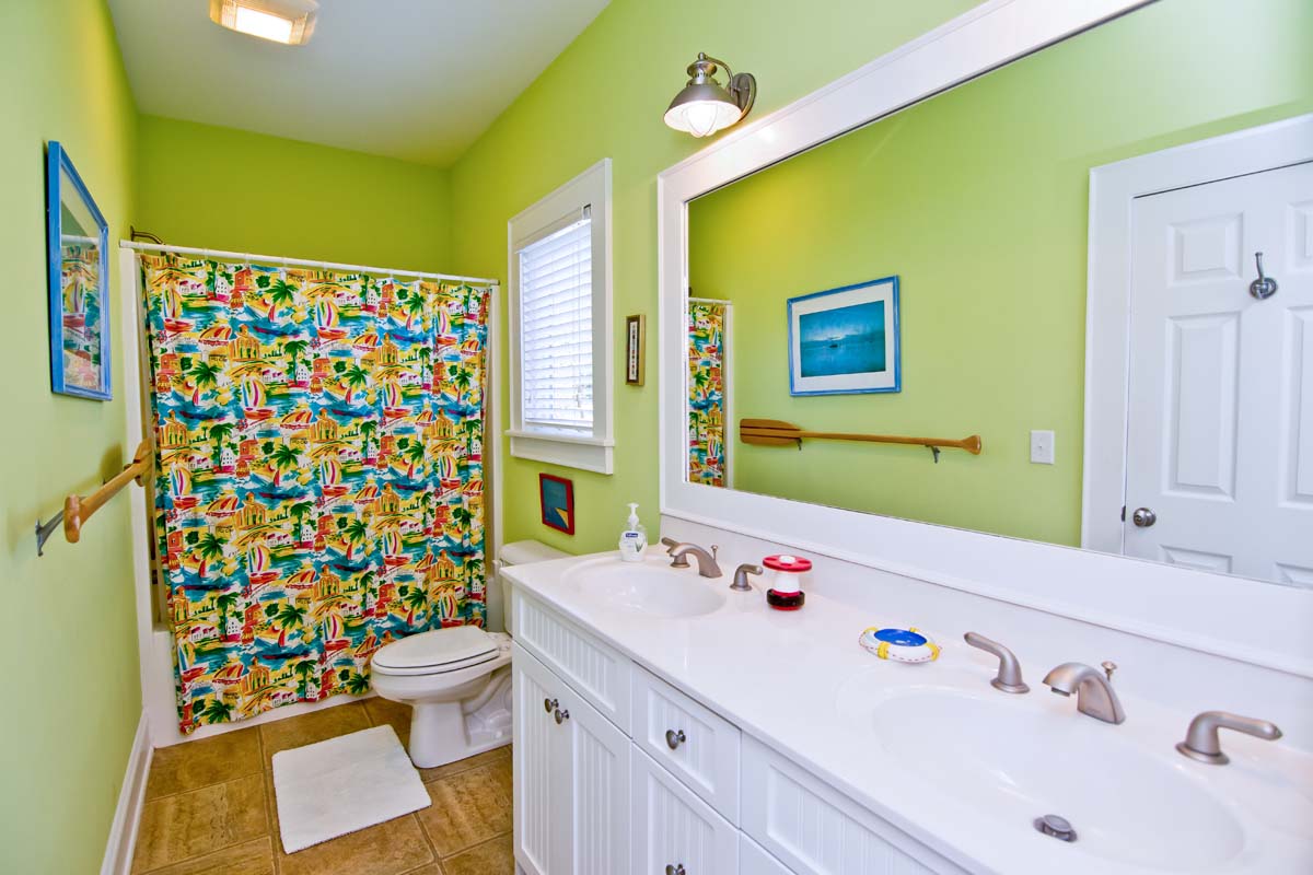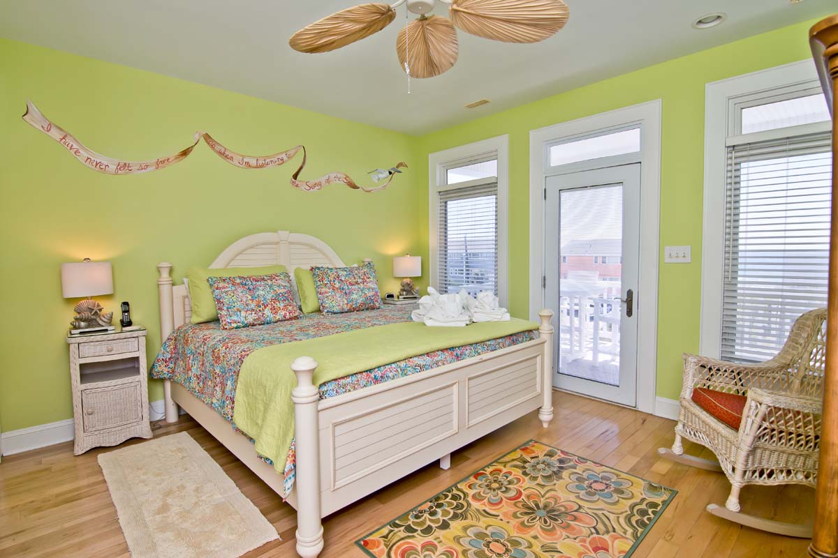 The bedroom on Level Two is absolutely bright & lovely! On the stunning hardwood floor sits a King bed which is adorned with delightful designer bedcoverings in Persimmon, Melon & Butterscotch, against Antique White head and foot boards. The adjoining full-bath has a tub, private water closet, and separate glass shower. The real highlight of this room, and a tribute to the Island, are the lovely murals decorating the walls...one of a lovely mermaid swimming with a small school of fish and the other, doves carrying a flowing banner over the bed that reads, "I have never felt so free as when I'm listening to the Song of the Sea." This is a special vacation home and the Homeowner has made sure it stays that way. Stay at Sea Notes and find out for yourself what makes this place so fantastic!