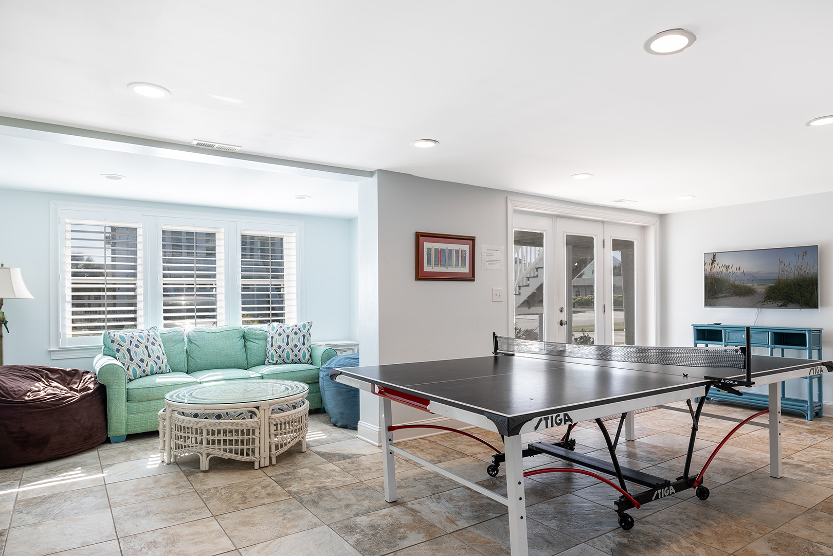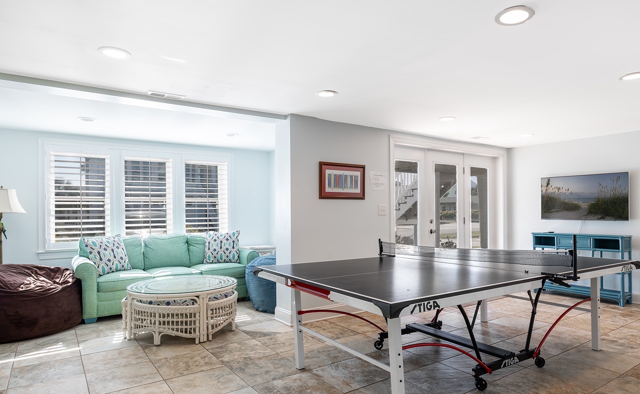 Ground Level: Game Room with TV, seating area and ping pong table. Bedroom #3 Queen bed with Flat Screen TV. Bedroom #4 double/twin bunk with Flat Screen TV. Bedroom #3 and #4 share hall.Washer and Dryer can be found on this level.