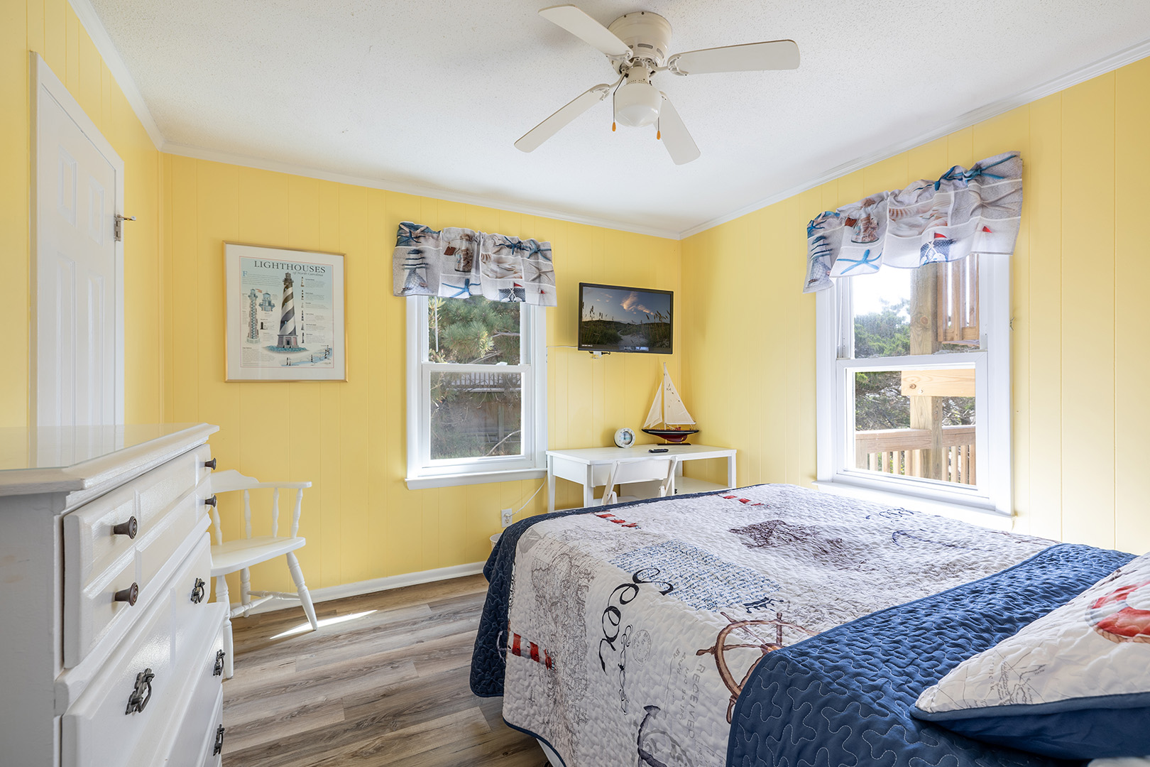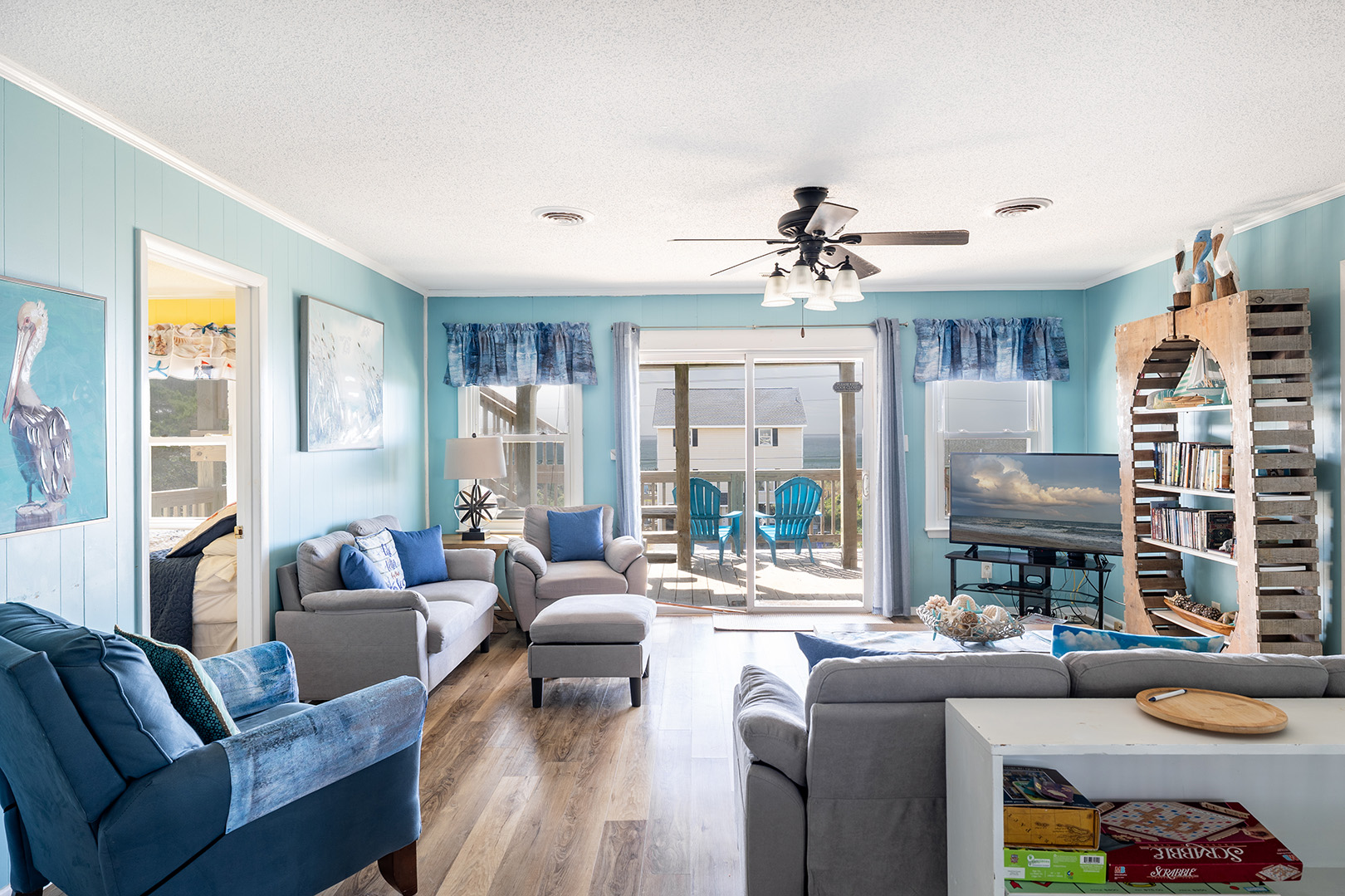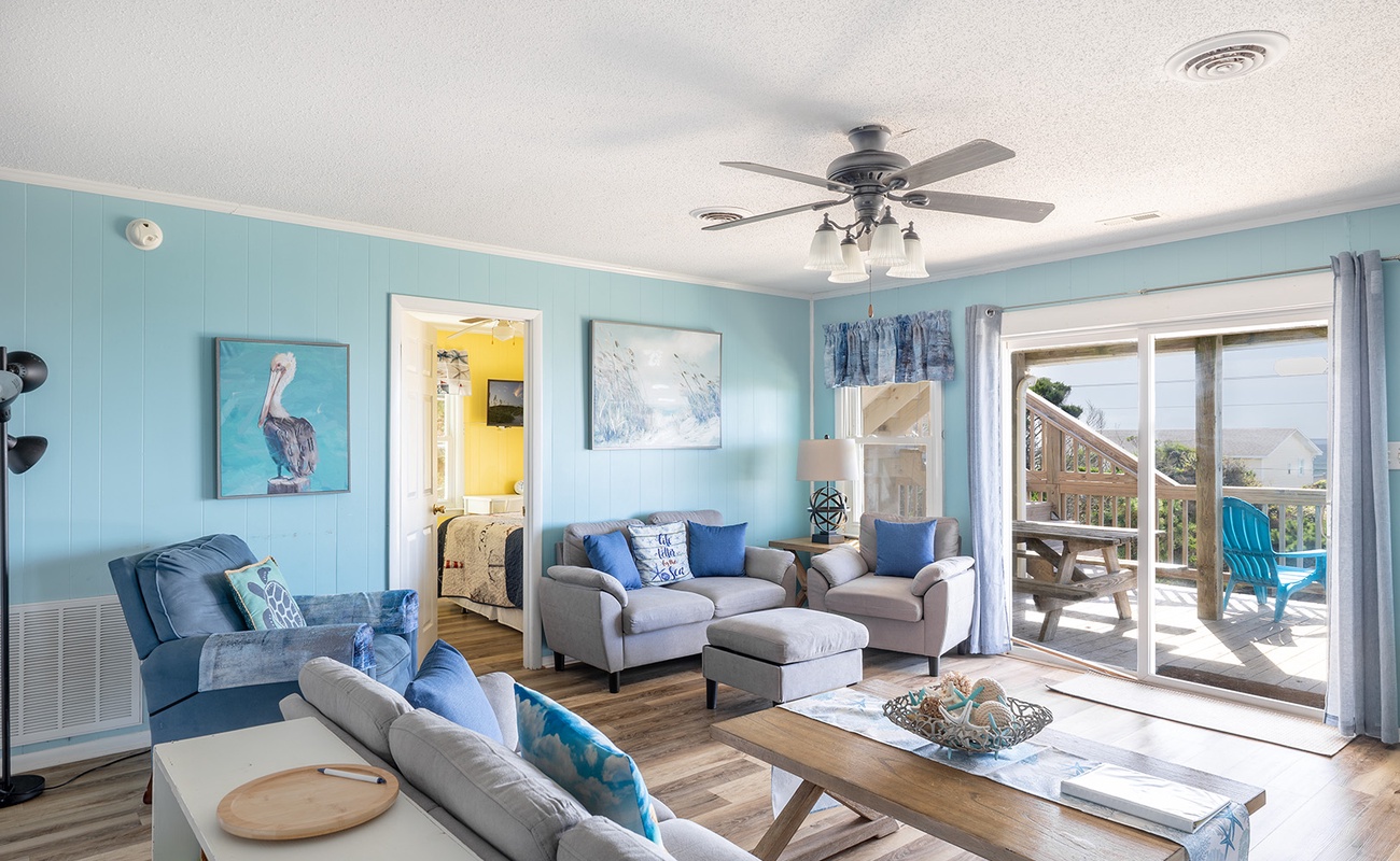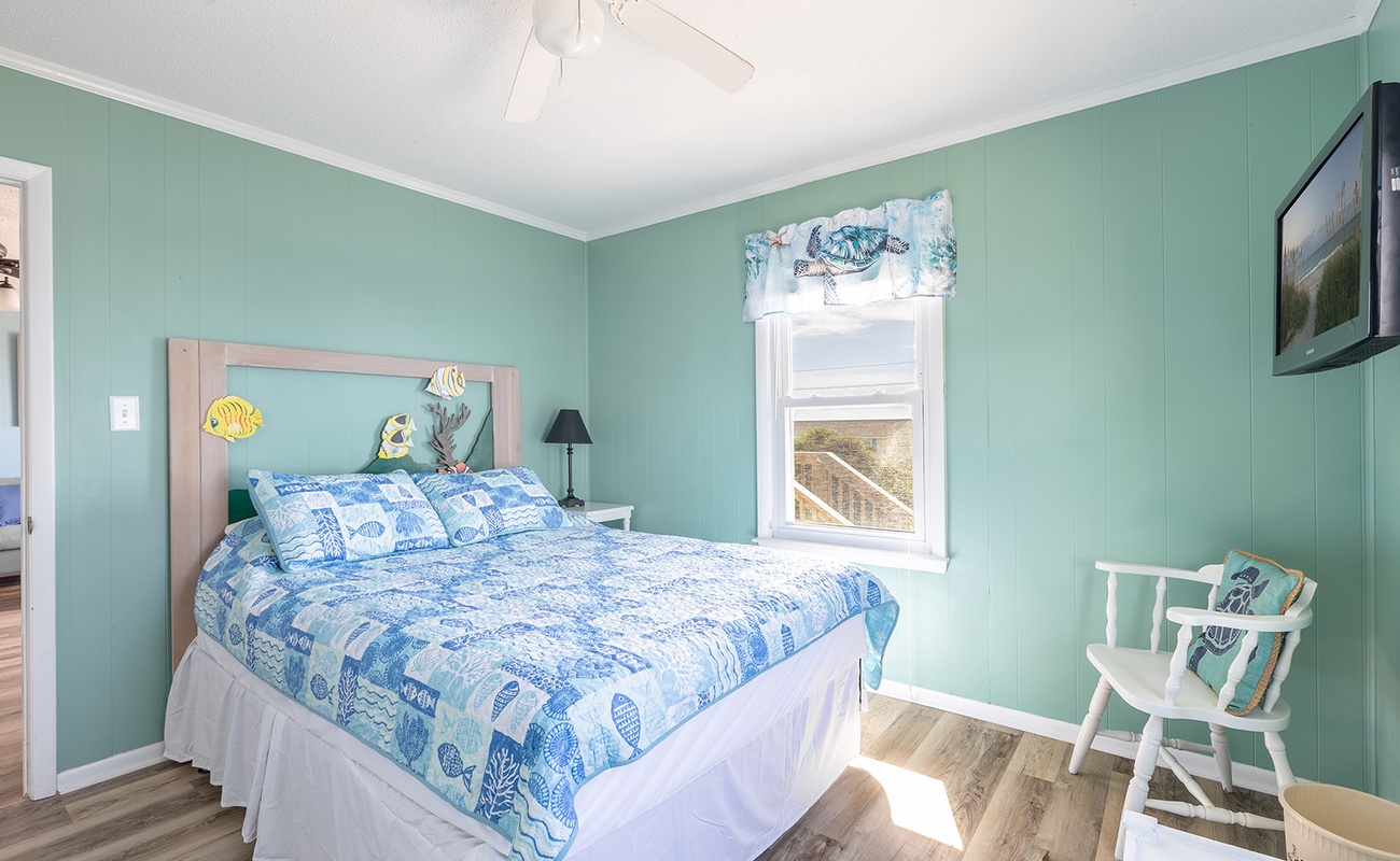 Level One: Bedroom #1 has a Queen and Flat screen TV. Bedroom #2 has a Queen Bed. Bedroom #1 and #2 share a bath. Bedroom #3 has a Queen and a flat screen TV. Bedroom # 4 has a Twin Bed, a Twin Bunk Set, Flat Screen TV with DVD Player - Bedroom #3 and #4 share a bath. There is an open kitchen, dining and living area with deck access. The living room features a flat screen TV with DVD Player and beautiful ocean views.
