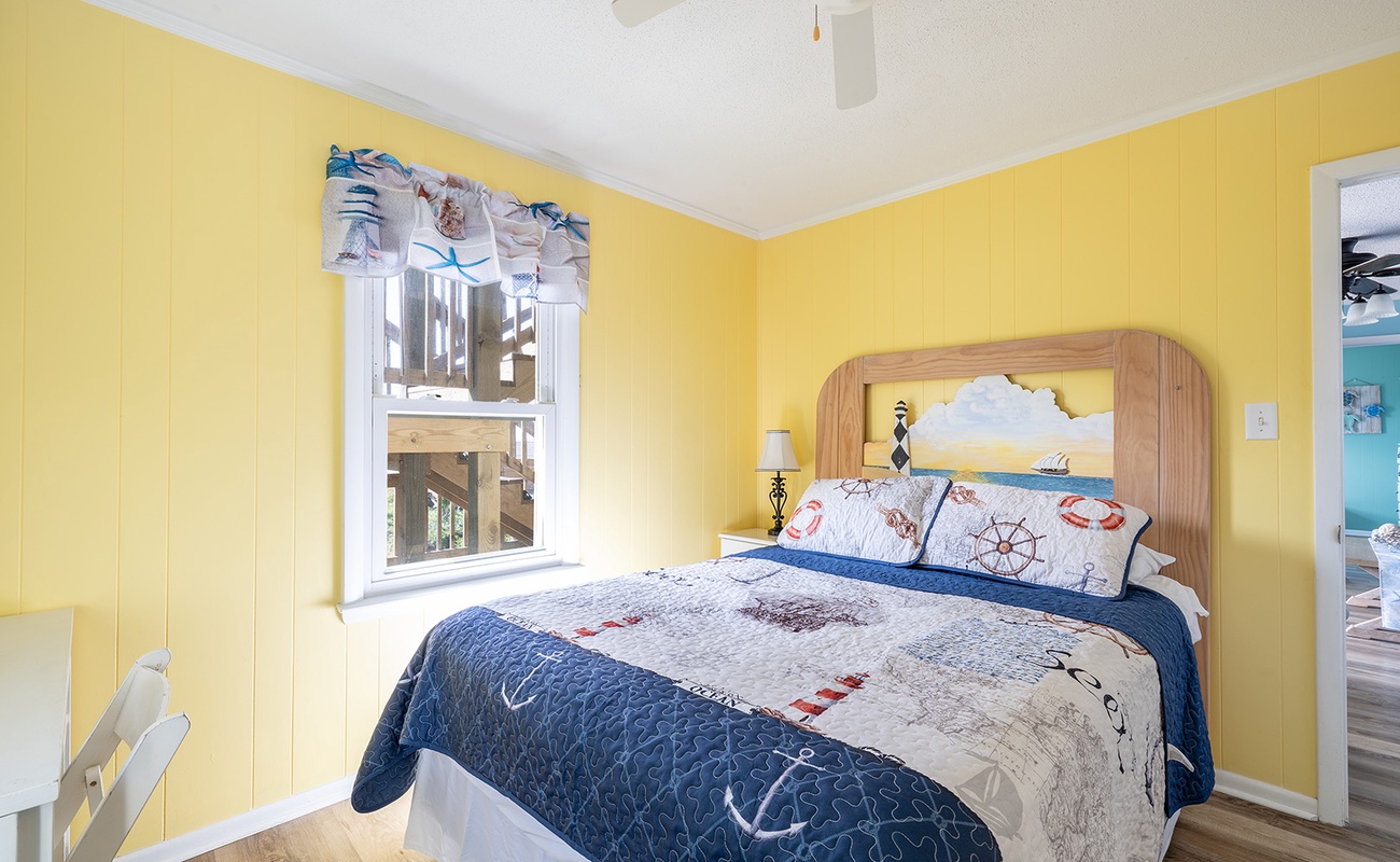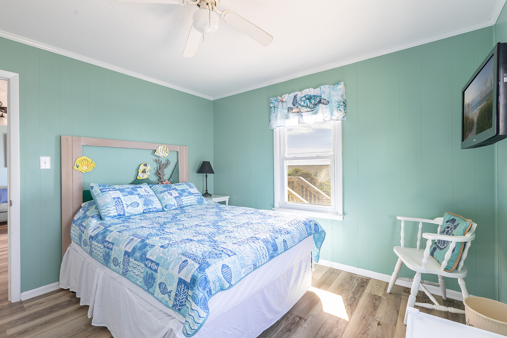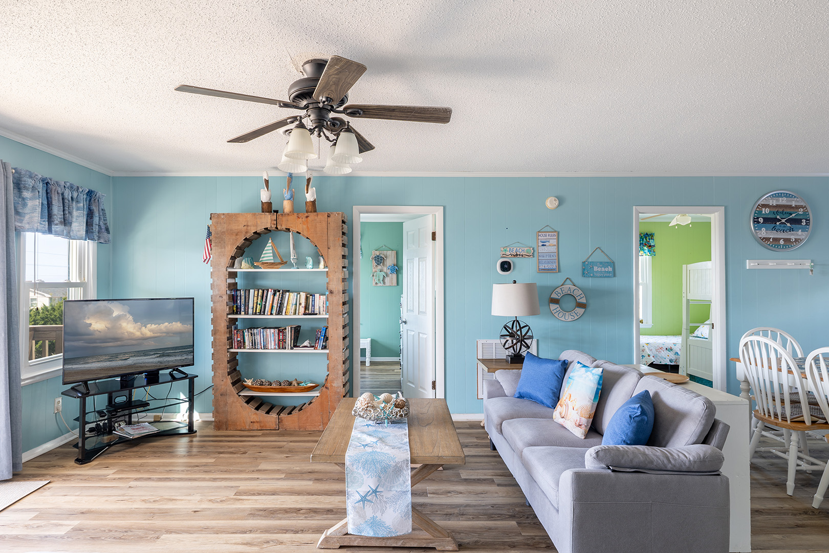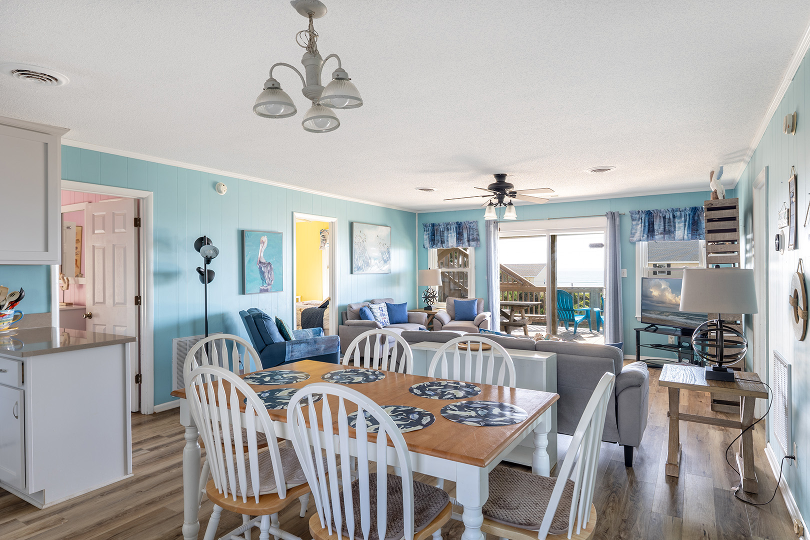 Level One: Bedroom #1 has a Queen and Flat screen TV. Bedroom #2 has a Queen Bed. Bedroom #1 and #2 share a bath. Bedroom #3 has a Queen and a flat screen TV. Bedroom # 4 has a Twin Bed, a Twin Bunk Set, Flat Screen TV with DVD Player - Bedroom #3 and #4 share a bath. There is an open kitchen, dining and living area with deck access. The living room features a flat screen TV with DVD Player and beautiful ocean views.