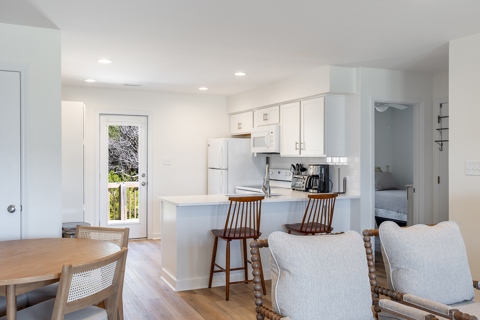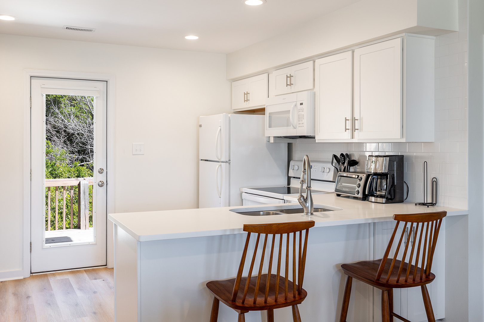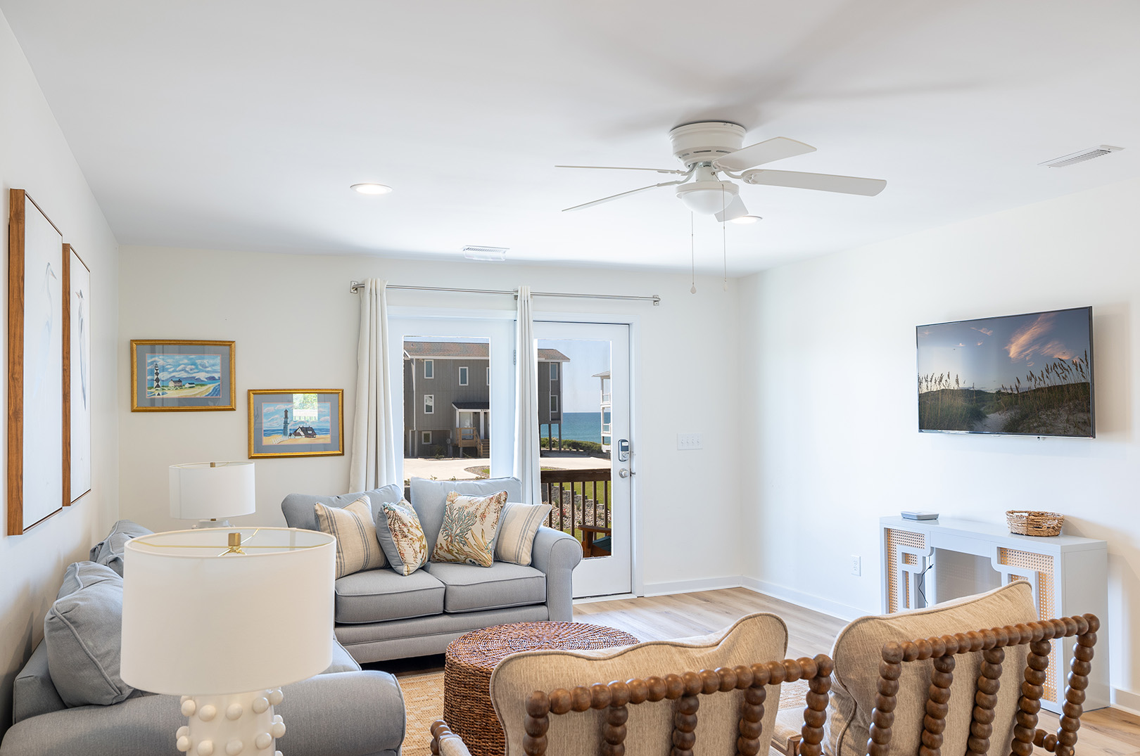 On the lower level, enjoy those views from the great room including the living, dining, and kitchen. Comfortable living area featuring LVP flooring, sofa and recliners perfect for family time, Smart TV with access to streaming apps for your shows or movies, and access to the lower level covered and open deck so you can soak in the sun and let the sound of the waves lull you into a relaxing trance. Dining area with seating for 4 + kitchen bar seating. Fully equipped kitchen includes a blender for your beachside beverage making.