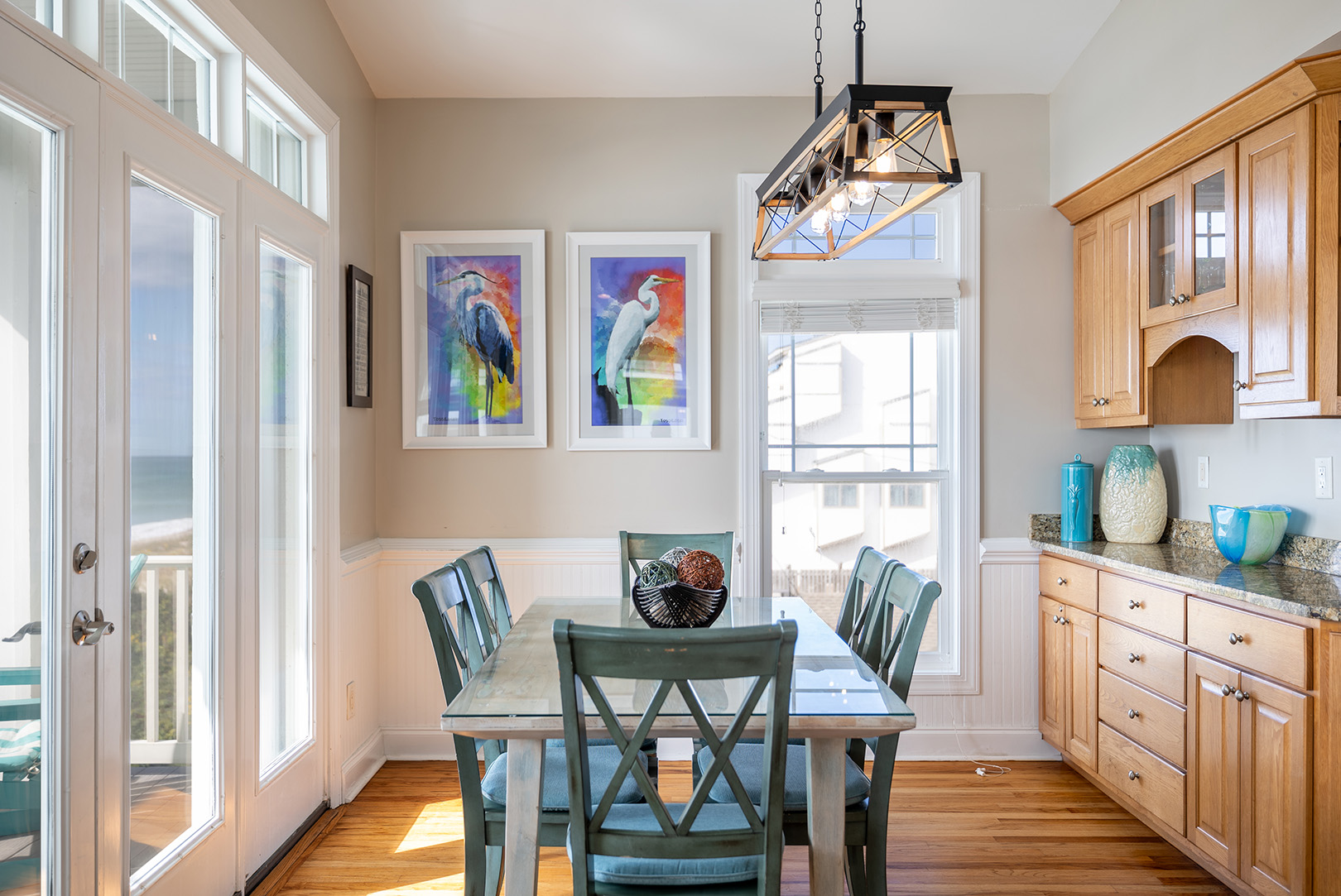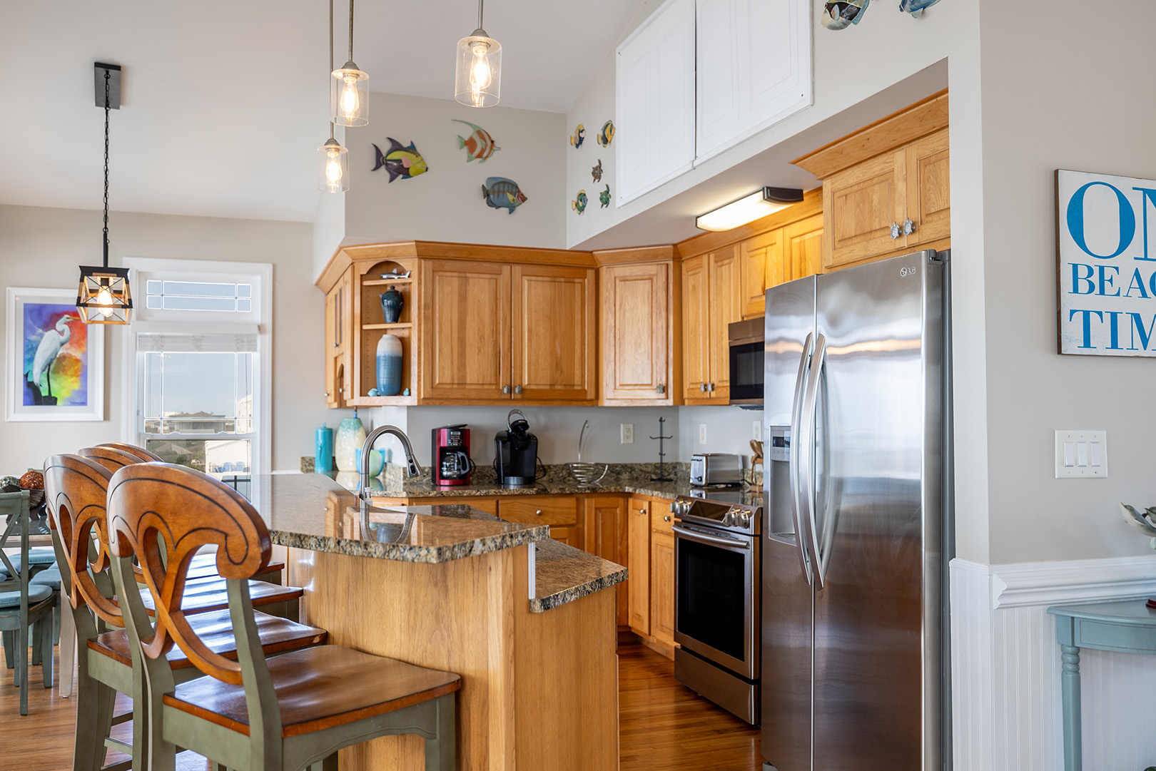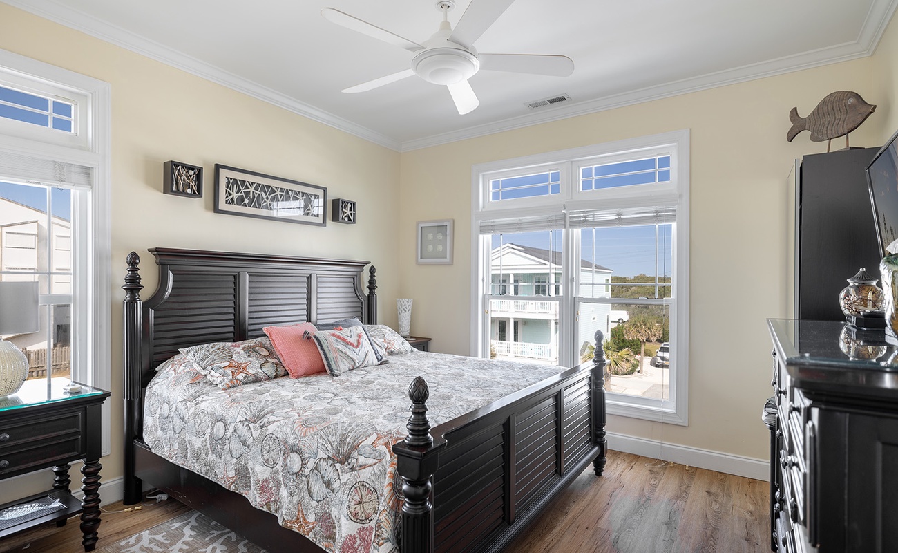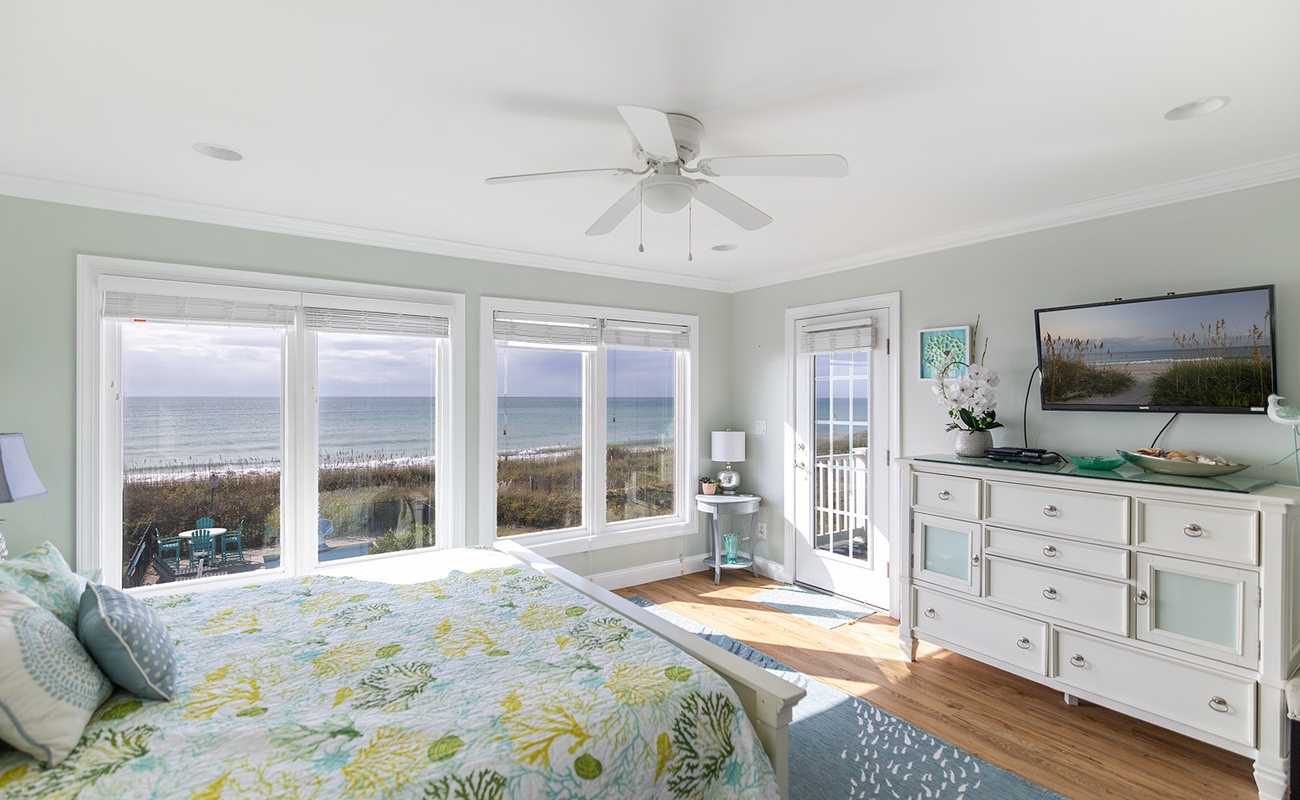 Level 3: is the main living level that host the Living Room, Dining Area, Kitchen and Bar, the 4th Bedroom and an expansive covered Oceanfront deck. The open concept Living area is situated directly in-front of huge windows overlooking the beach. A Flat Screen TV is available for your pleasure. The Kitchen is equipped with high-end appliances, a bar for additional seating for 4, expansive countertops, and plenty of storage and working space. Located directly off the Kitchen and Bar is the Dining area, giving your group ample seating for your home cooked meals. The Dining area, comfortably accommodating eight, has a gorgeous backdrop of the beautiful Pine Knoll Shores. Bedroom #4 is directly off the Main Living Area and offers a King Bed, Flat Screen TV.