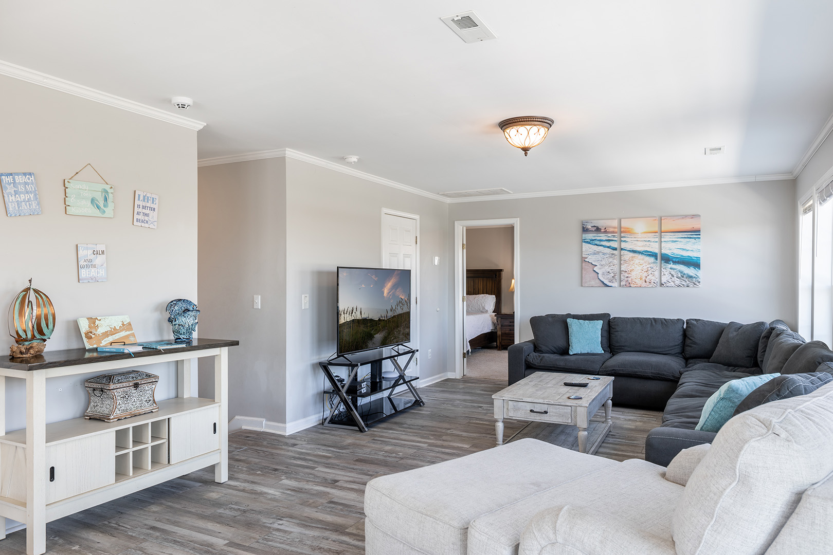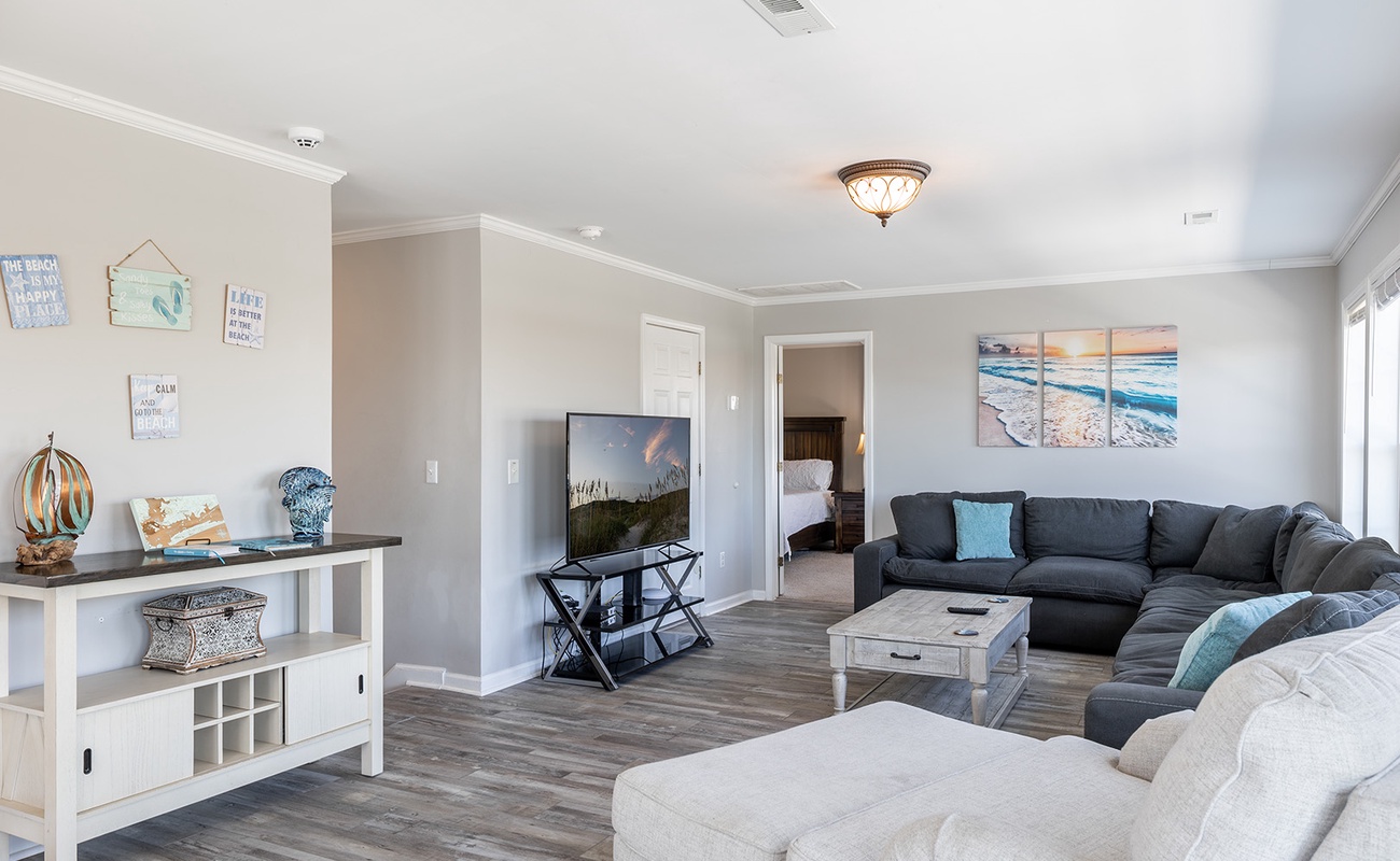 Enjoy the expansive great room with living area providing a Smart TV with premium cable and access to streaming apps including Hulu, Netflix, and Amazon Prime Video; dining area with ample seating for your group; and Fully Equipped Kitchen with Stove/Oven, Refrigerator with Attached Ice Maker, Microwave, Dishwasher, Coffee Maker, Keurig Coffee Maker with Complimentary Coffee Pods, and Blender. Take advantage of the complimentary WIFI to keep in touch with family and friends while on vacation. Step out to the deck areas complete with furniture to enjoy the seaside sights and sounds! Bedroom #1 is a Master Bedroom with King Bed featuring an adjustable base and cooling memory foam mattress, Smart TV, and Private Full Bath. Shared Half Bath additionally on this level. Washer/Dryer on this level.